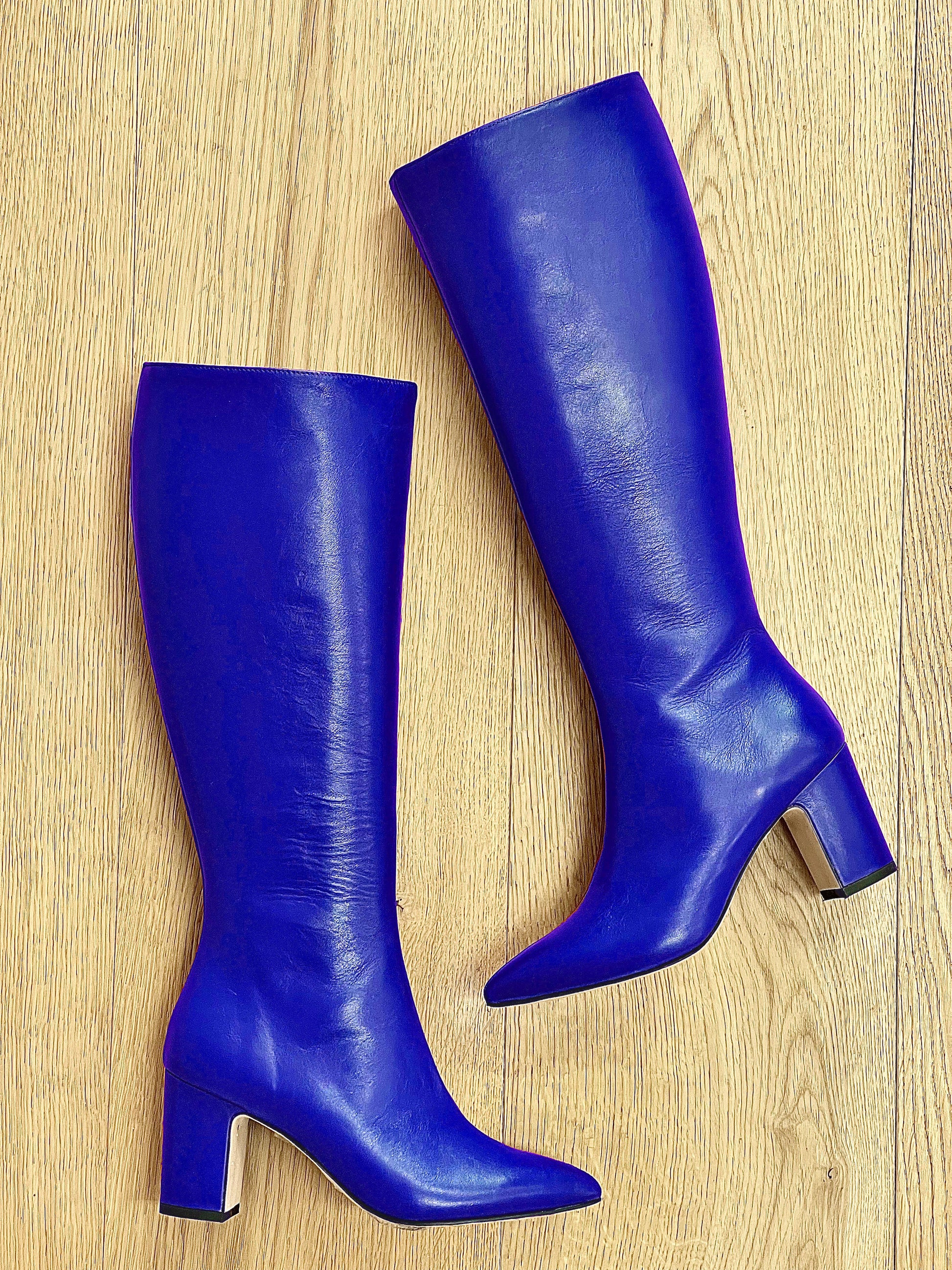 Spitz zulaufende Lederstiefel mit 75 mm breitem Absatz.
