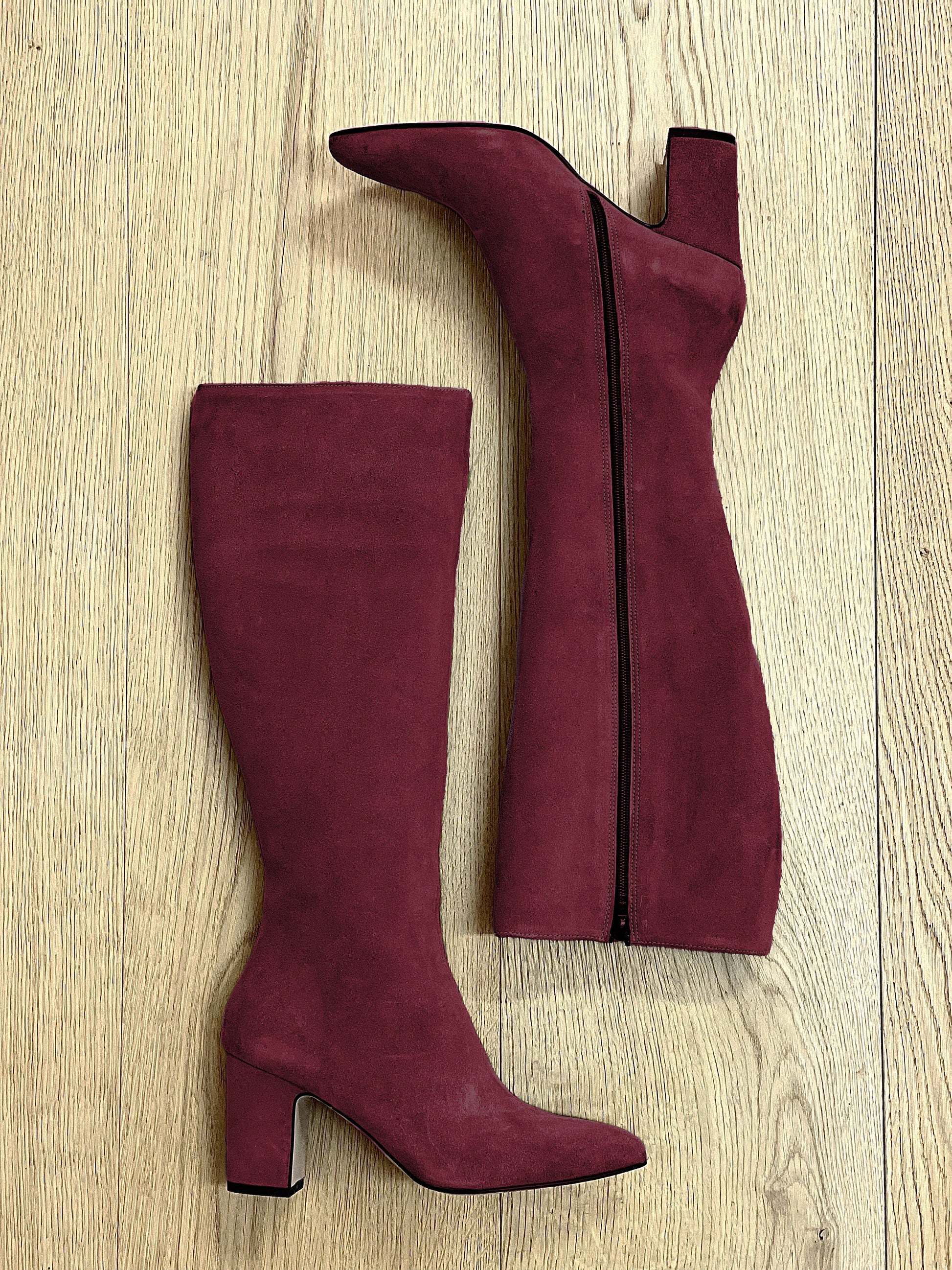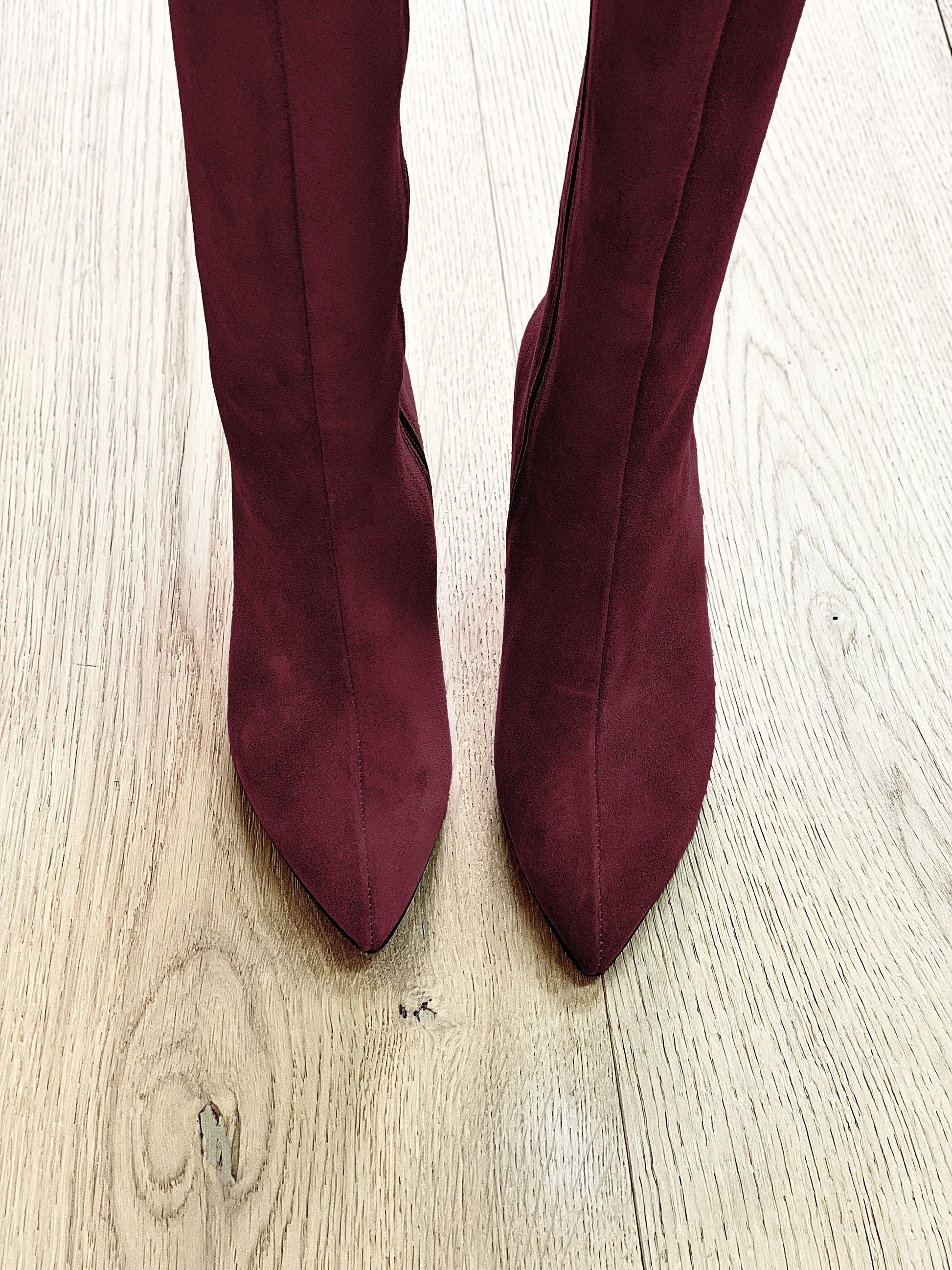 Spitz zulaufende Stiefel aus Wildleder mit breitem Absatz.