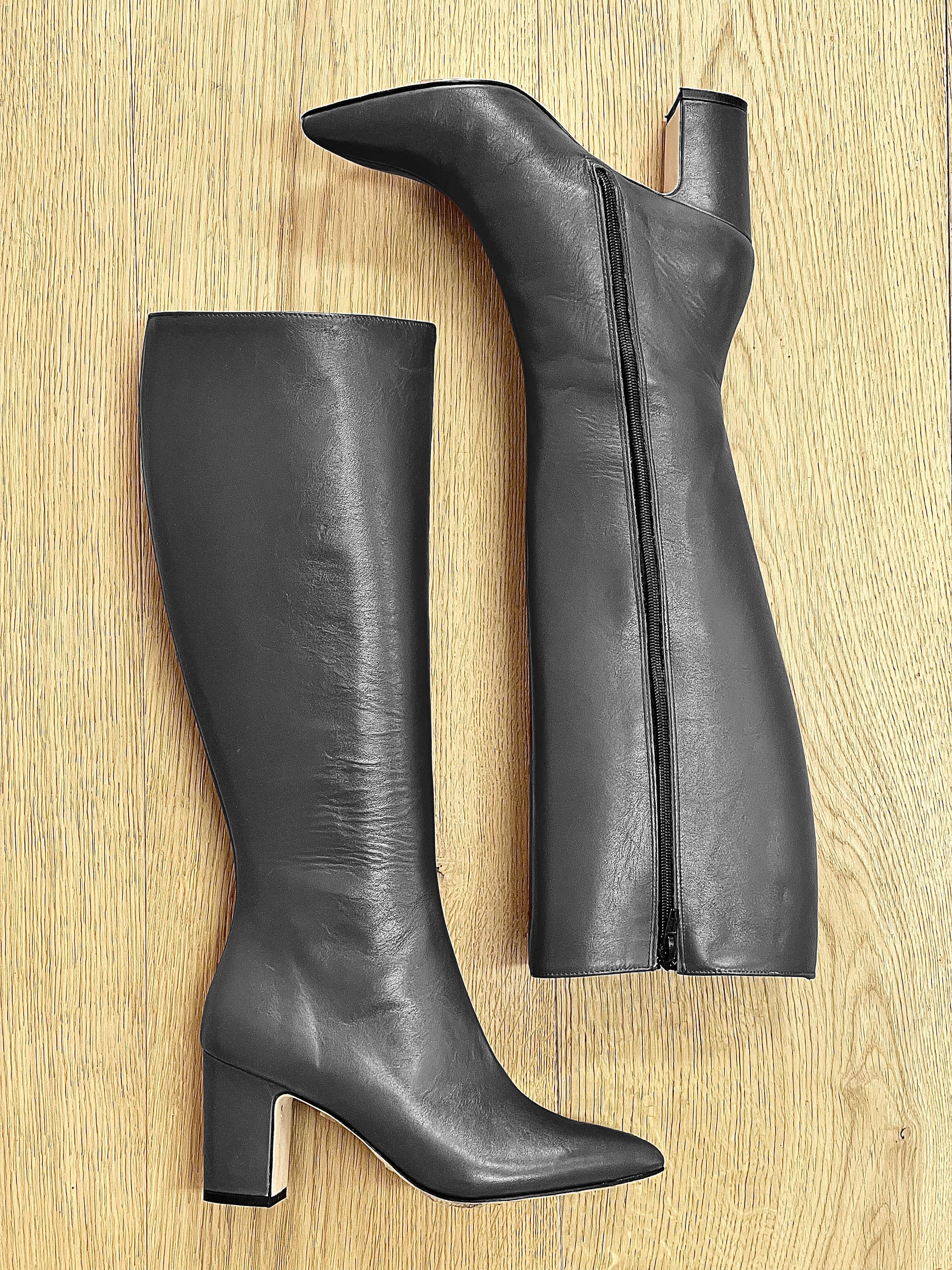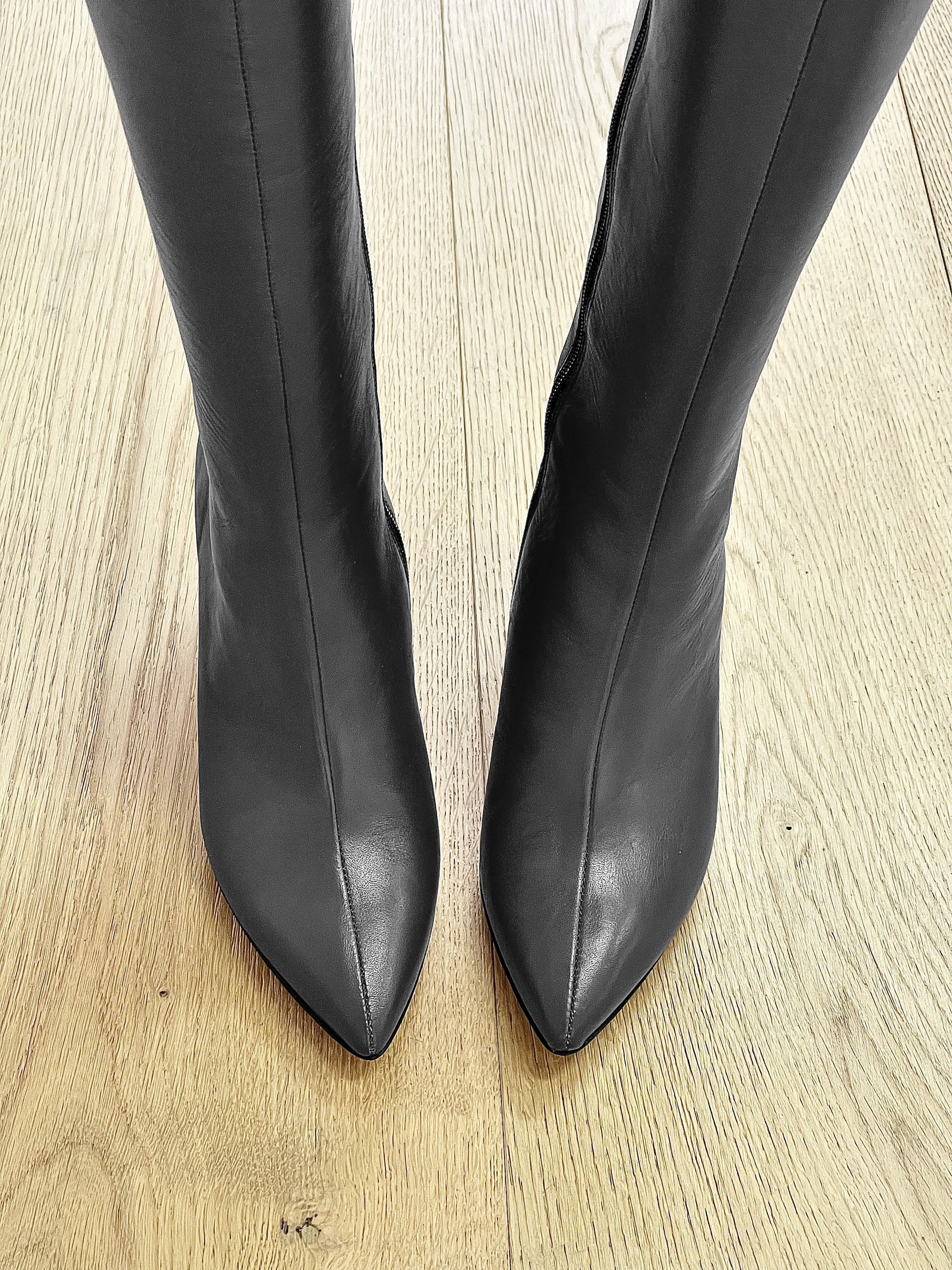Spitz zulaufende Lederstiefel mit breitem Absatz.
