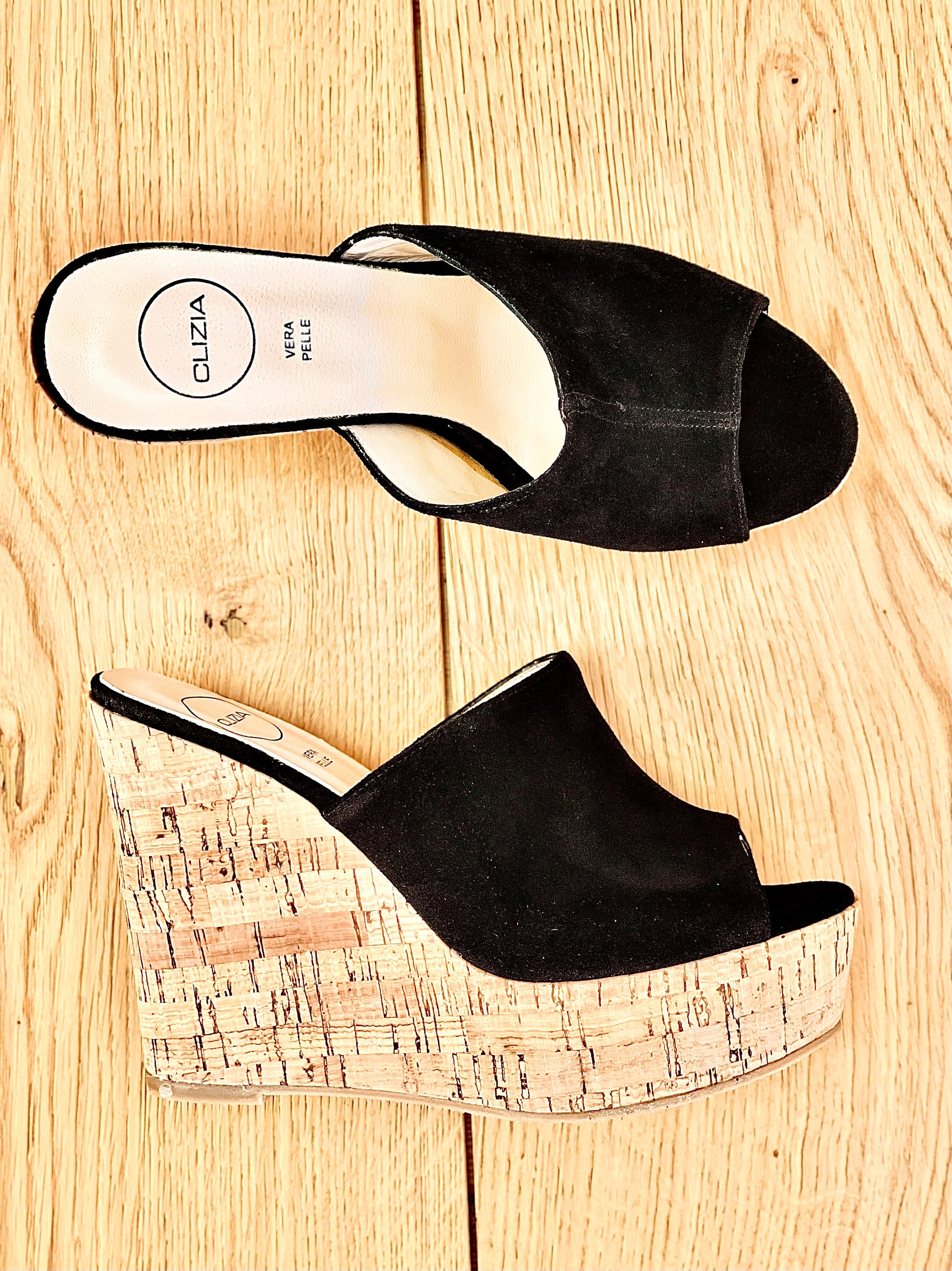 Hohe Sandalen aus Wildleder mit Naturkork-Keil.