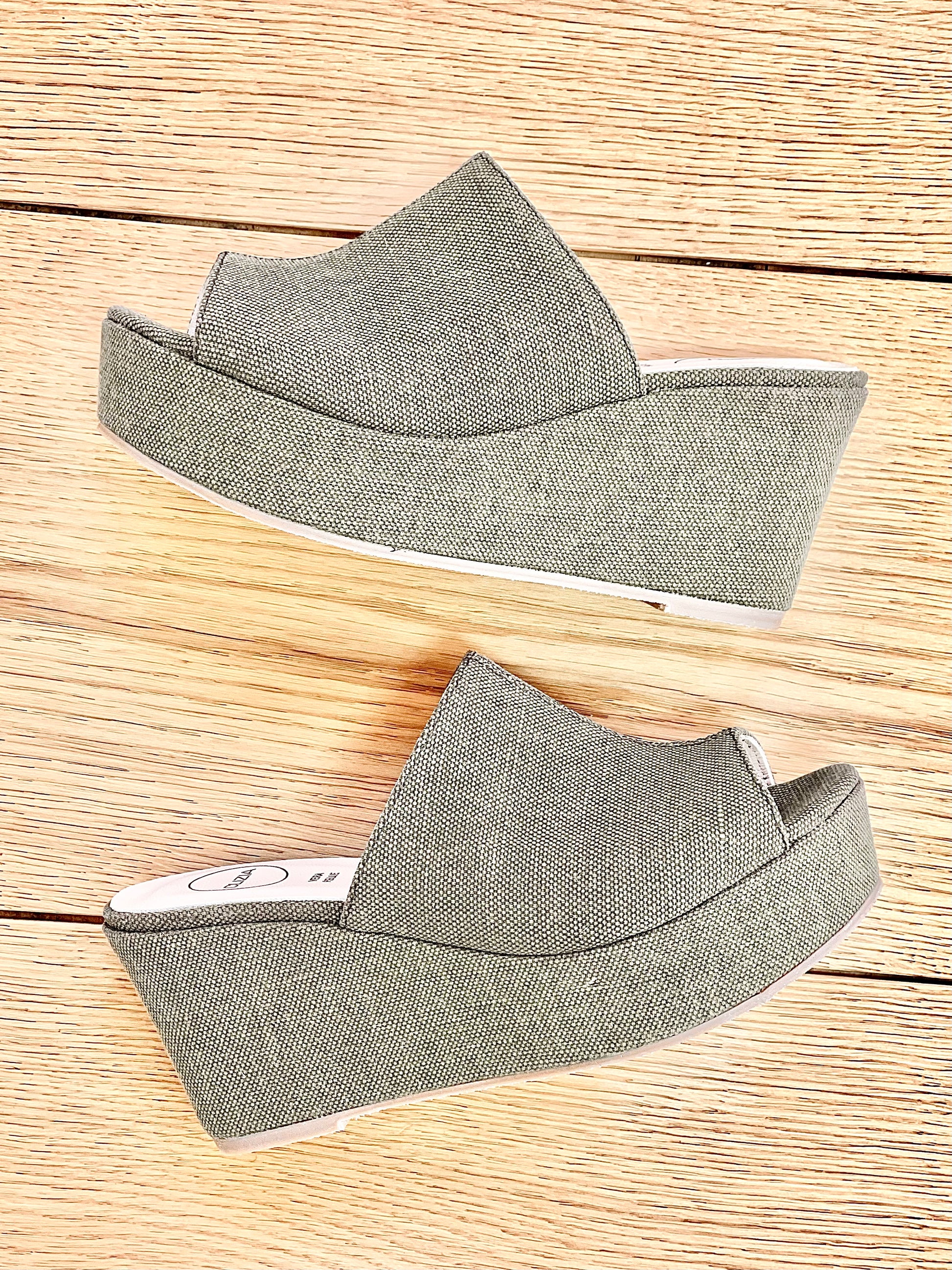 Khakigrüne Canvas-Sandalen auf 8cm Keil.