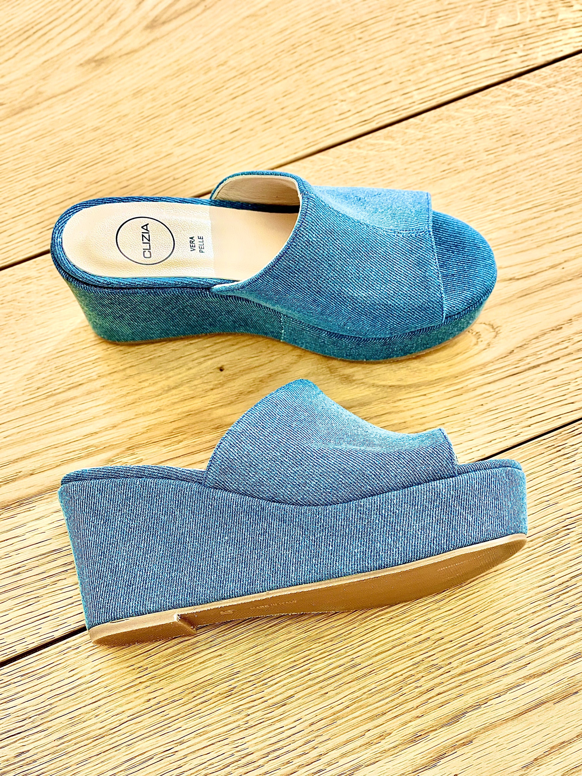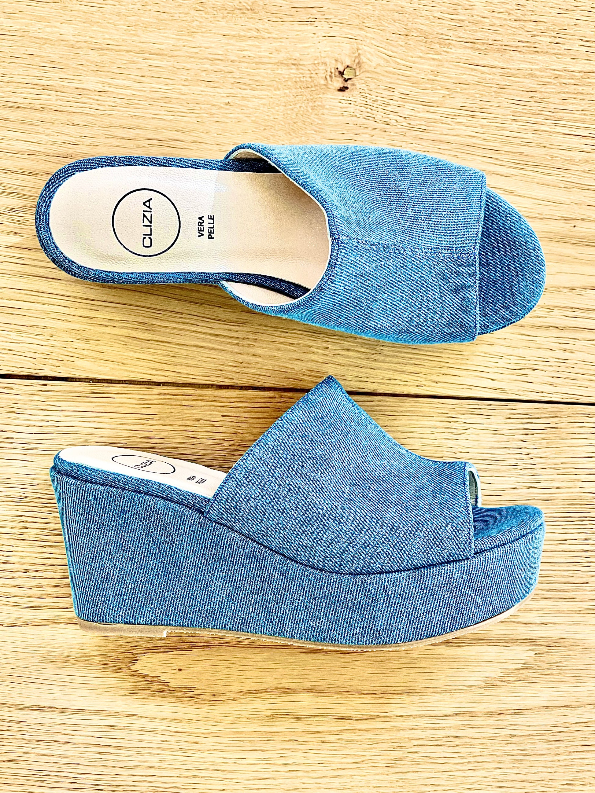 Denim-Jeans-Sabot-Sandalen auf 8cm-Keil.