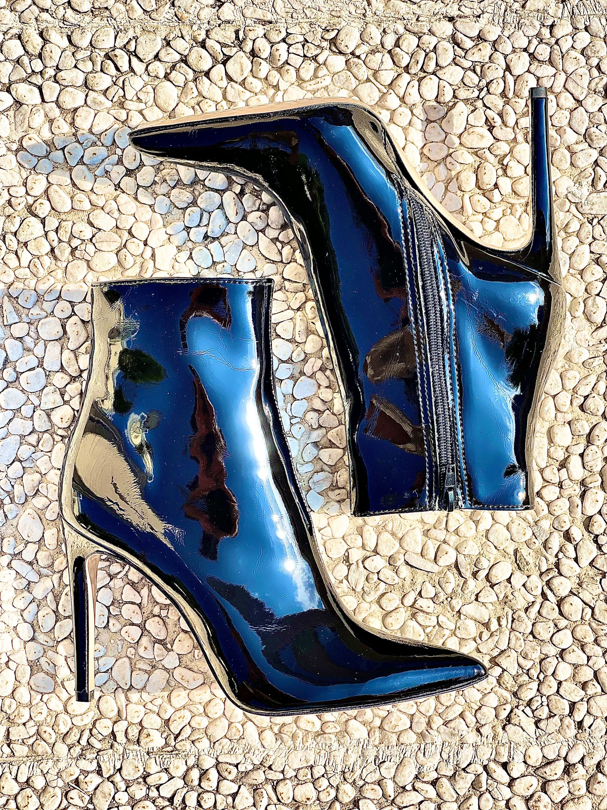 Spitz zulaufende Stiefelette aus Lackleder mit hohem Stilettoabsatz.
