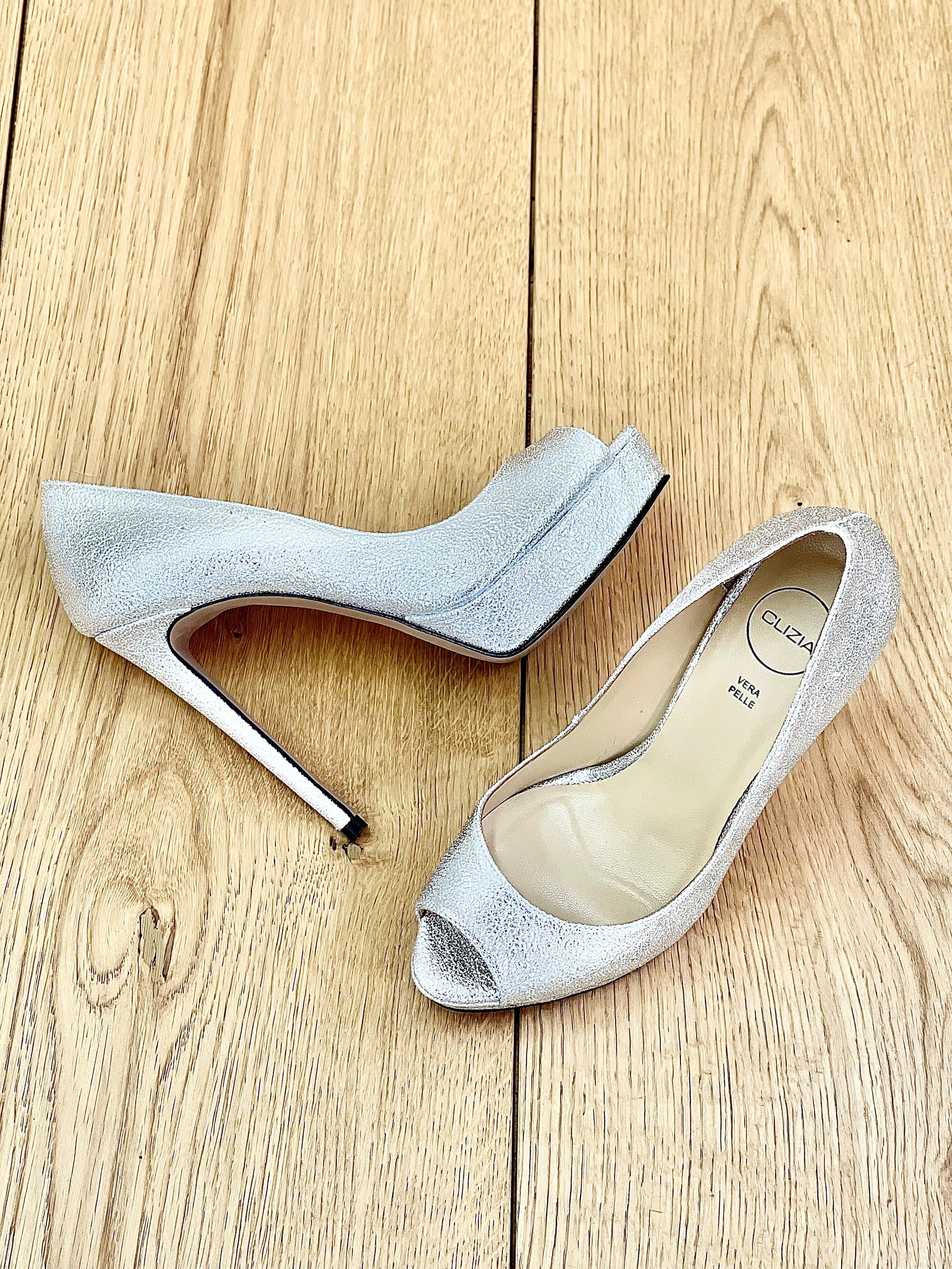 Peep-Toe-Pumps mit 12 cm hohem Stilettoabsatz und 2 cm Plateau.