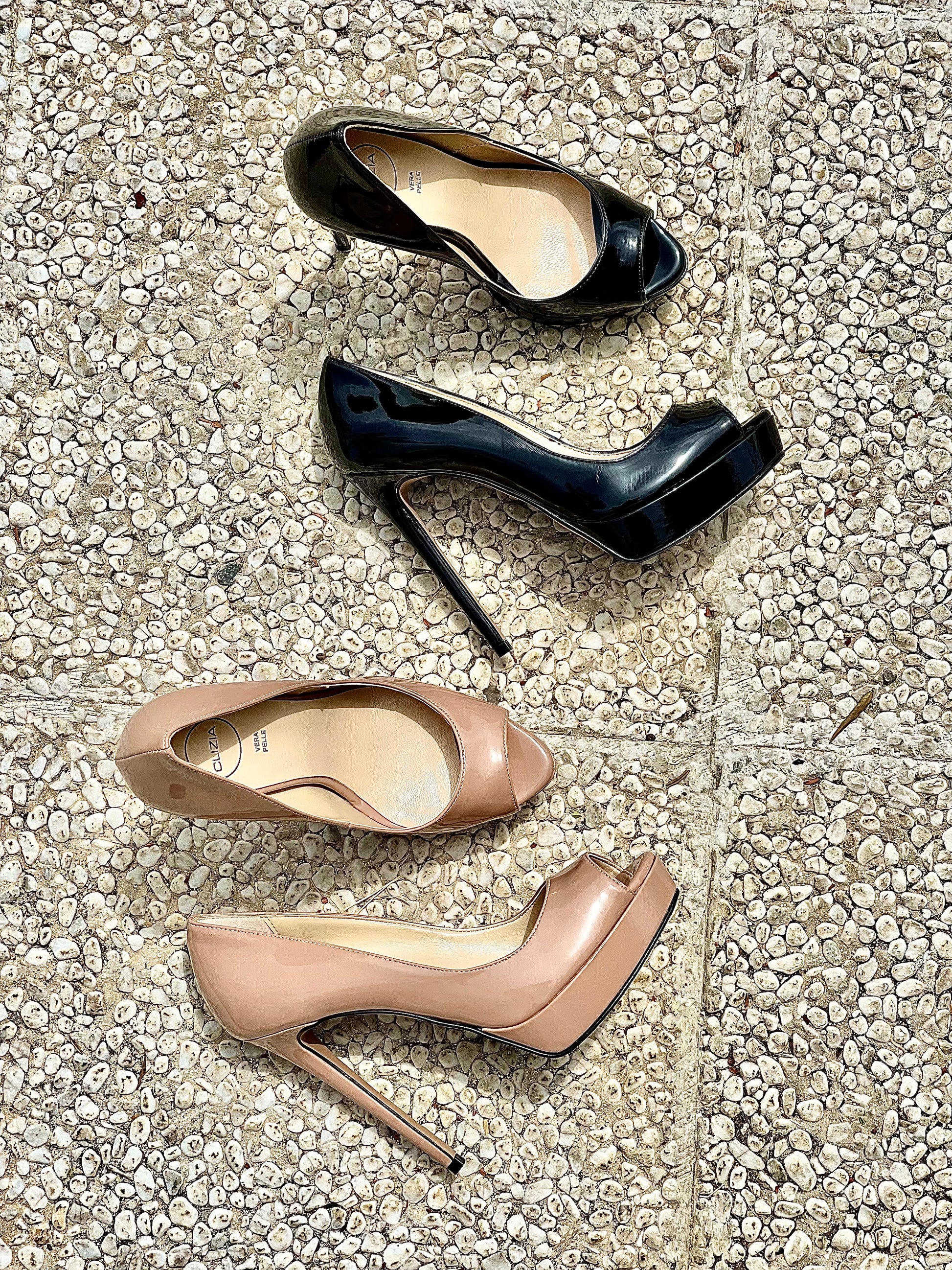 Zehenoffene Pumps aus Lackleder mit 12 cm hohem Stilettoabsatz und 2 cm Plateau.