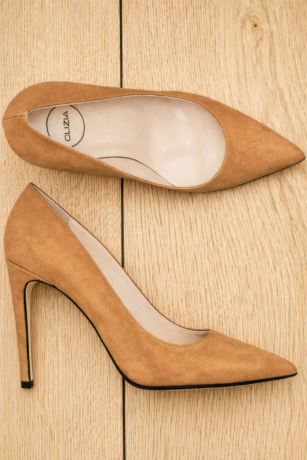 Pumps mit hoher, spitzer Zehenpartie und schmalem Absatz.