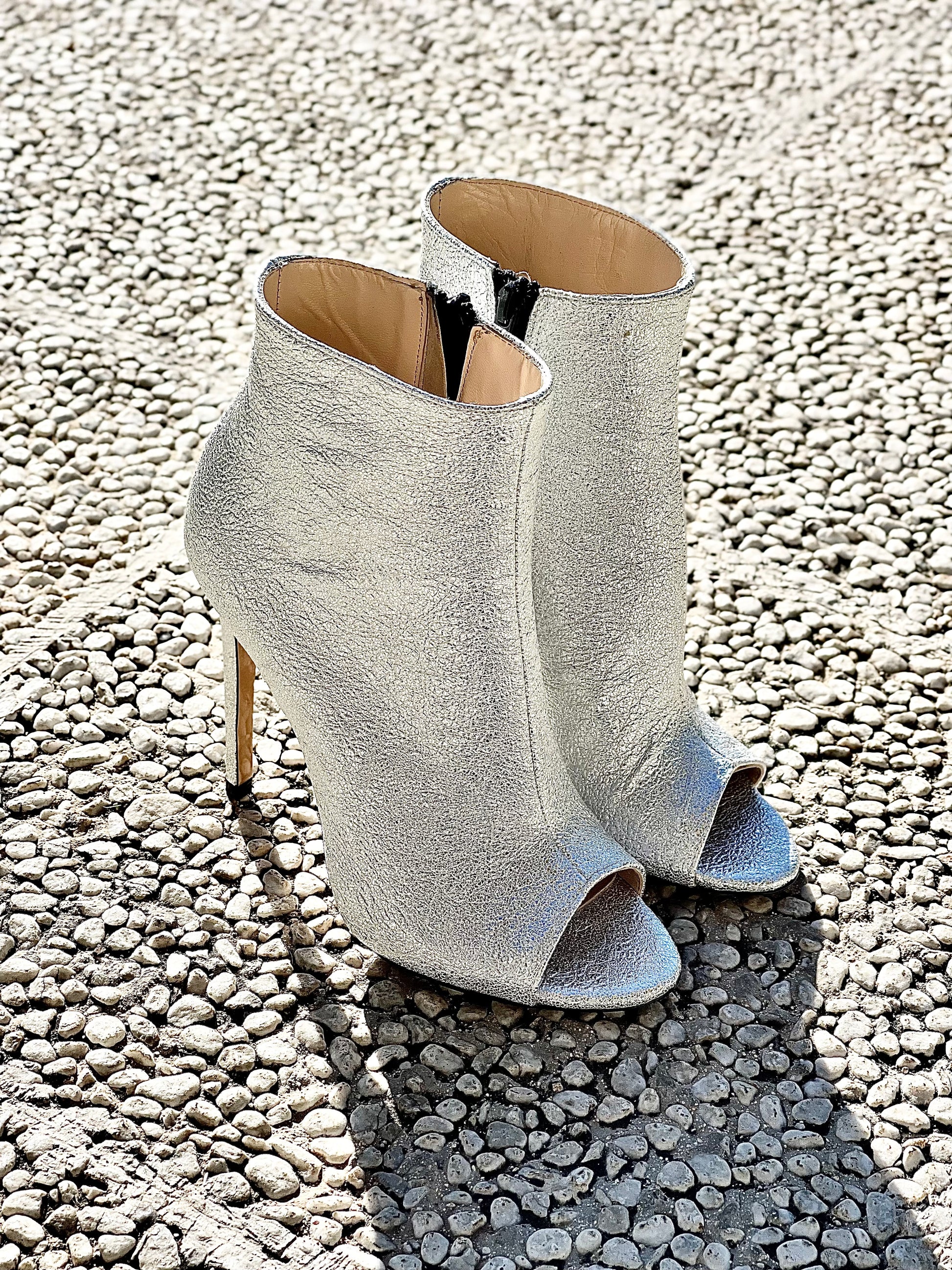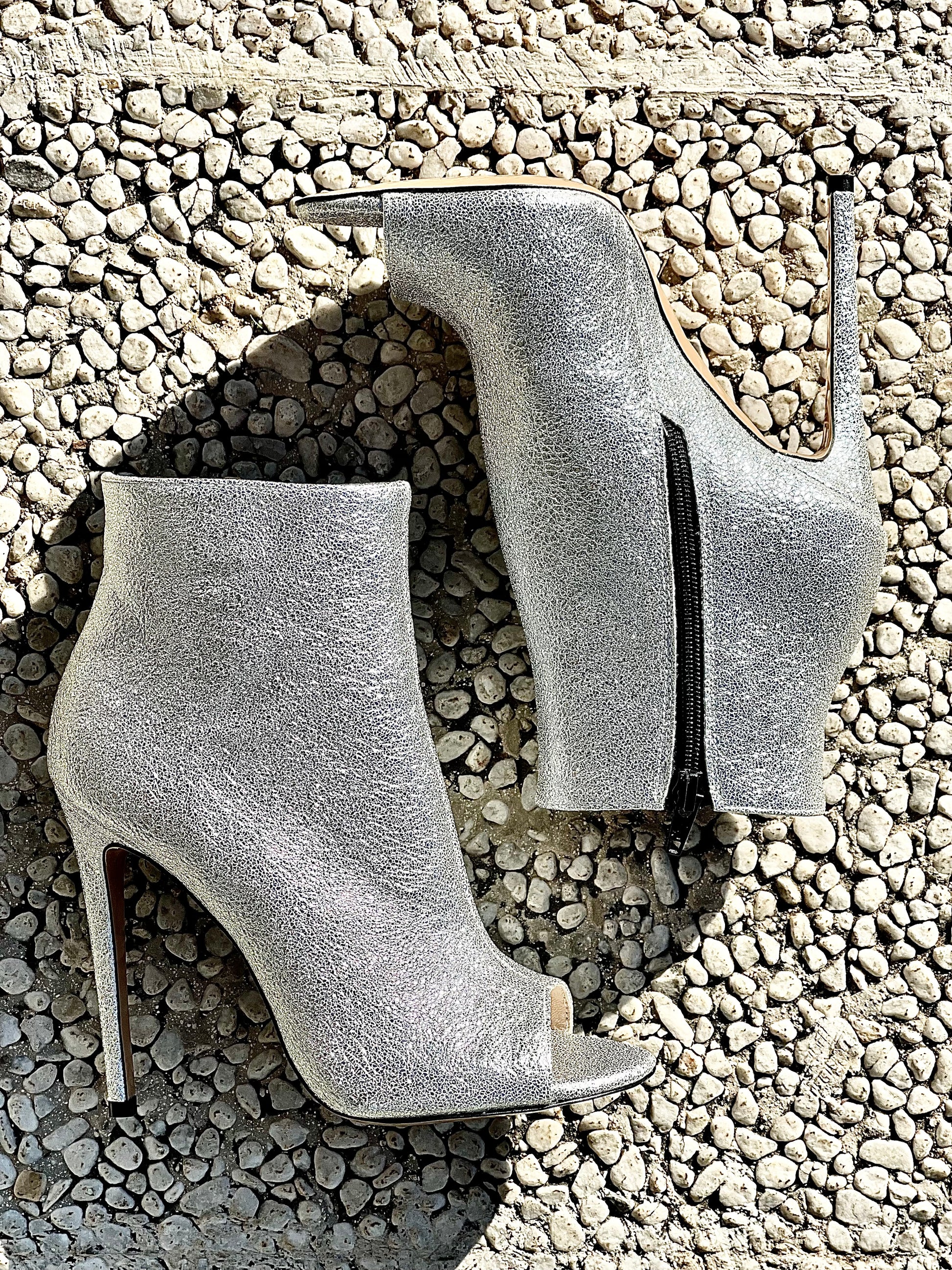 Laminierte Stiefelette mit 12 cm hohem Pfennigabsatz.