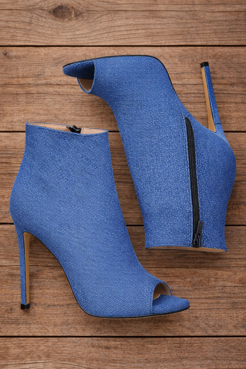 Offene Denim-Stiefelette mit 12 cm Absatz.
