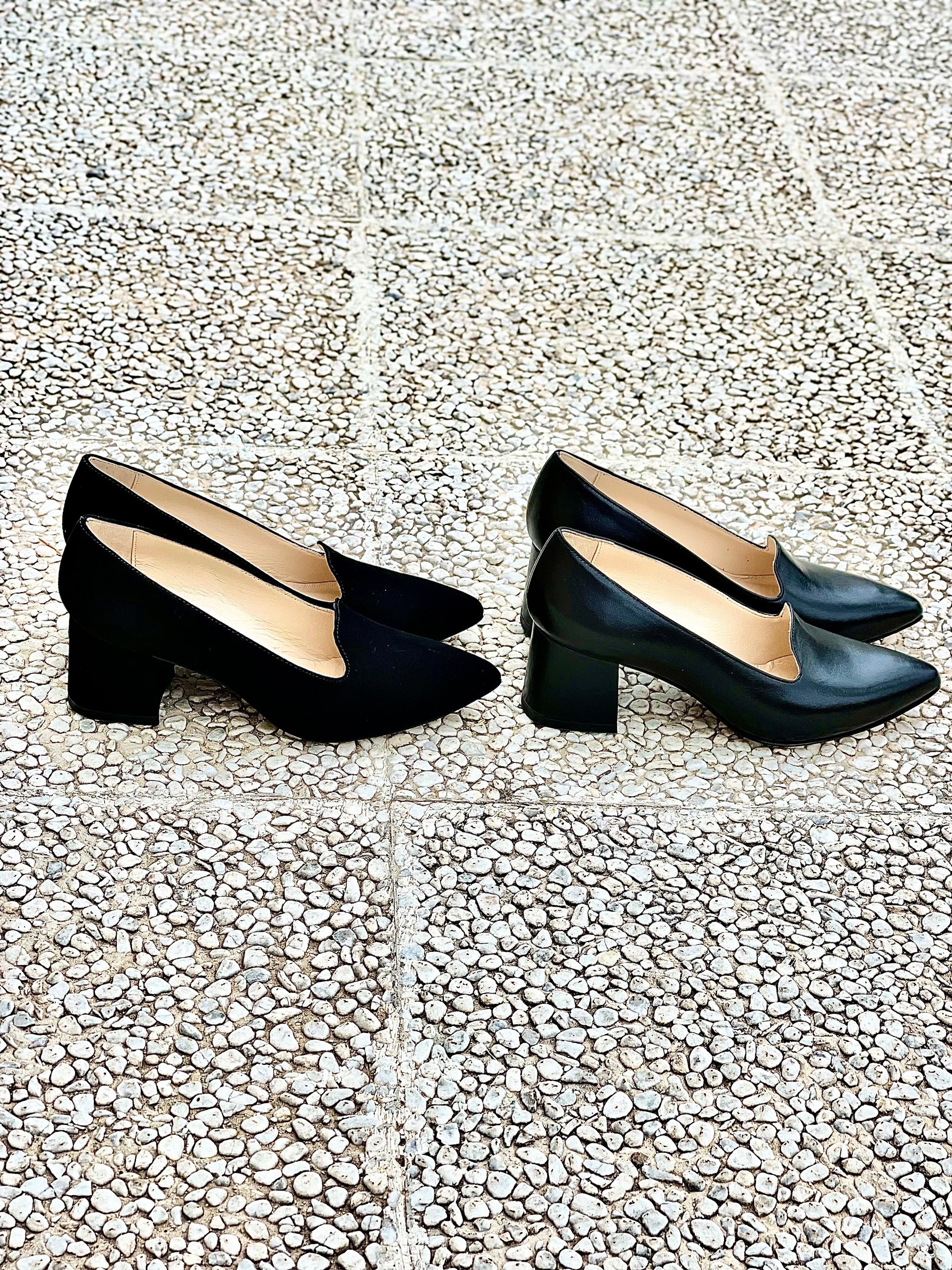 Spitz zulaufender Slipper mit 55 mm breitem Absatz.