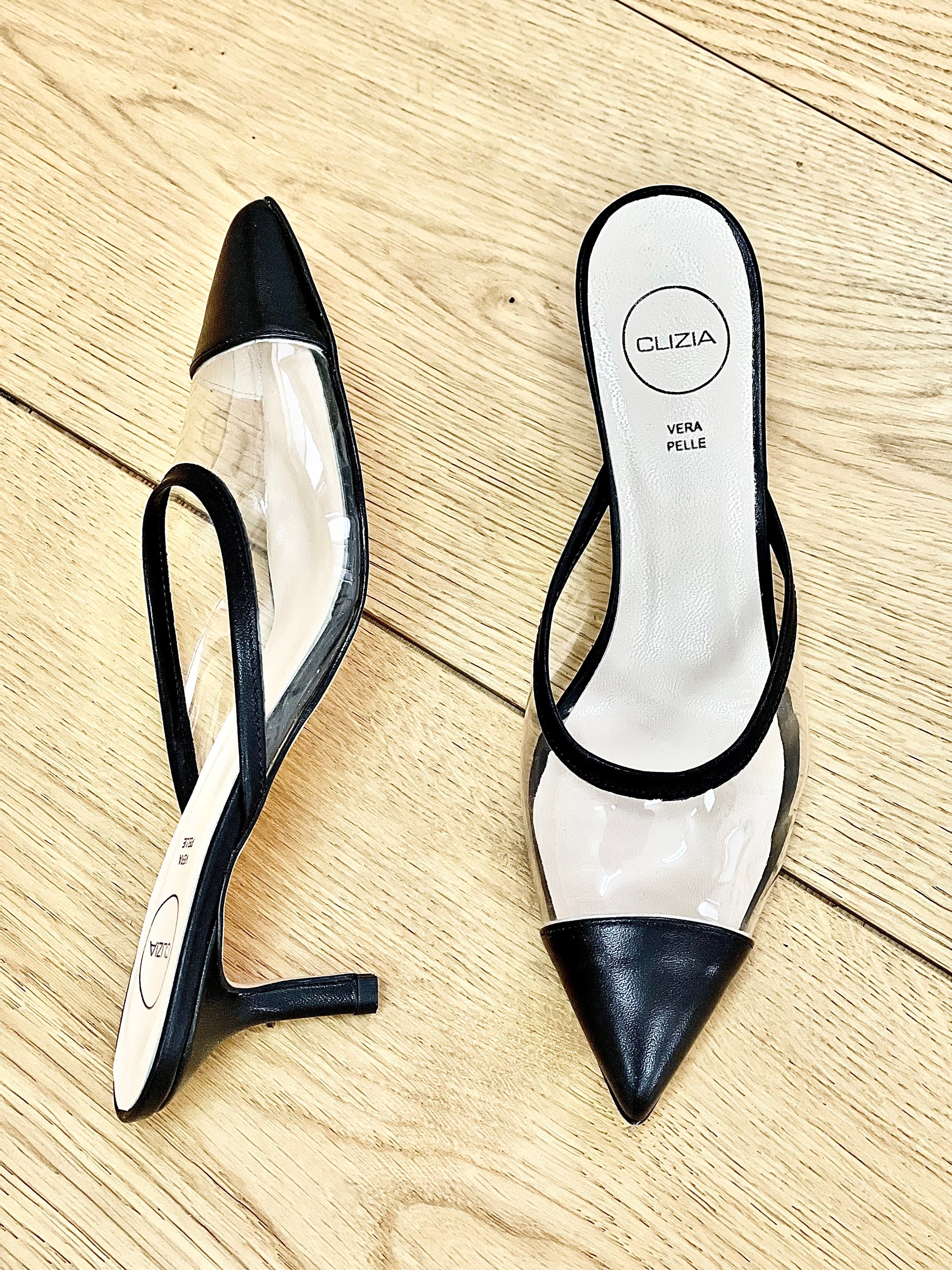 Schlupfstiefel aus Pvc mit Zehenkappe aus Leder, Absatz 6 cm.