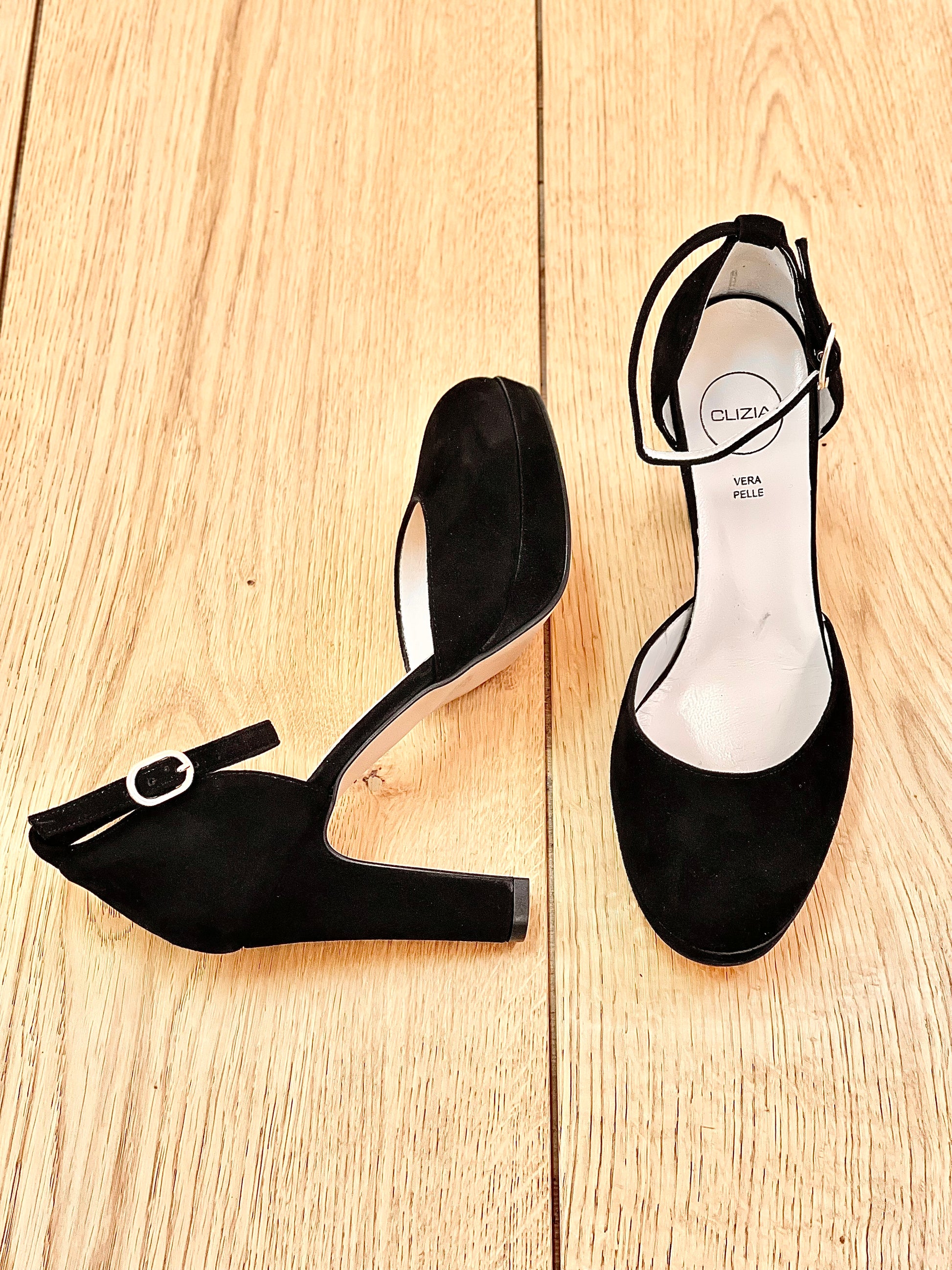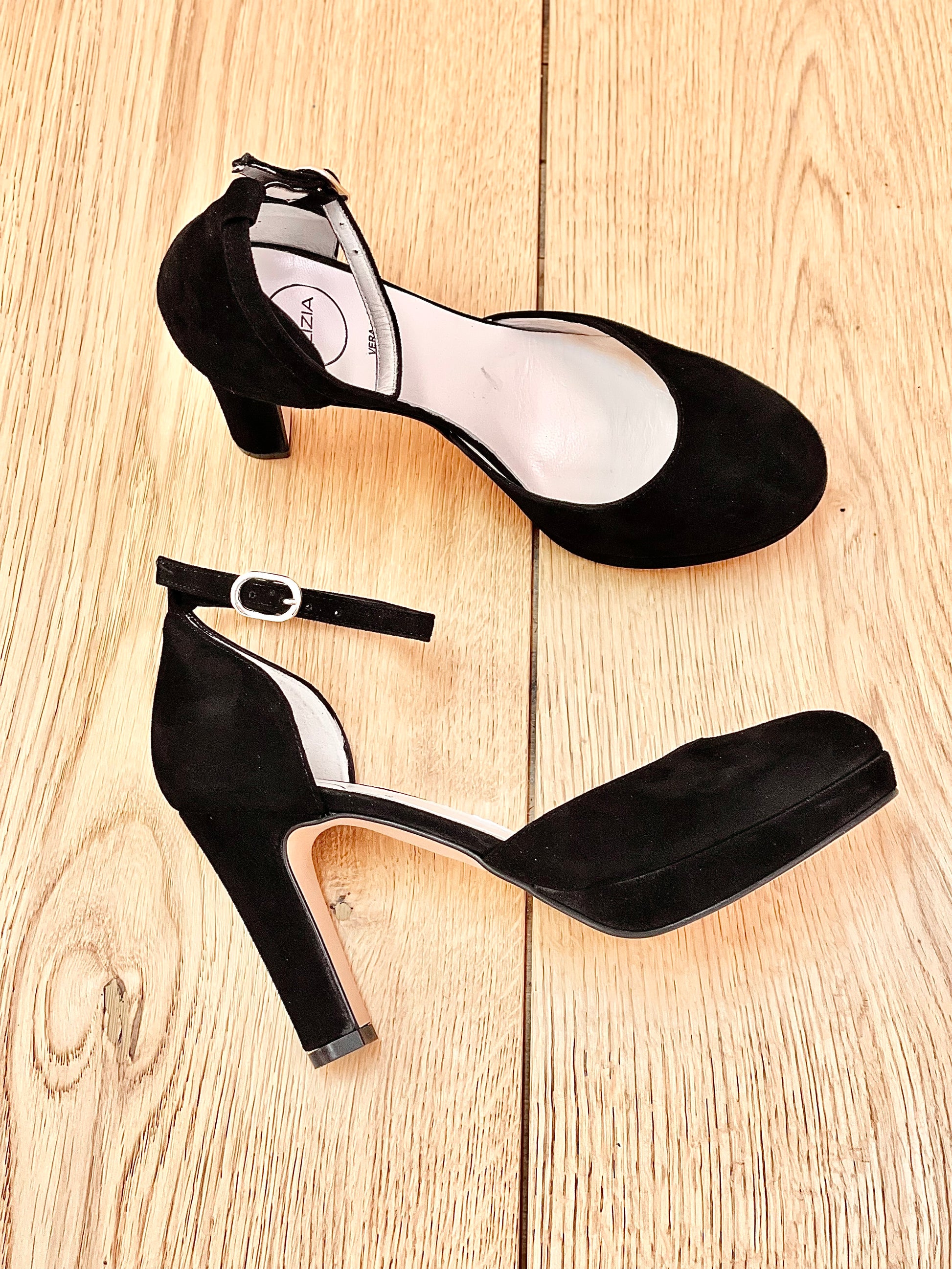 Runde Spitze und Fersendekolleté aus Wildleder mit 9cm Absatz und 1cm Plateau.