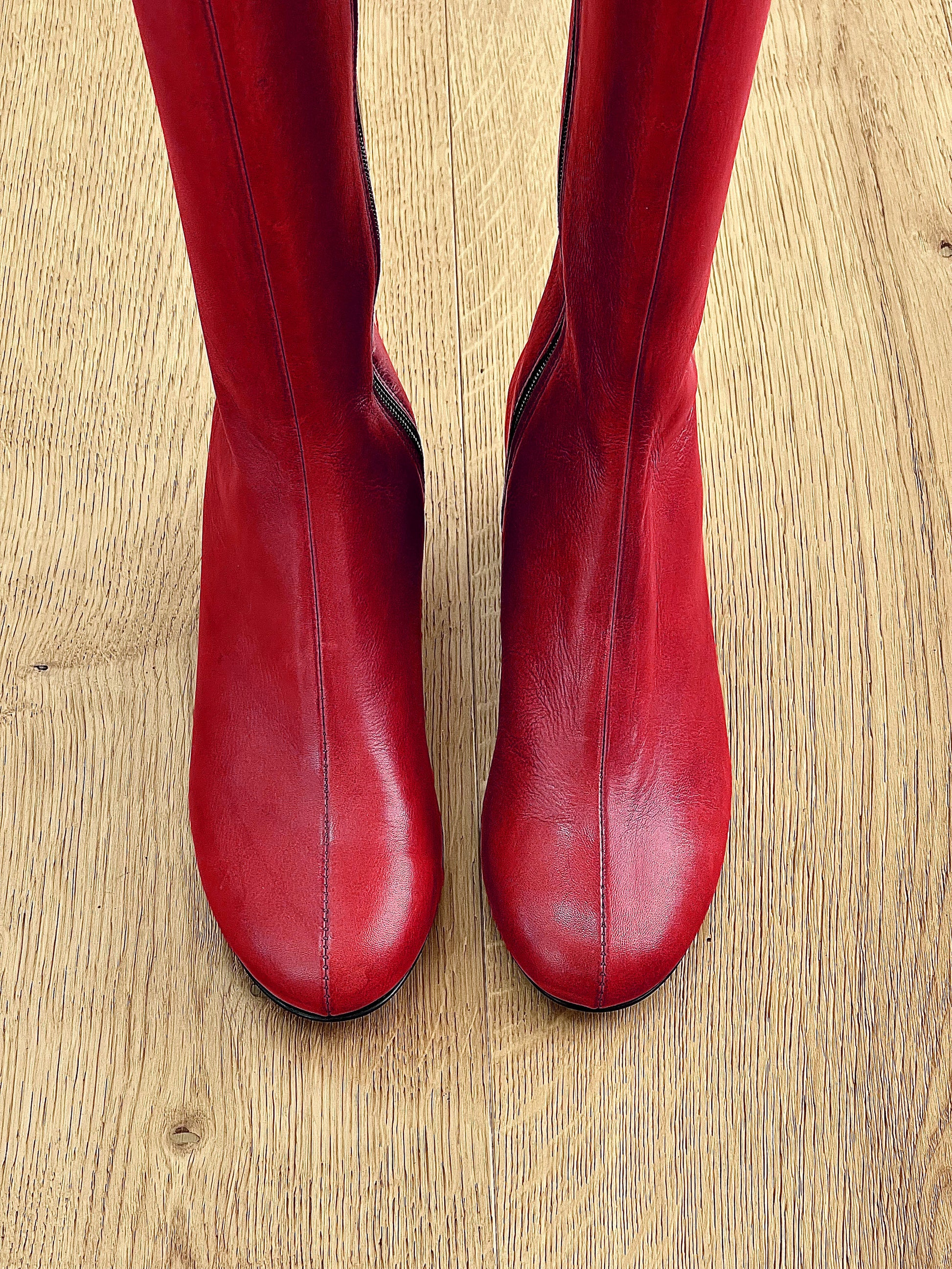 Stiefel aus Leder mit breitem Absatz und runder Spitze.
