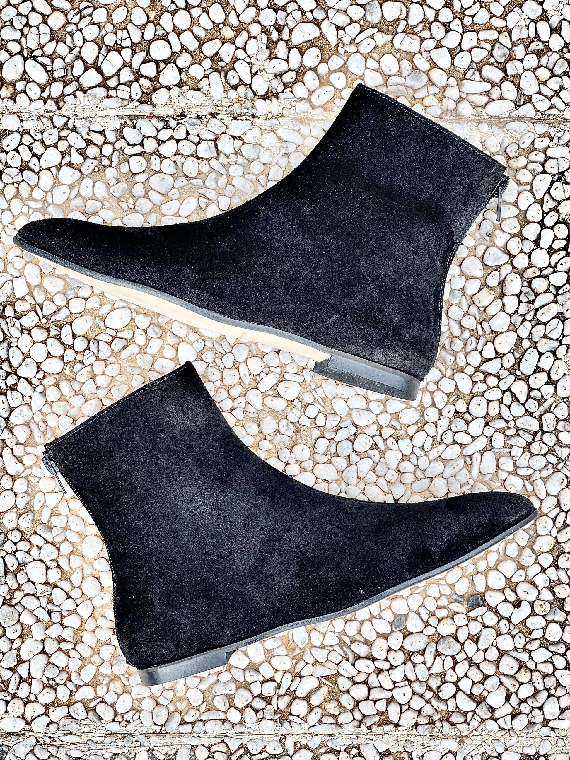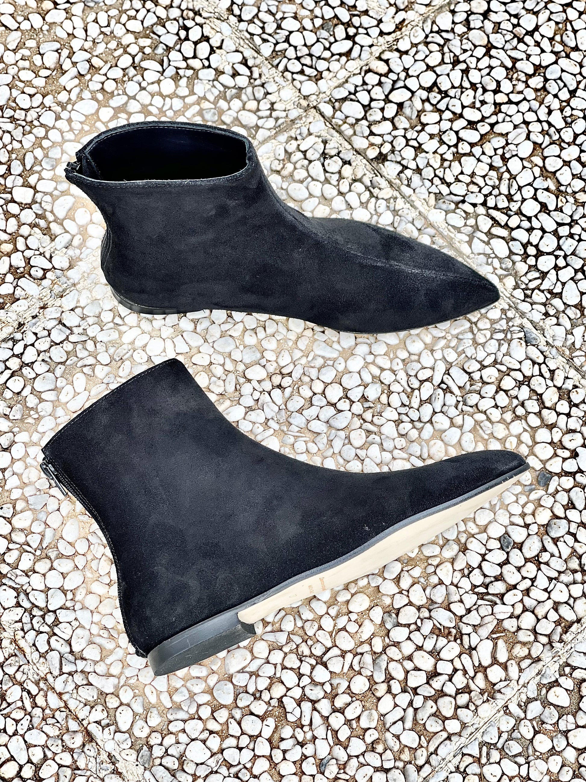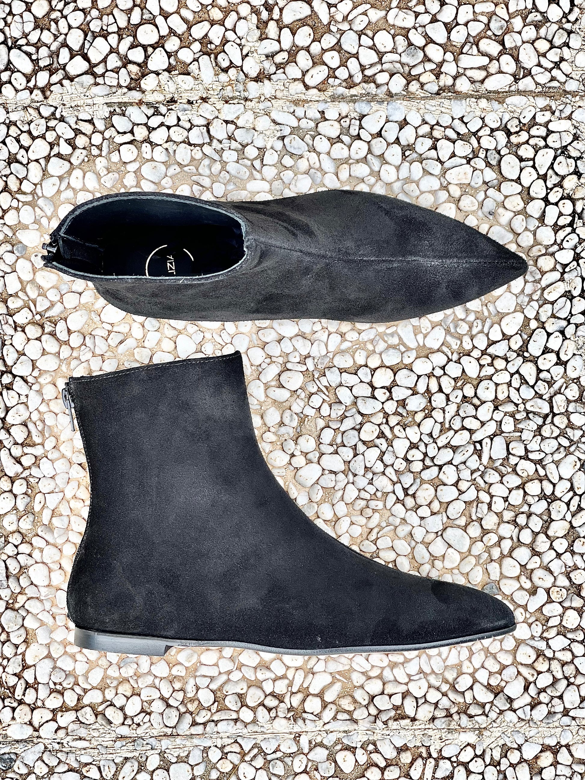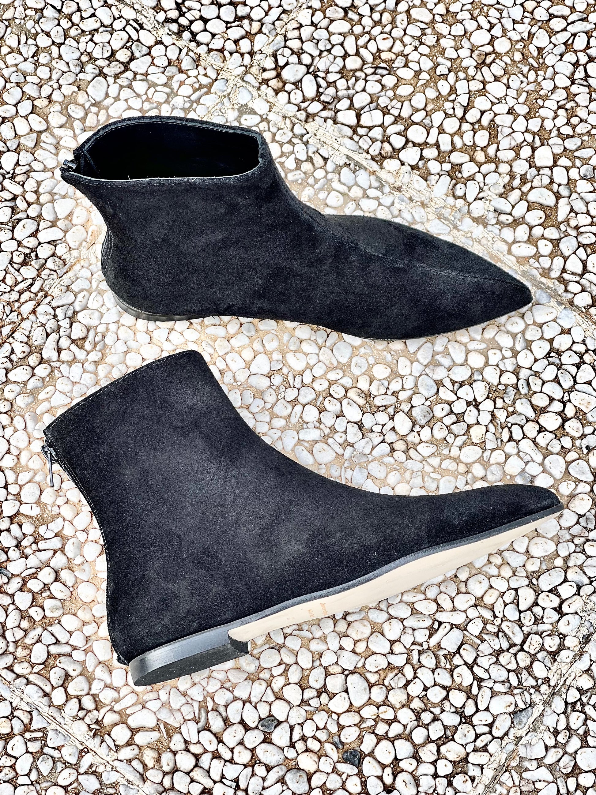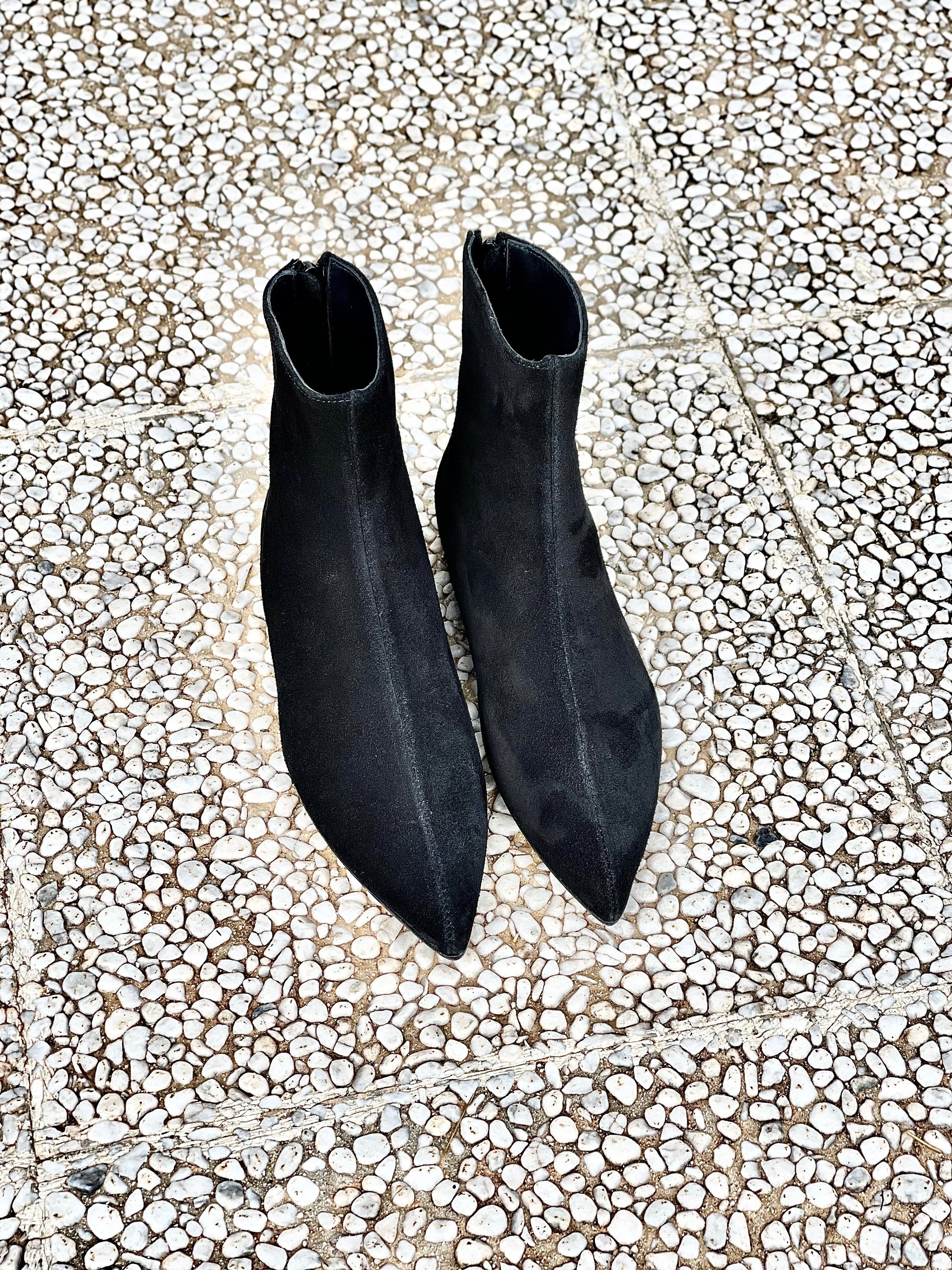 Spitz zulaufende Stiefelette aus Wildleder, Absatz 1cm. mit Reißverschluss hinten.