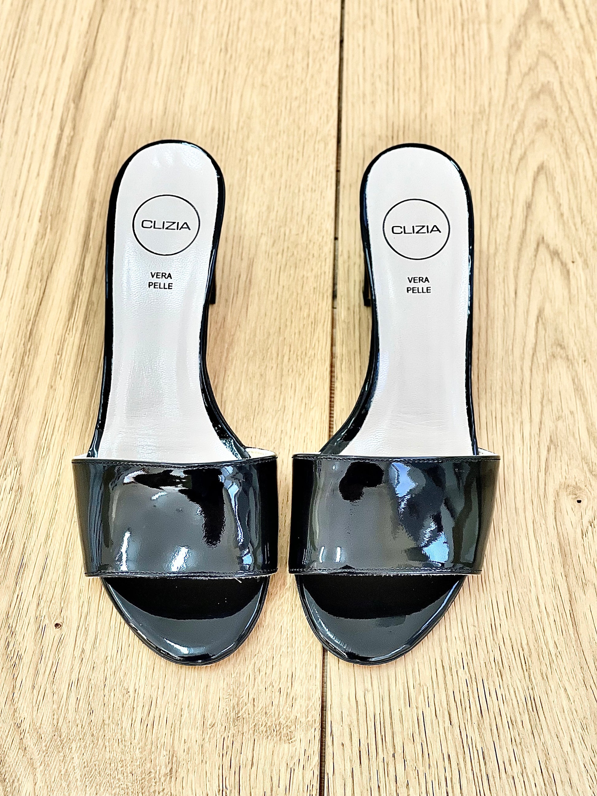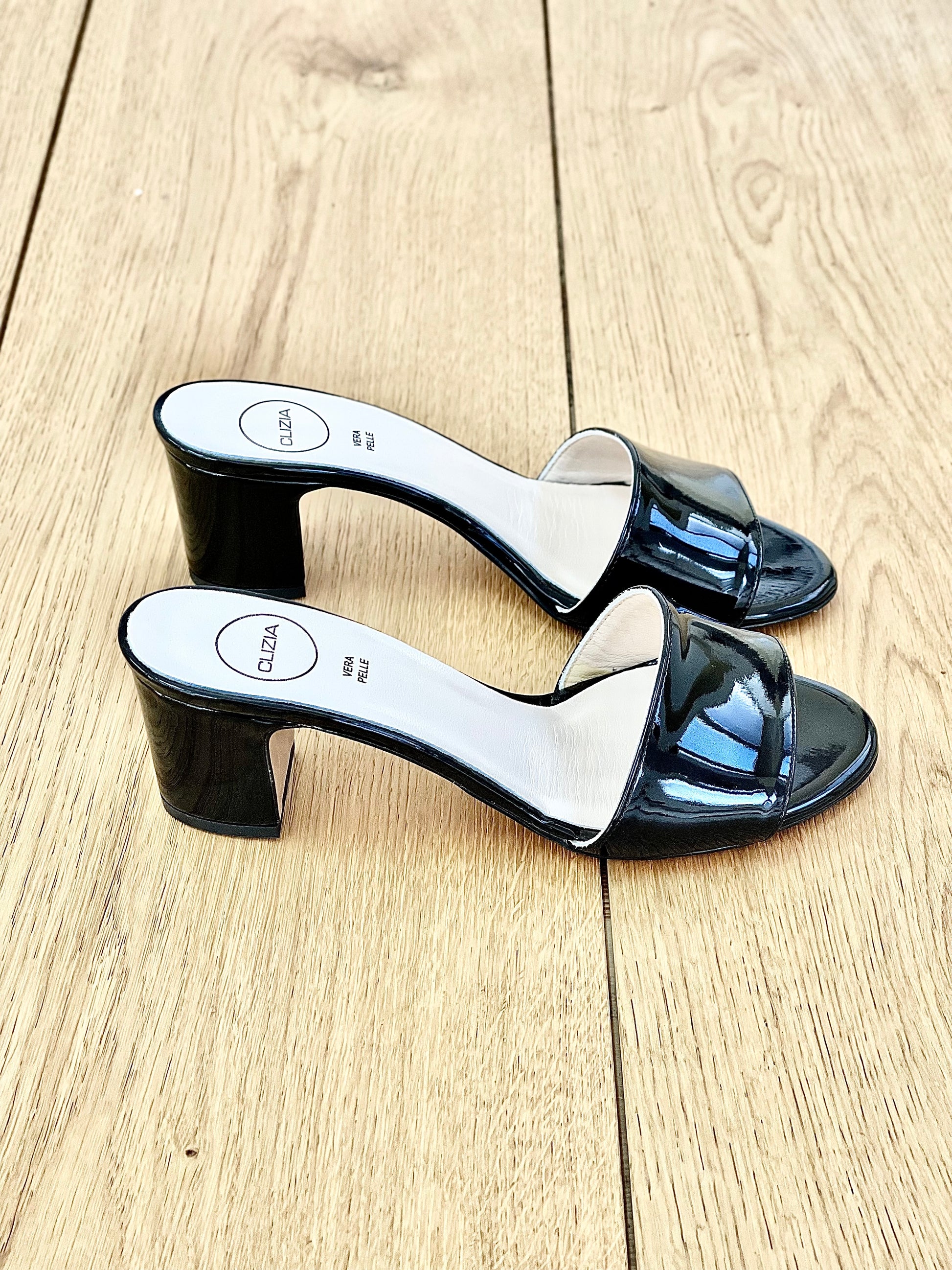 Niedrige Pantoletten-Sandalen aus Lackleder mit breitem Absatz.