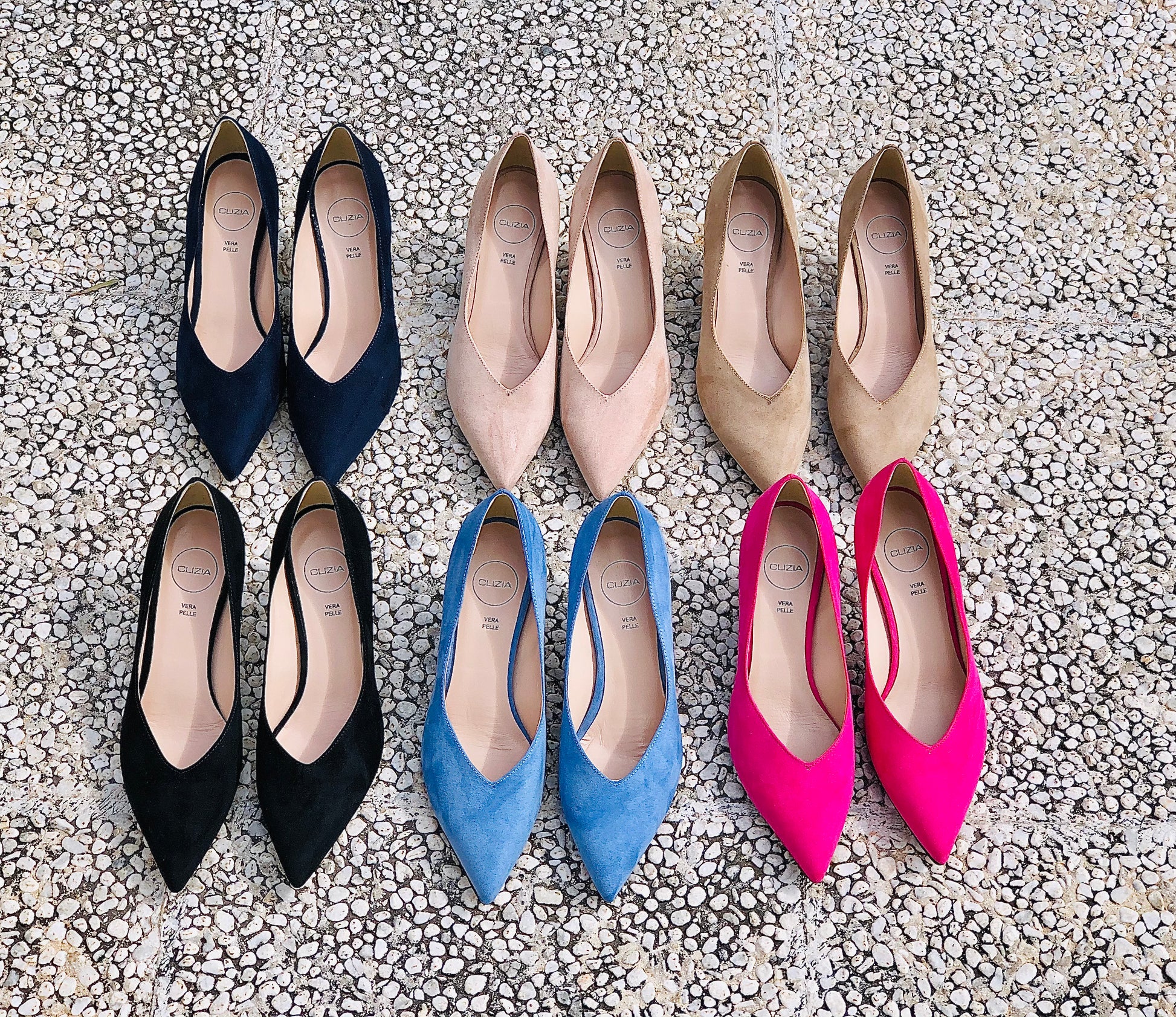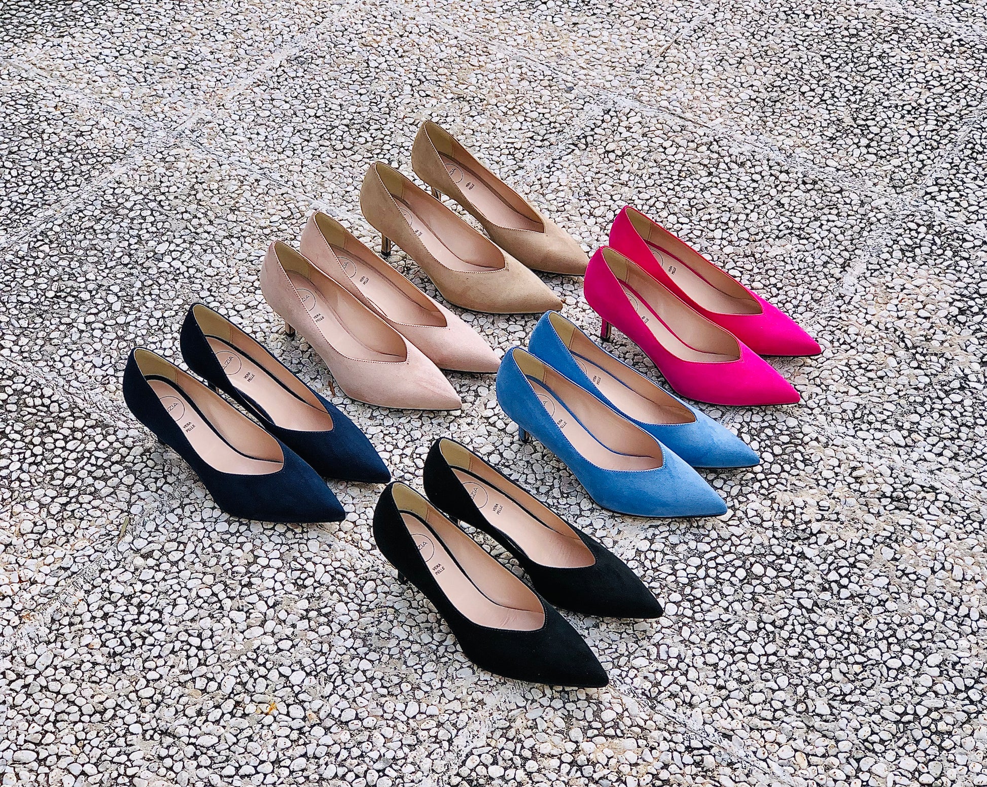 Spitz zulaufende Wildlederpumps mit V-Ausschnitt und 6 cm Absatz.