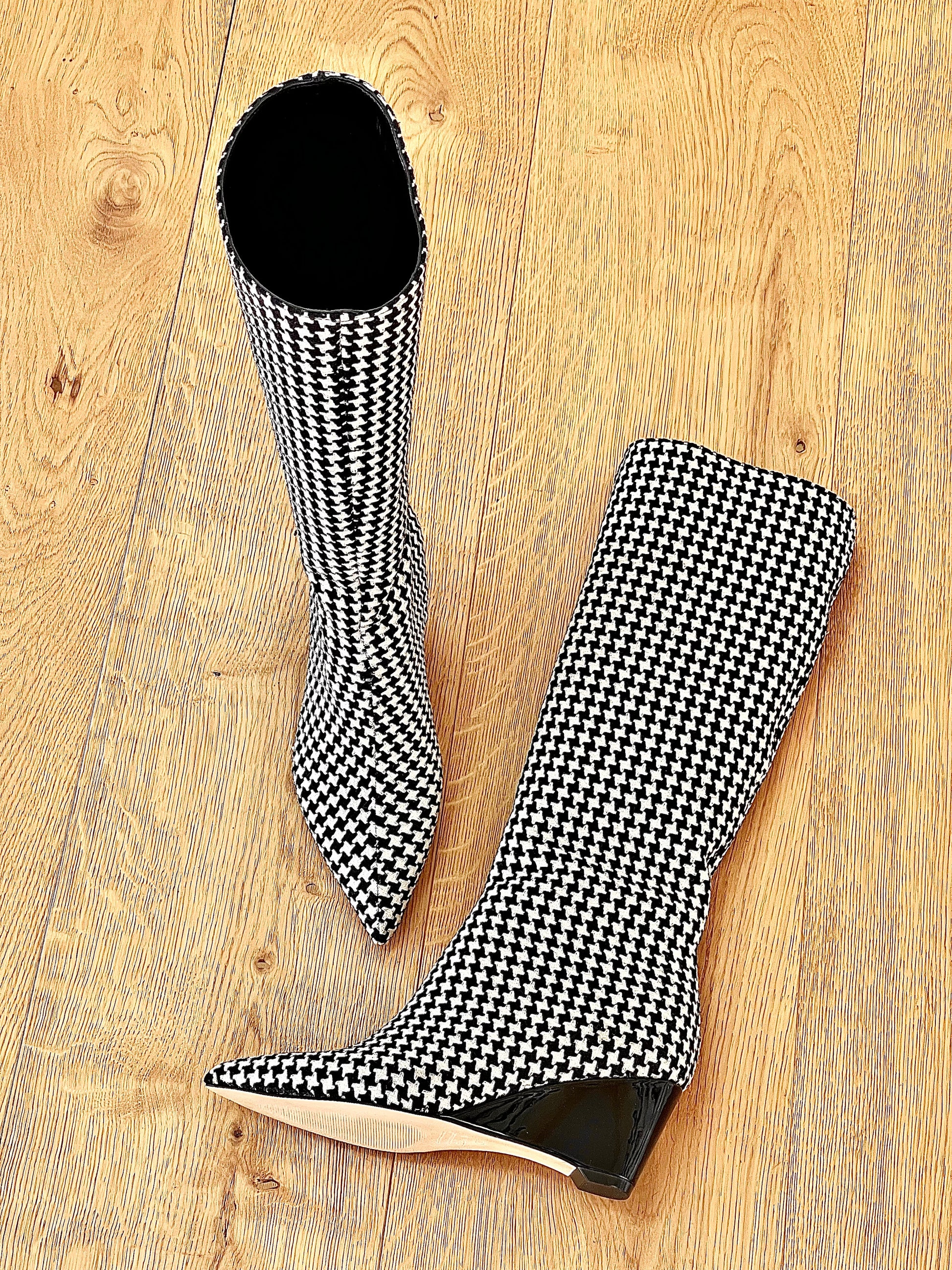 Hahnentritt-Schlauchstiefel mit Keil aus Lackleder.