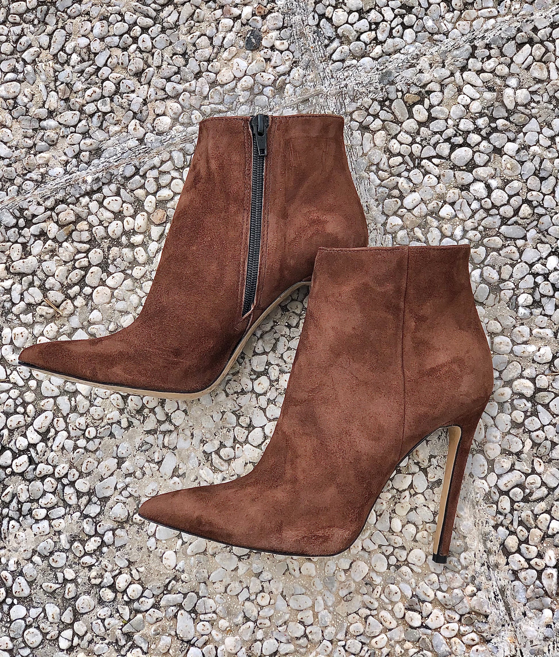 Spitz zulaufende Wildlederstiefelette mit 10 cm Pfennigabsatz.