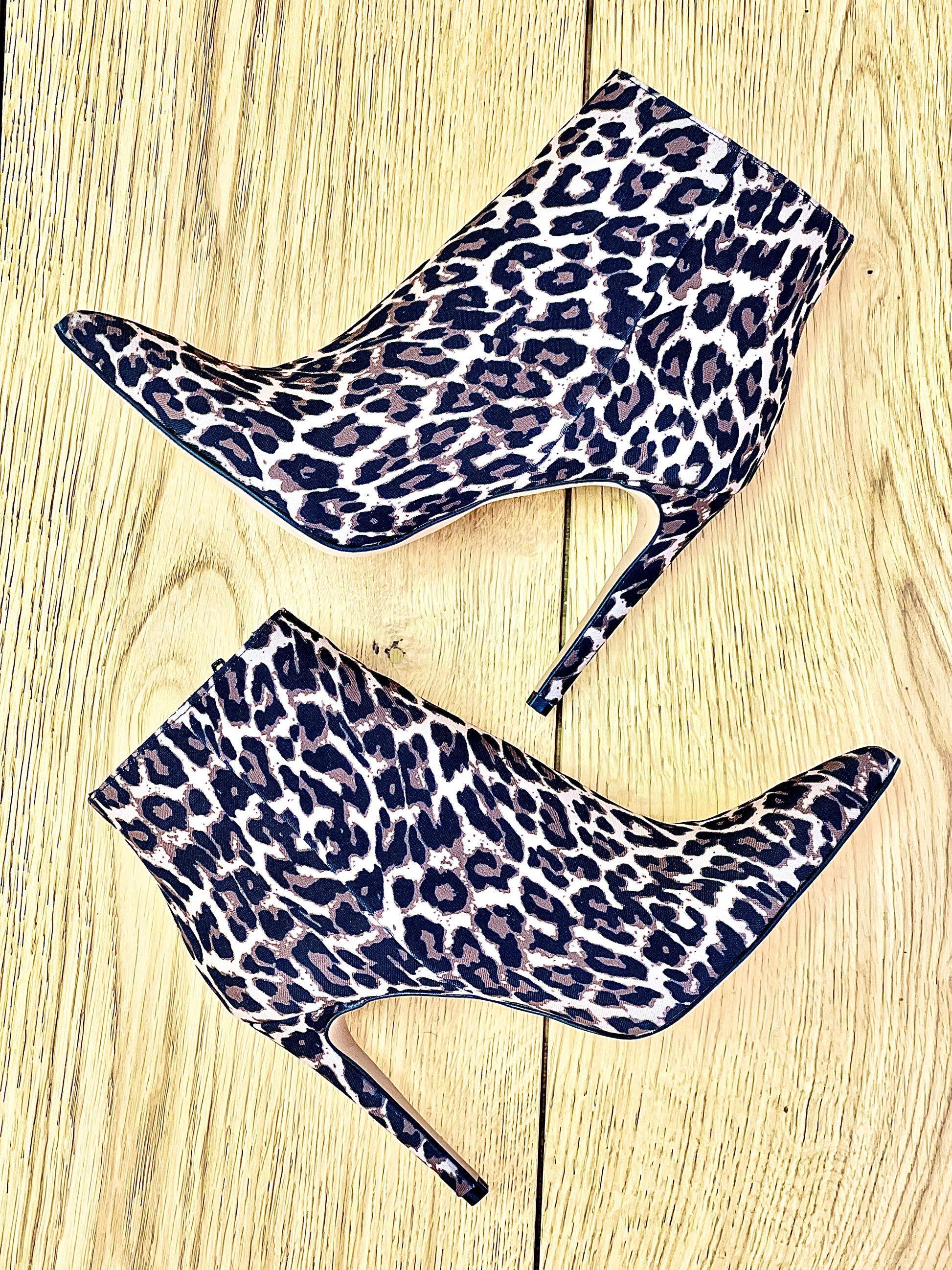 Spitz zulaufende Stiefelette im Leopardenmuster mit 10 cm hohem Stilettoabsatz.