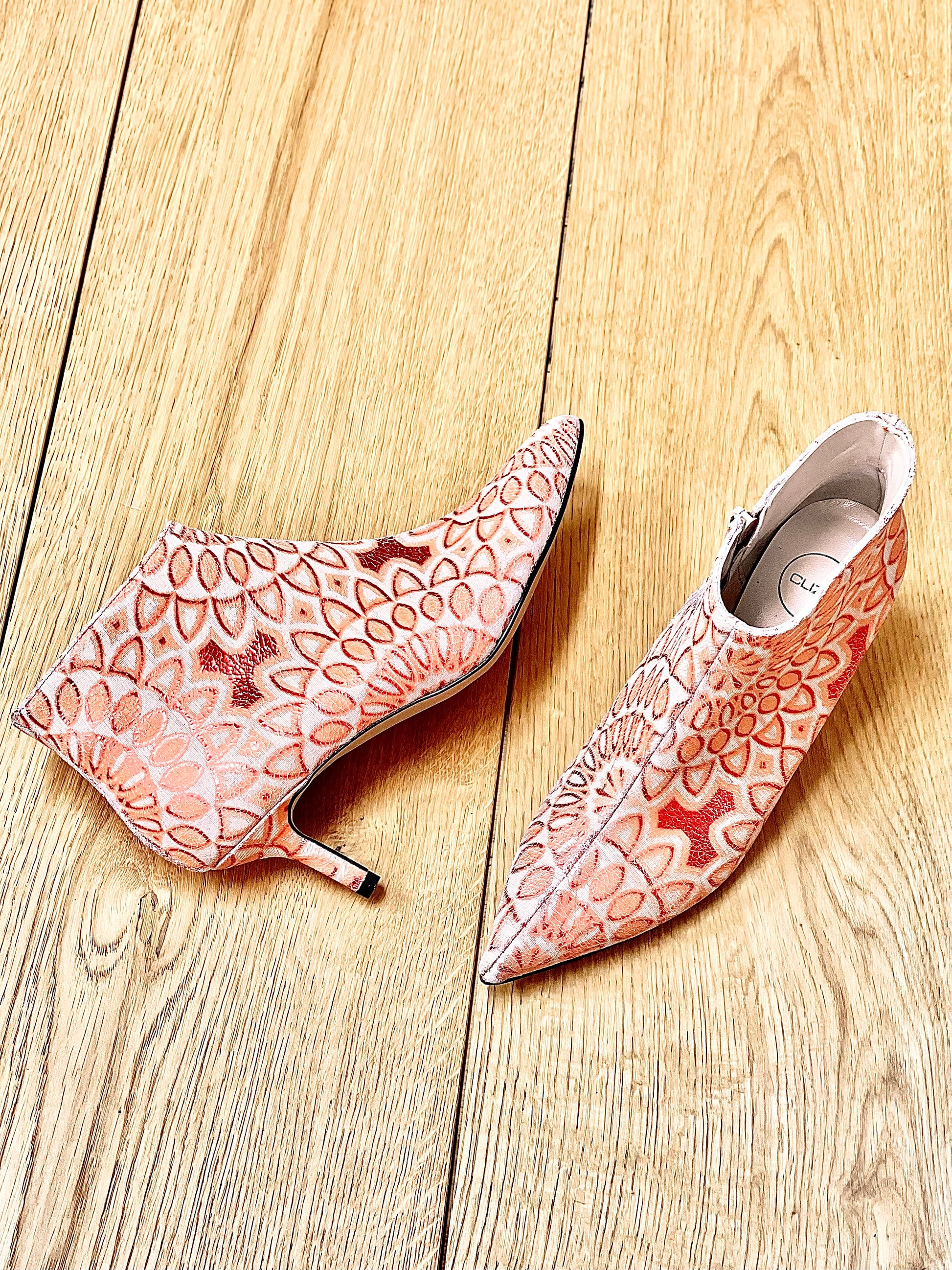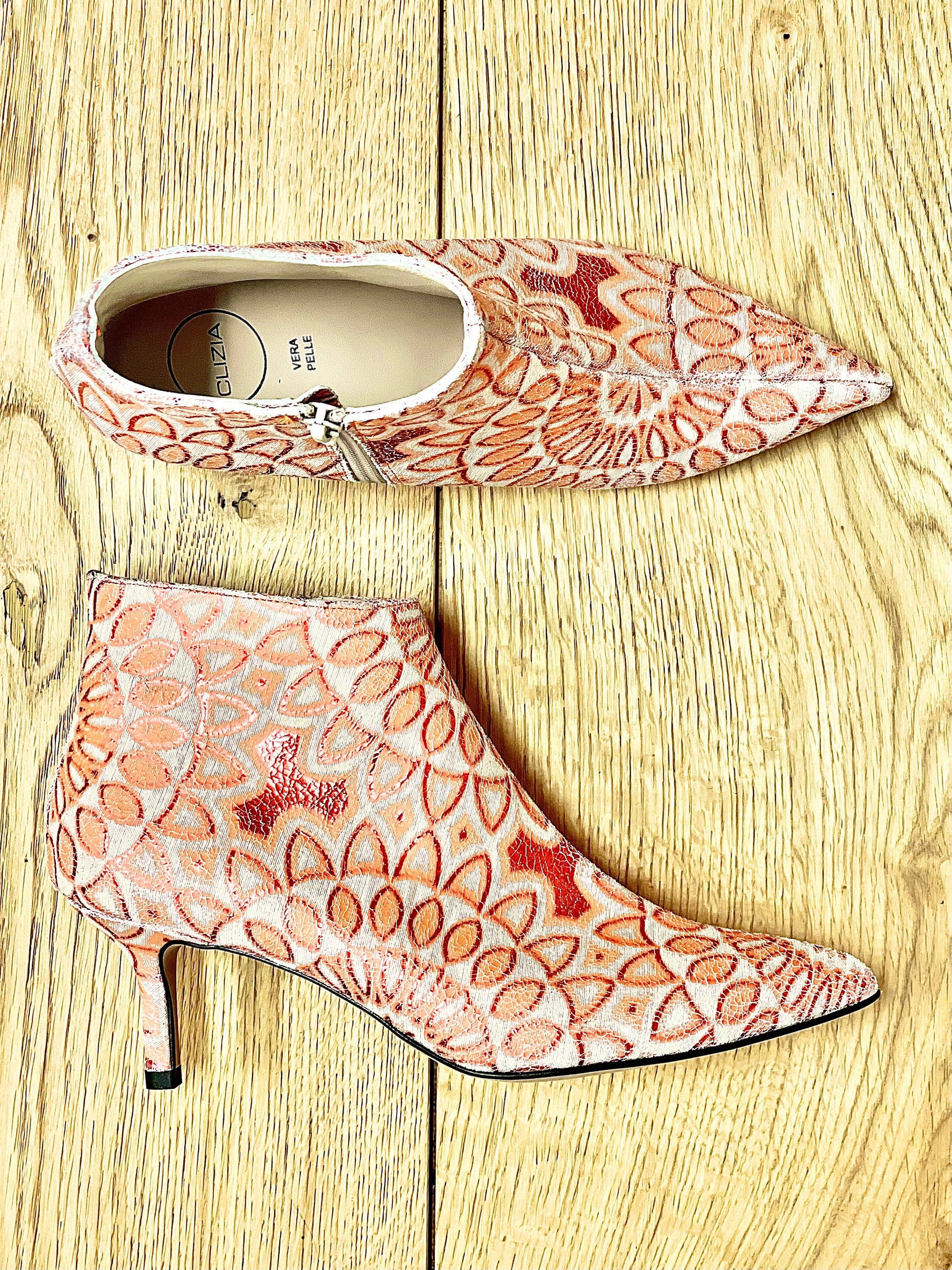 Spitz zulaufende Stiefelette aus Crackle-Leder mit Ethnomuster, 6 cm Absatz.