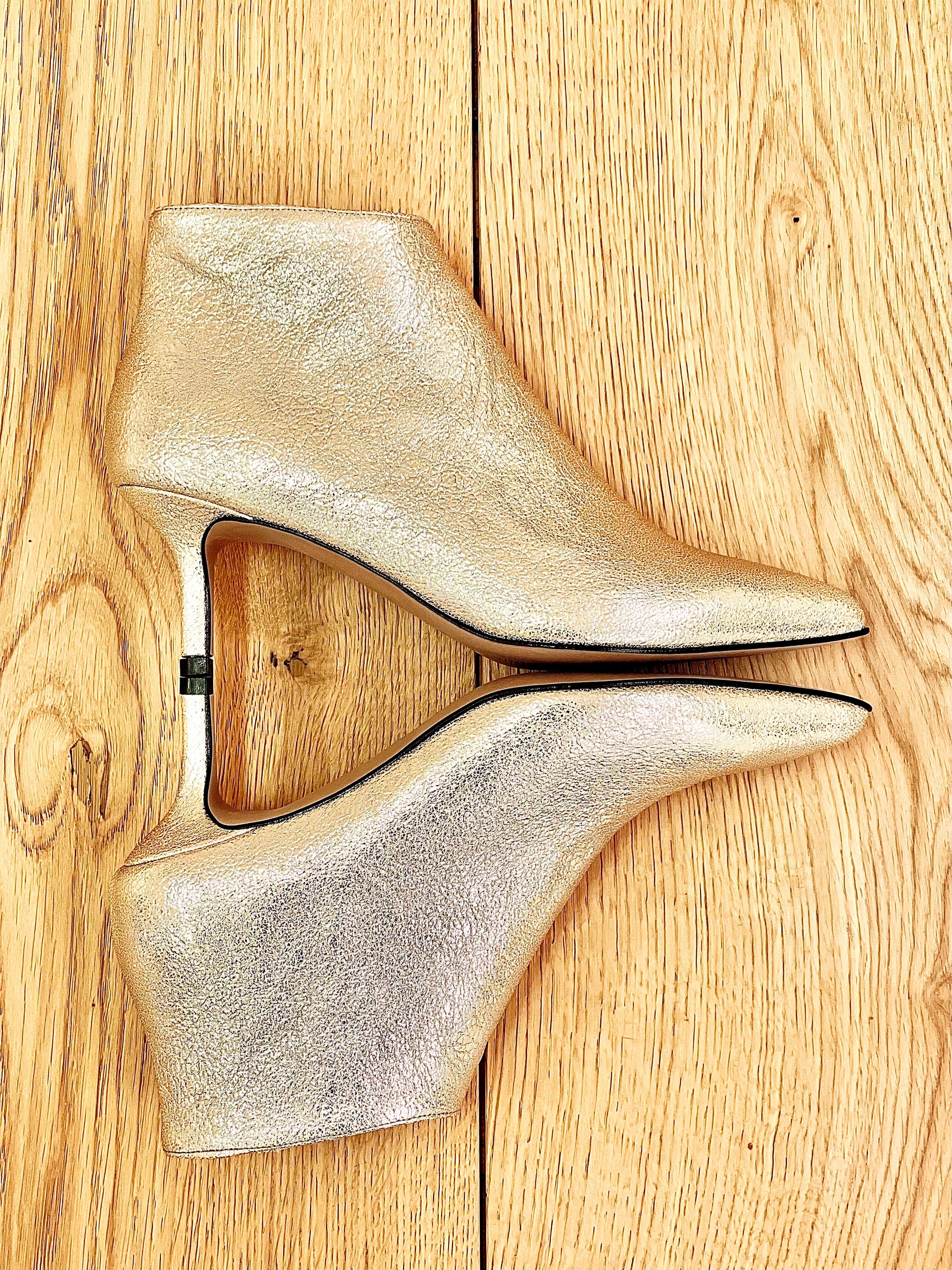 Spitz zulaufende Stiefelette aus Laminat mit 6 cm Absatz.