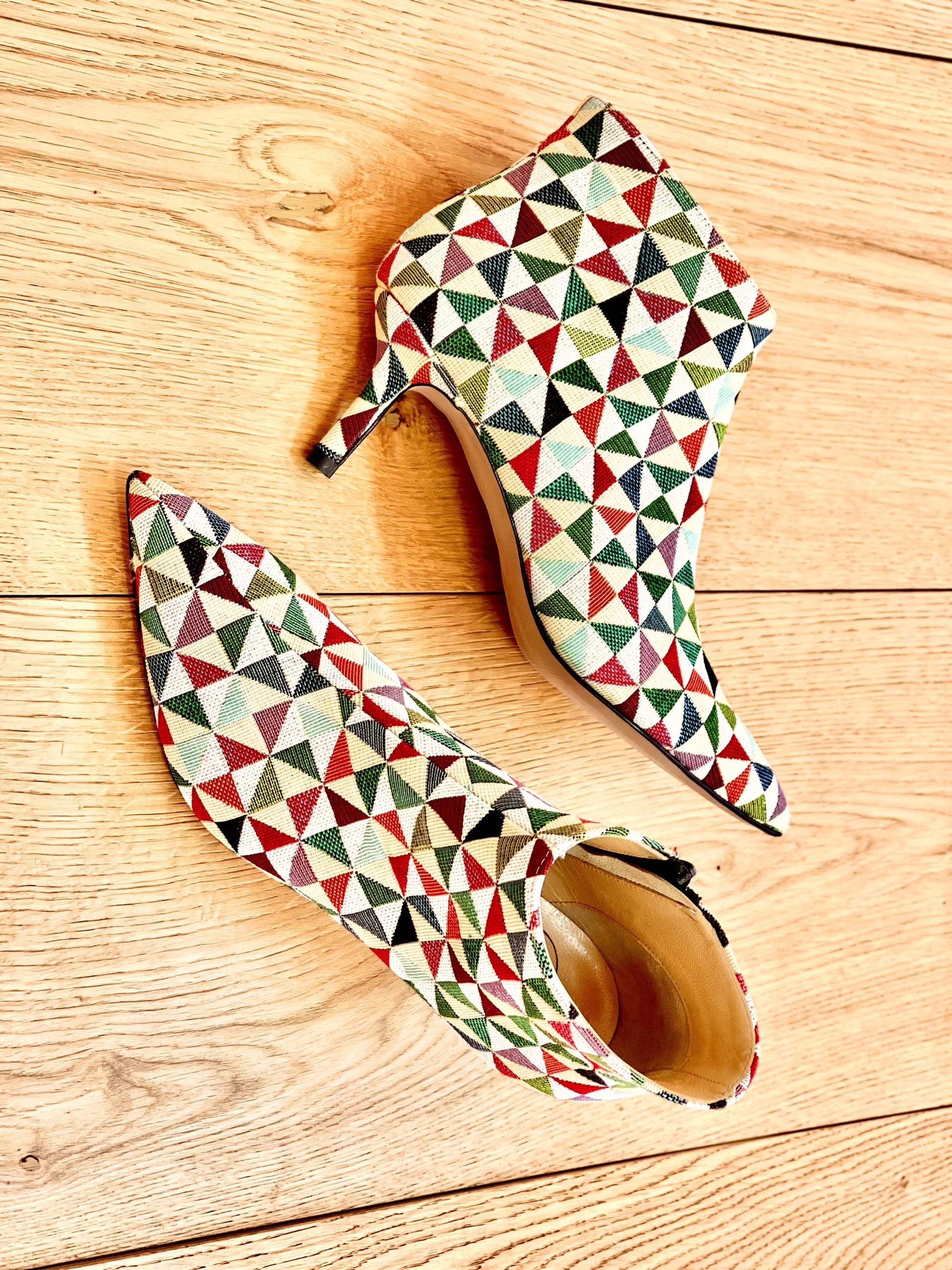 Spitz zulaufende Stiefelette aus mehrfarbigem Jacquard mit Dreiecksmotiv.