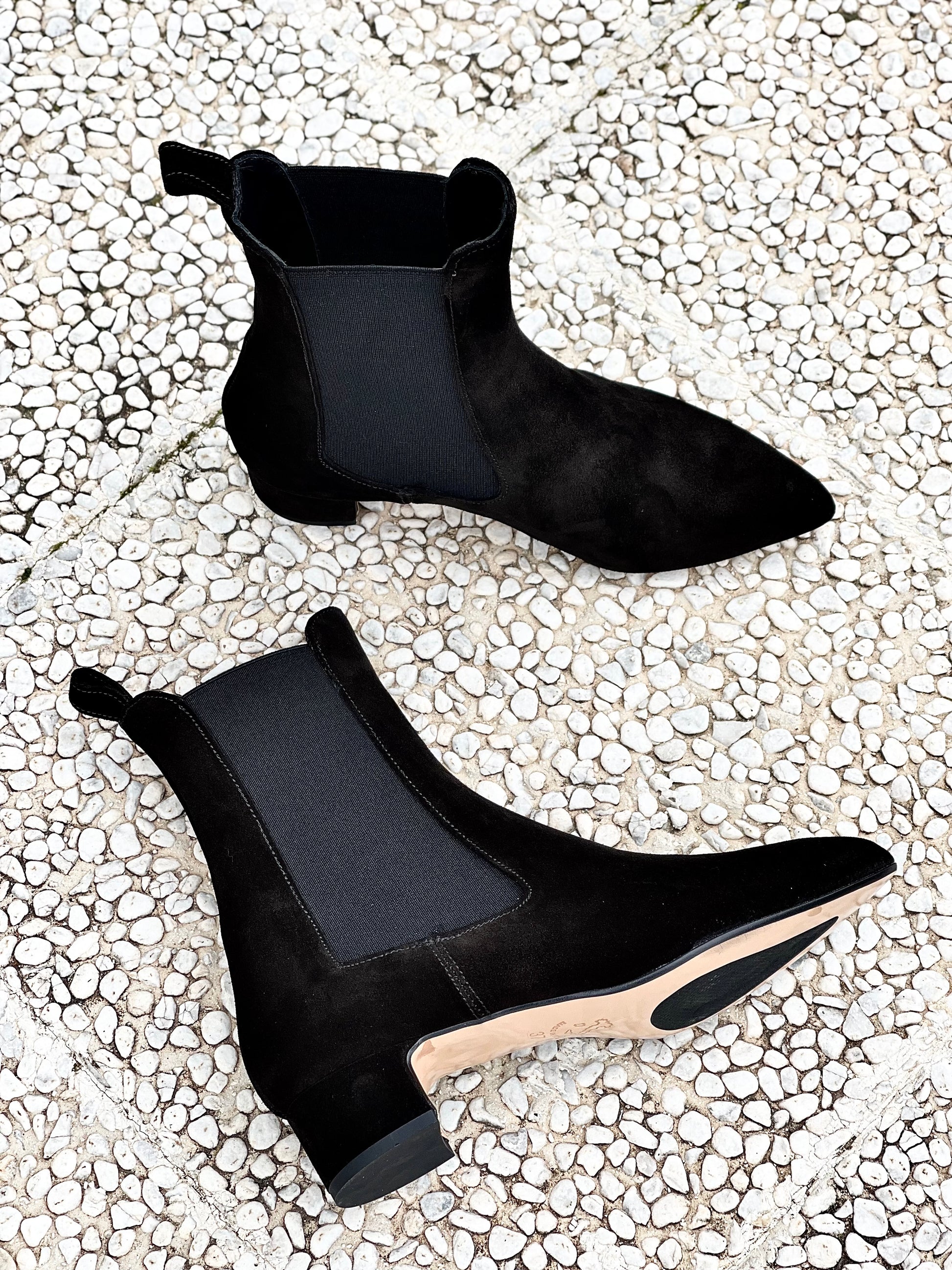 Flacher Chelsea-Stiefel aus Wildleder mit 35 mm breitem Absatz.