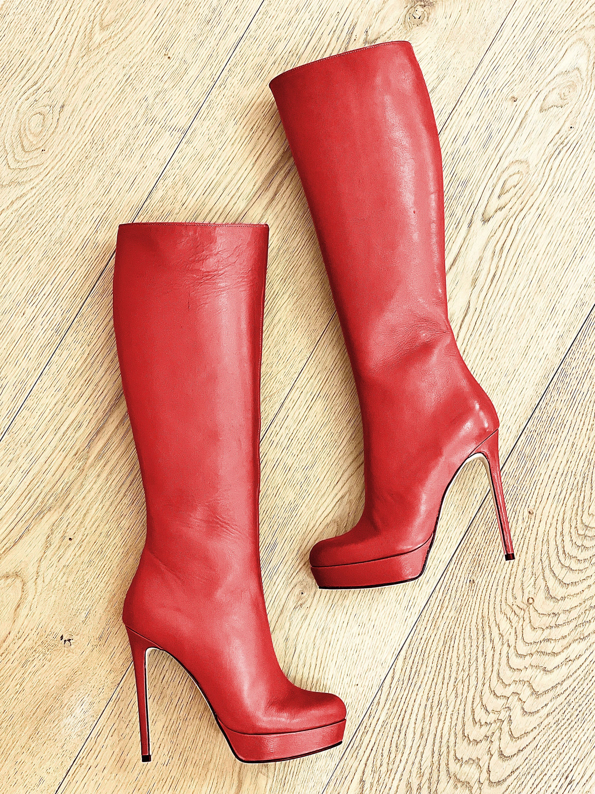 Hohe Stiefel mit runder Spitze aus Leder mit Plateau und Stilettoabsatz.