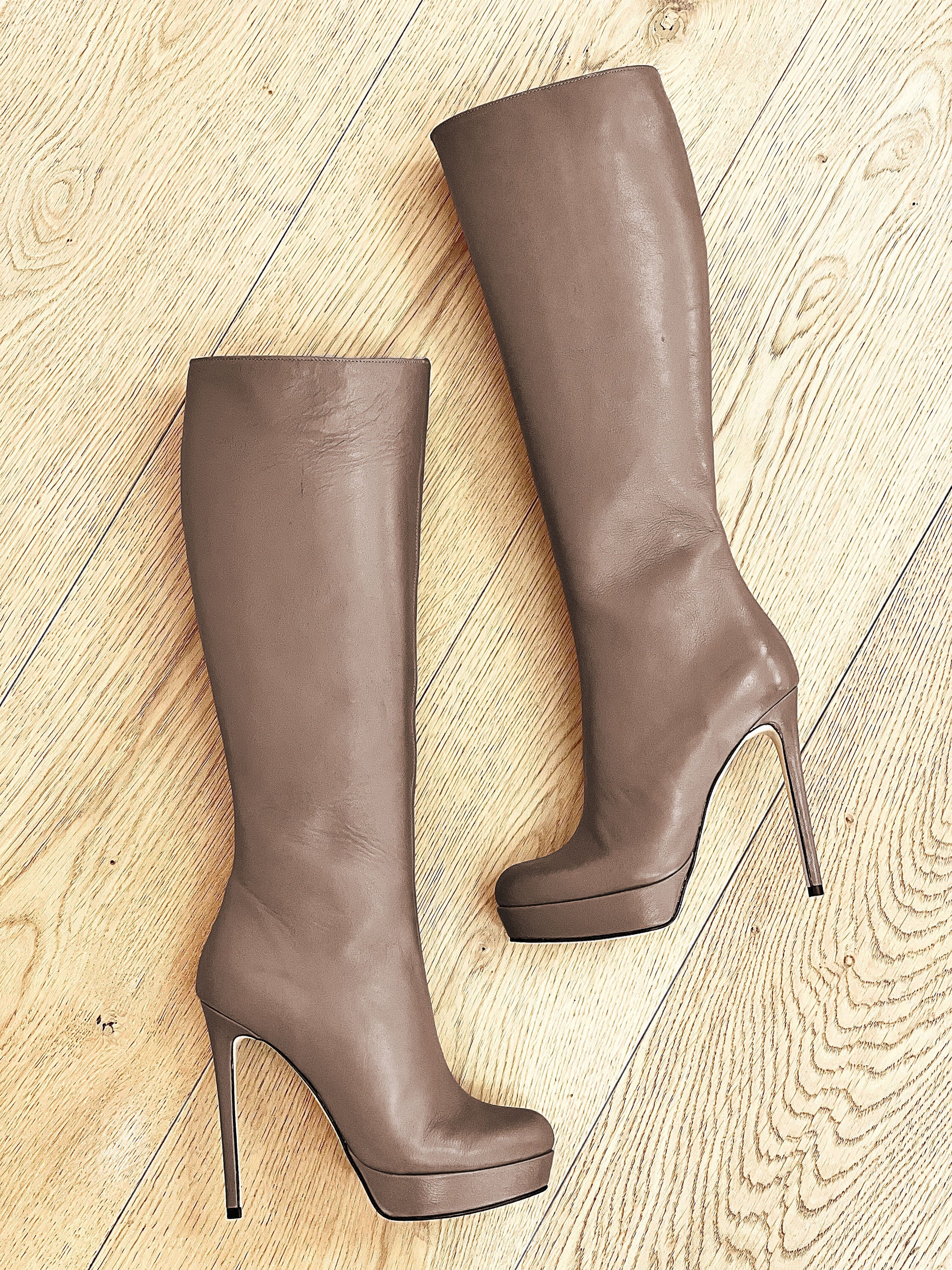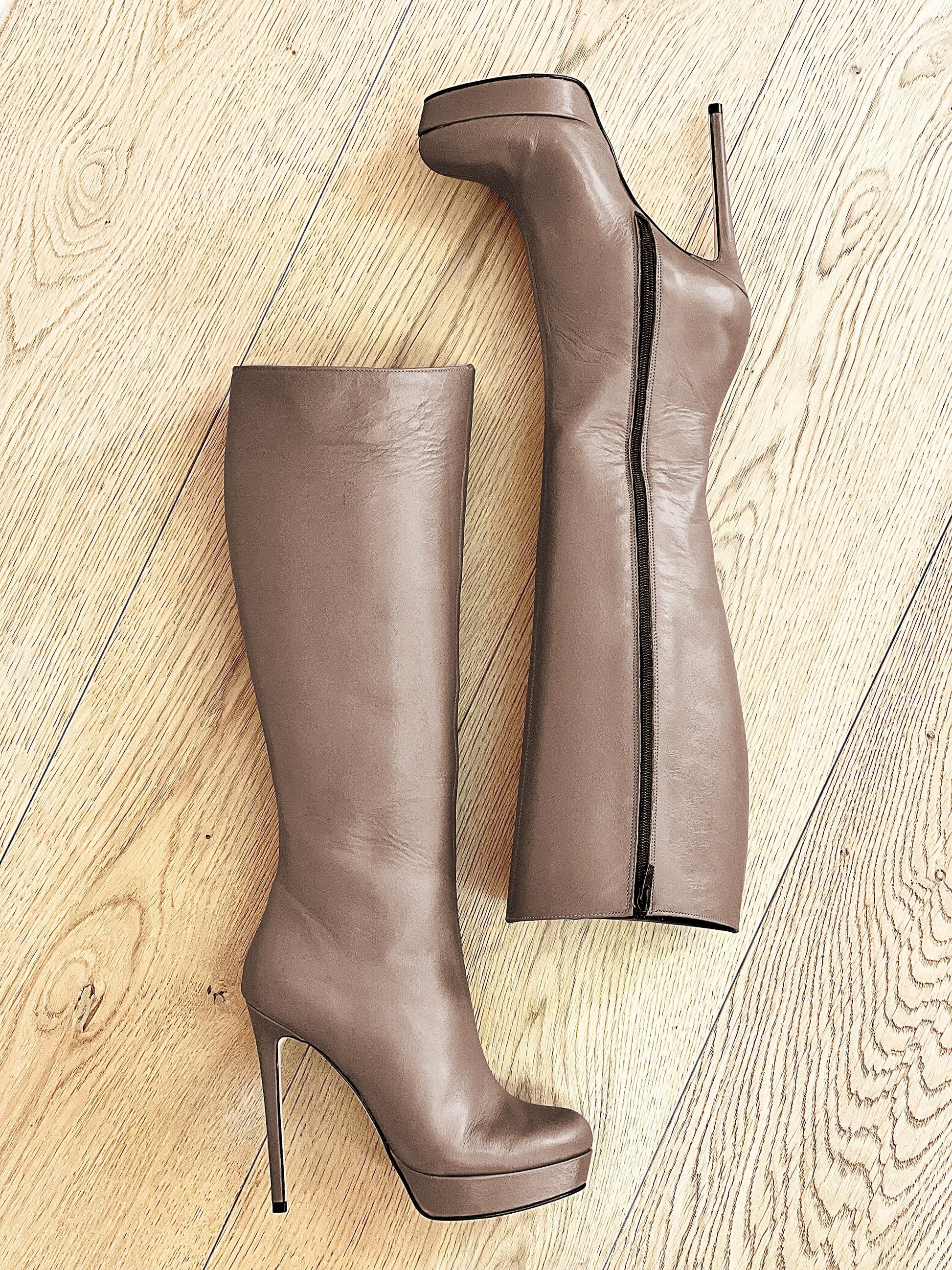 Hohe Stiefel mit runder Spitze aus Leder mit Plateau und Stilettoabsatz.