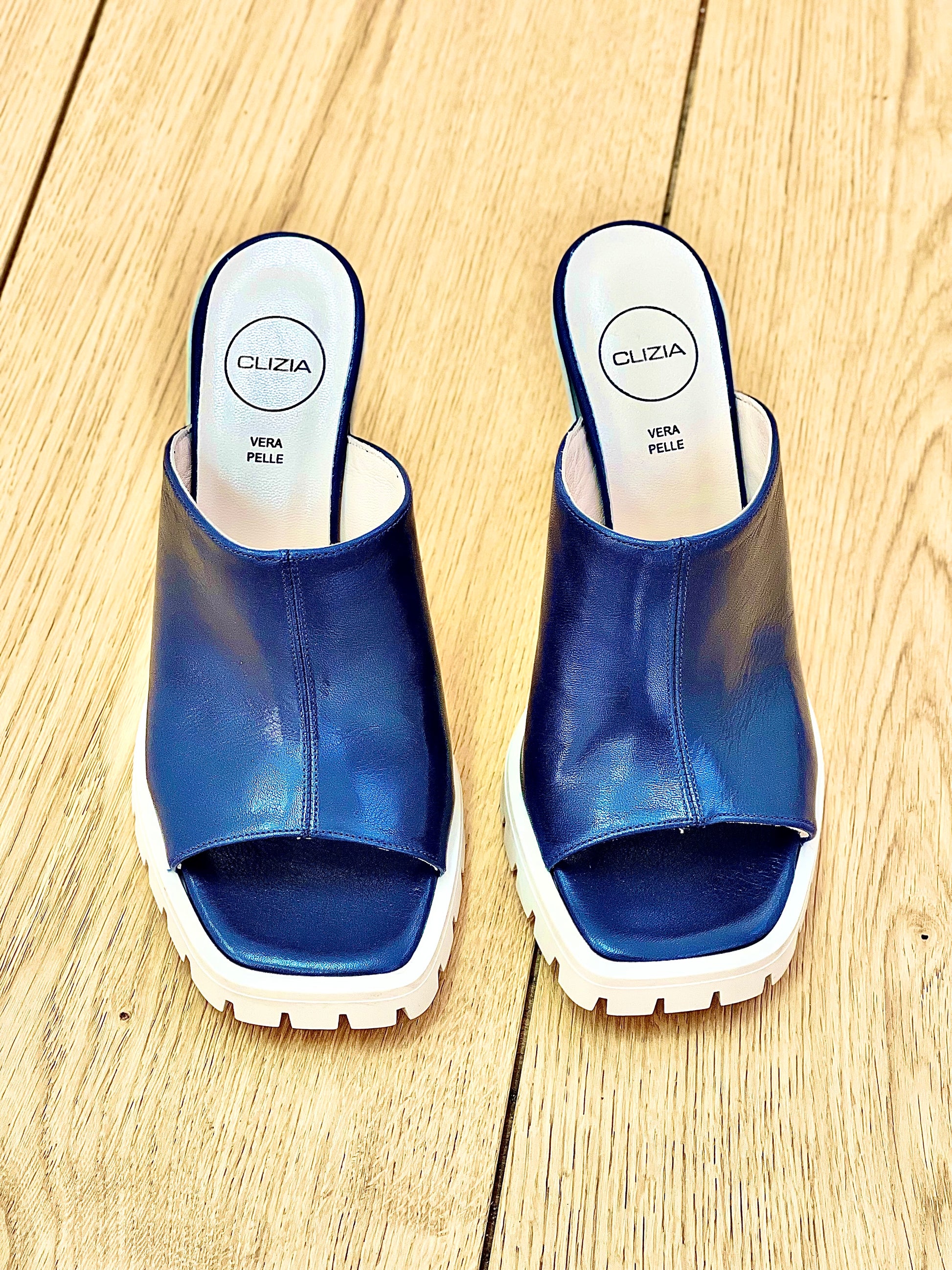 Hohe Sandalen mit Lederschuhen auf einem Plateau mit einer Zwischensohle aus Gummi.