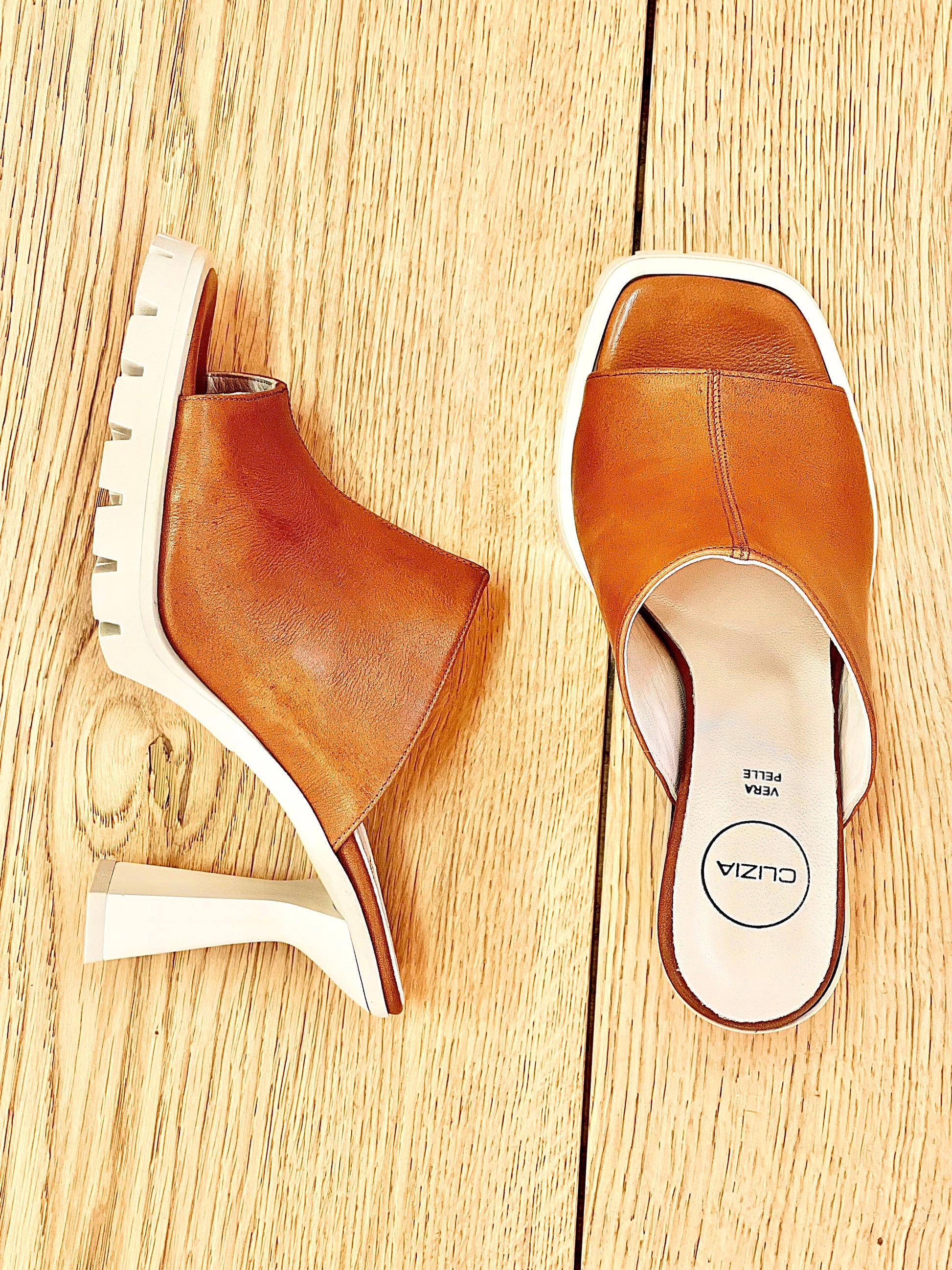 Hohe Sandalen mit Lederschuhen auf einem Plateau mit einer Zwischensohle aus Gummi.