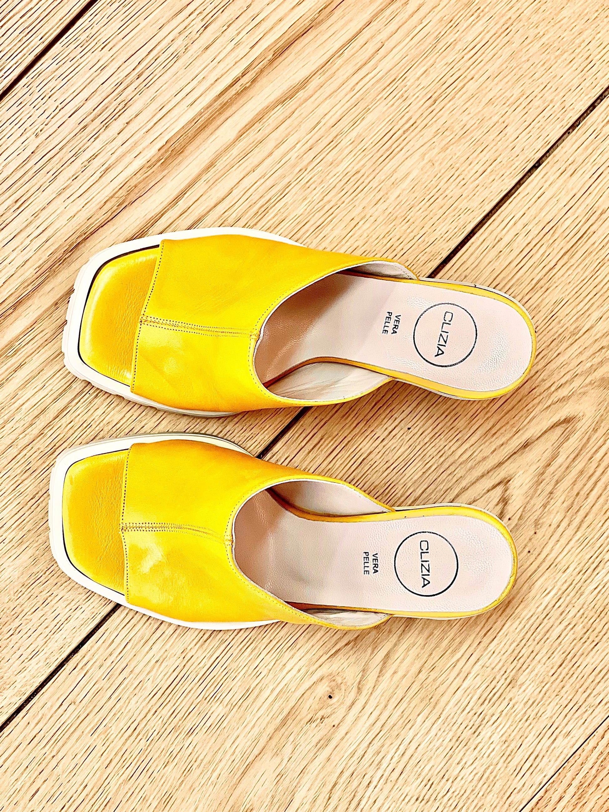 Hohe Sandalen mit Lederschuhen auf einem Plateau mit einer Zwischensohle aus Gummi.