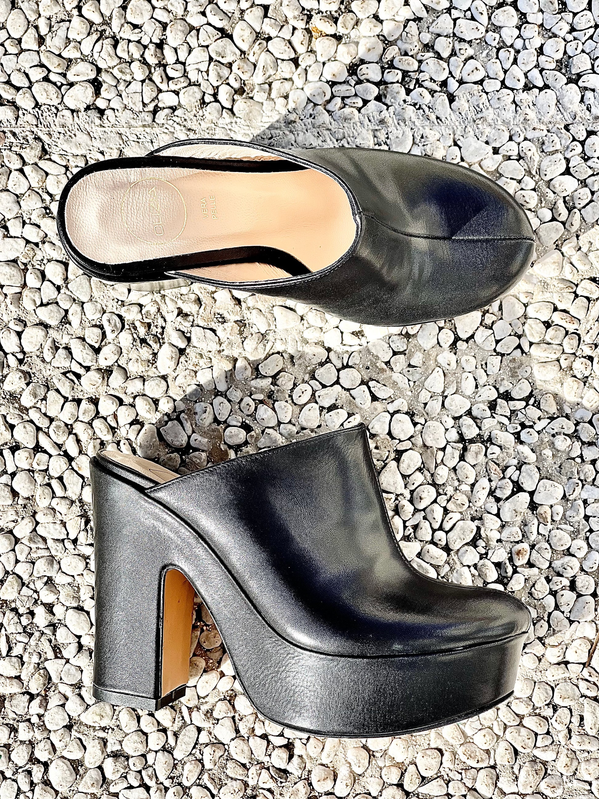 Runder Ledersabot auf 11,5 cm hohem Keilabsatz und 4 cm Plateau.