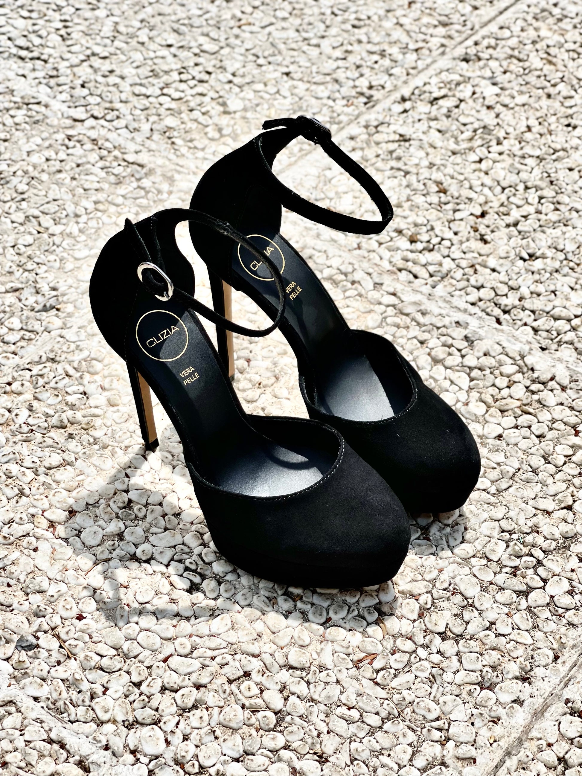 Pumps aus Wildleder mit 12 cm Absatz und 2 cm Plateau.