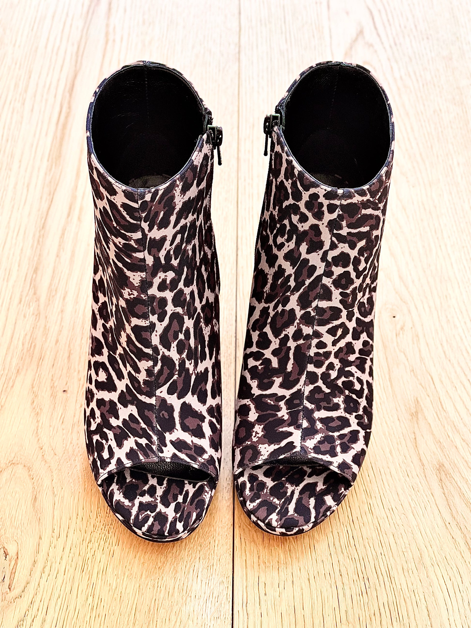 Μποτάκια με ανοιχτή μύτη σε animalier μοτίβο, με φαρδύ τακούνι ύψους 9 cm και πλατφόρμα 1 cm.