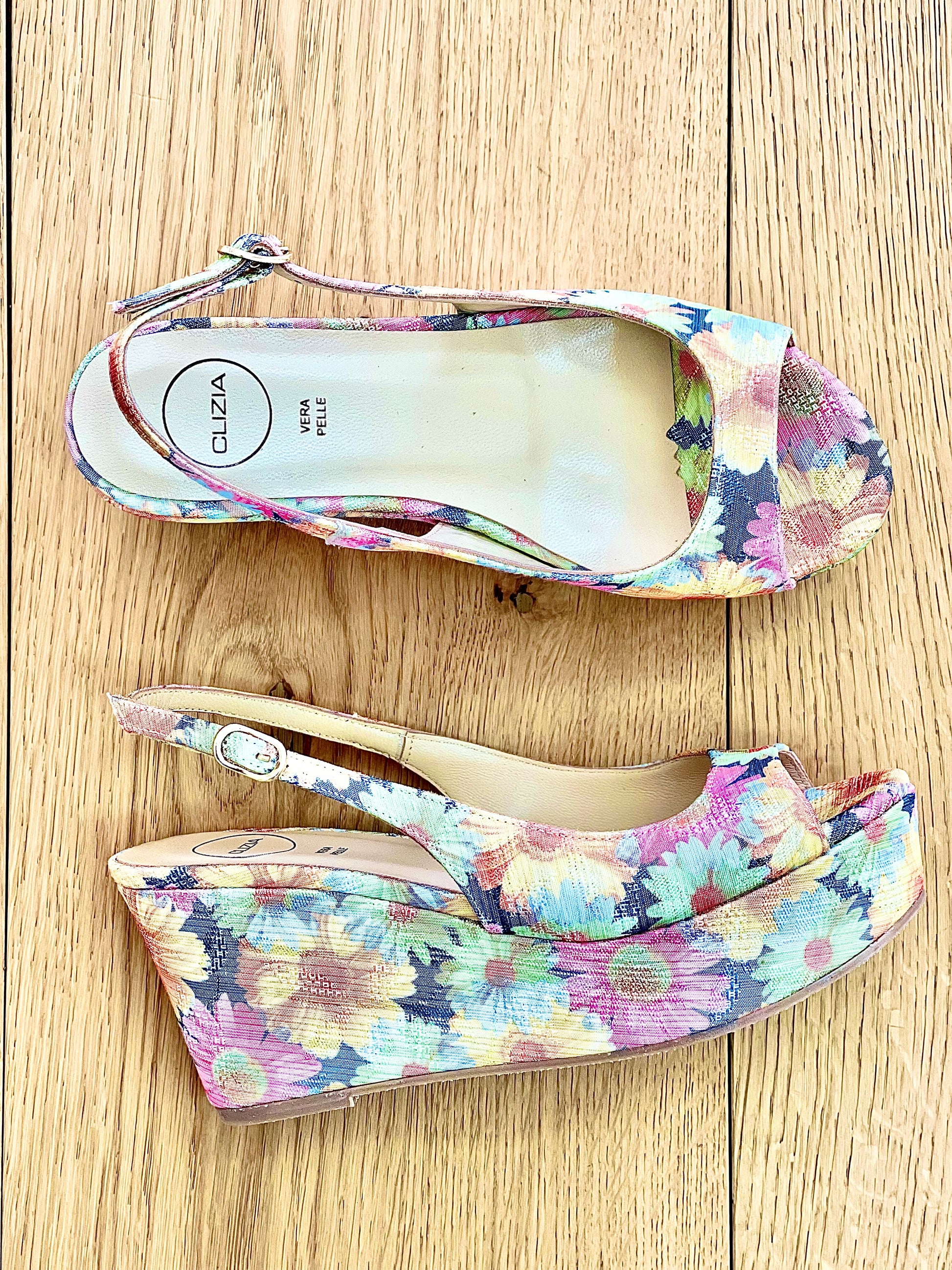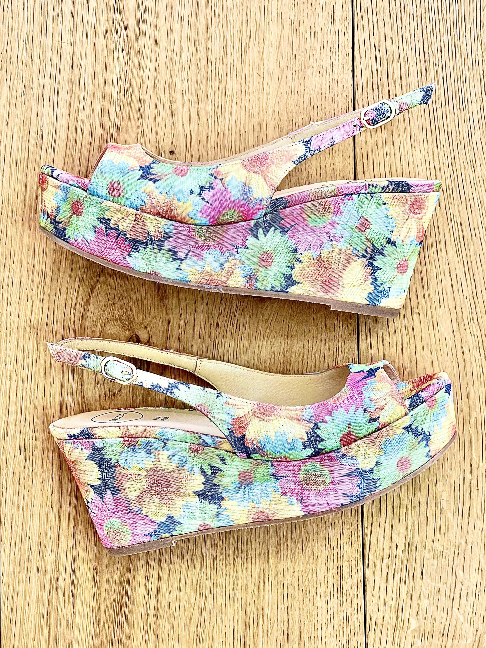 Ανοιχτά γόβα slingback με πολύχρωμο λουλουδάτο μοτίβο και μεσαίο τακούνι.