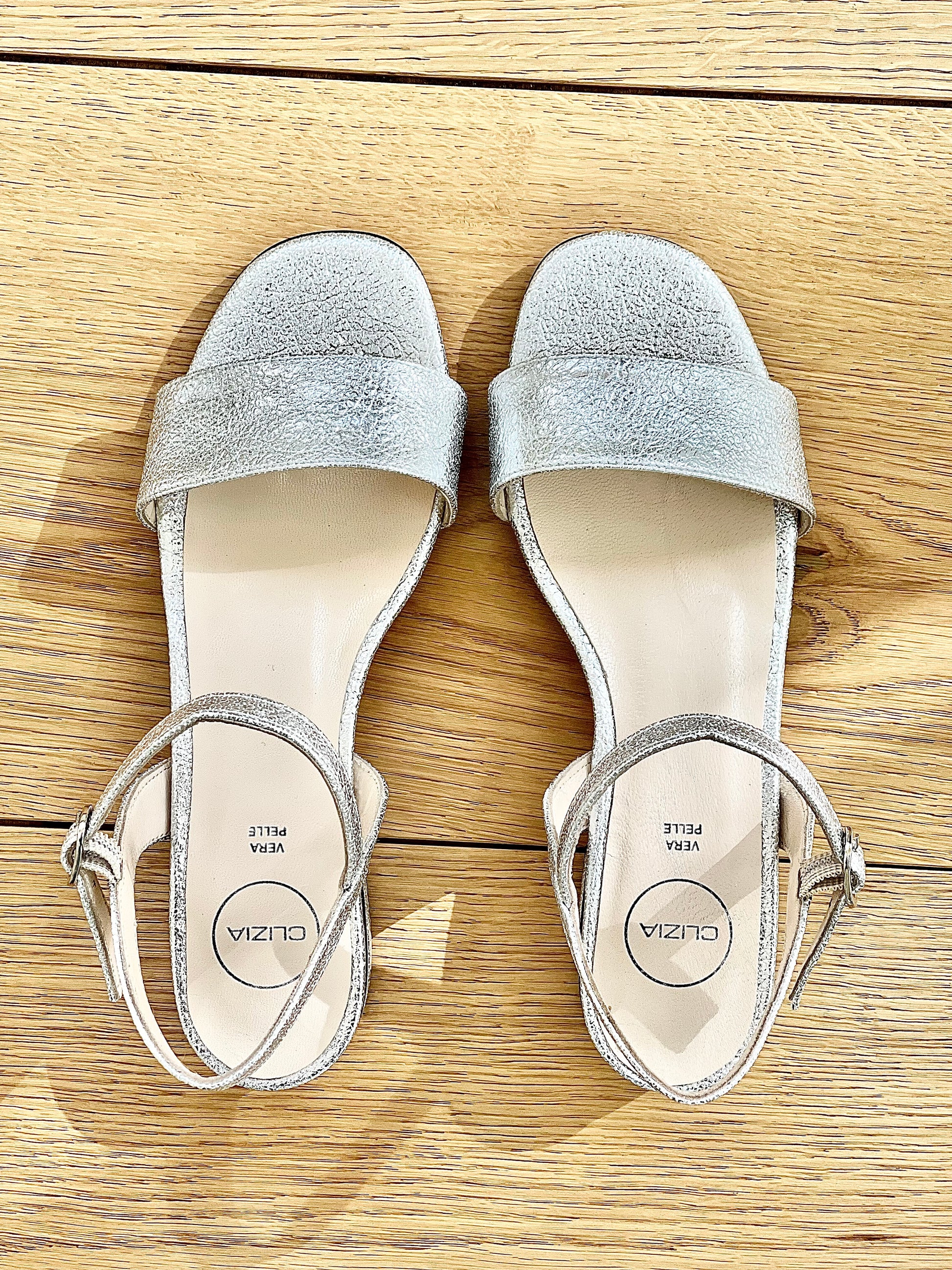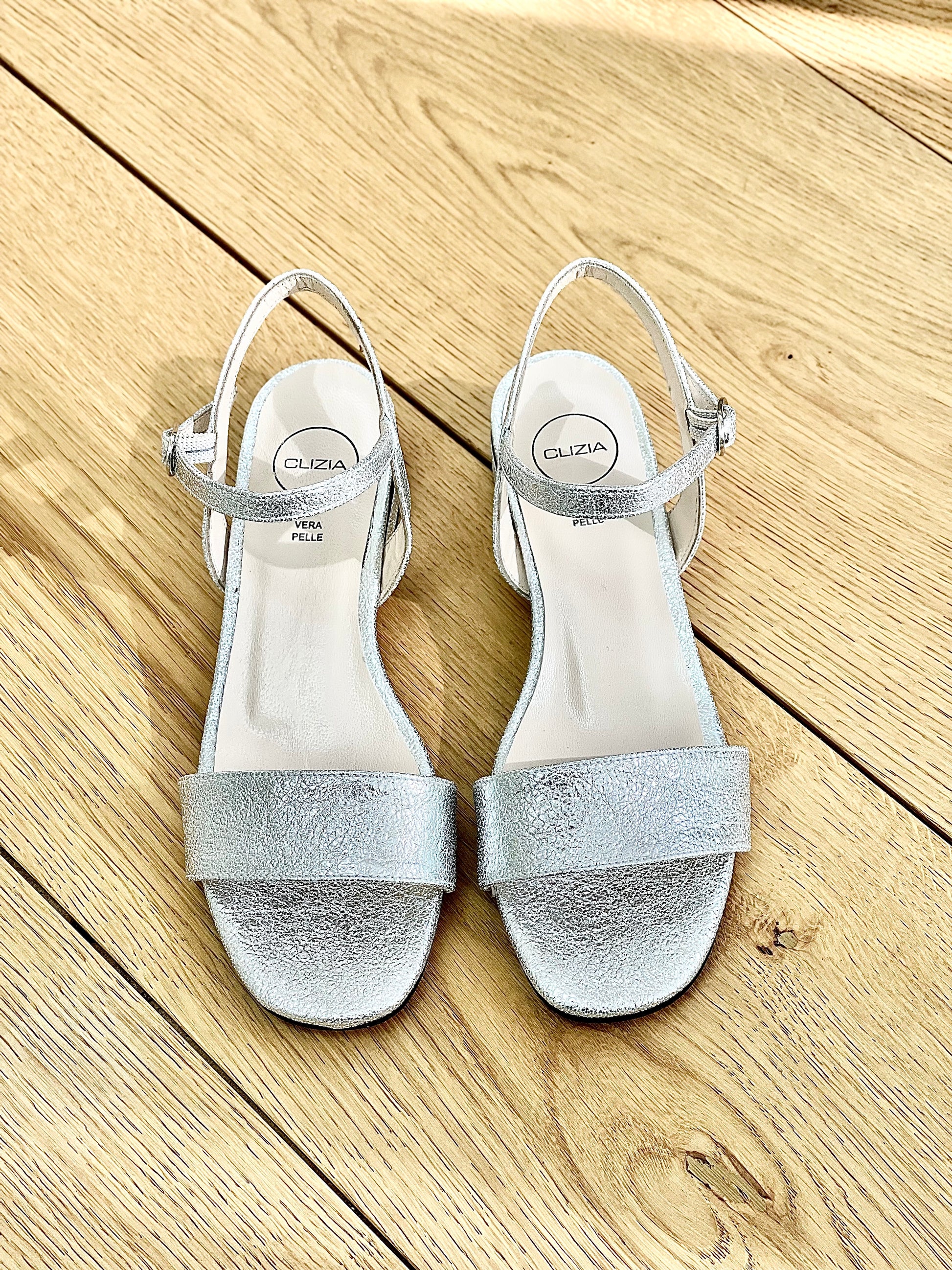 Σανδάλια με χαμηλό τακούνι 2 εκατοστά, λουράκι και λωρίδα από λαμινέ.