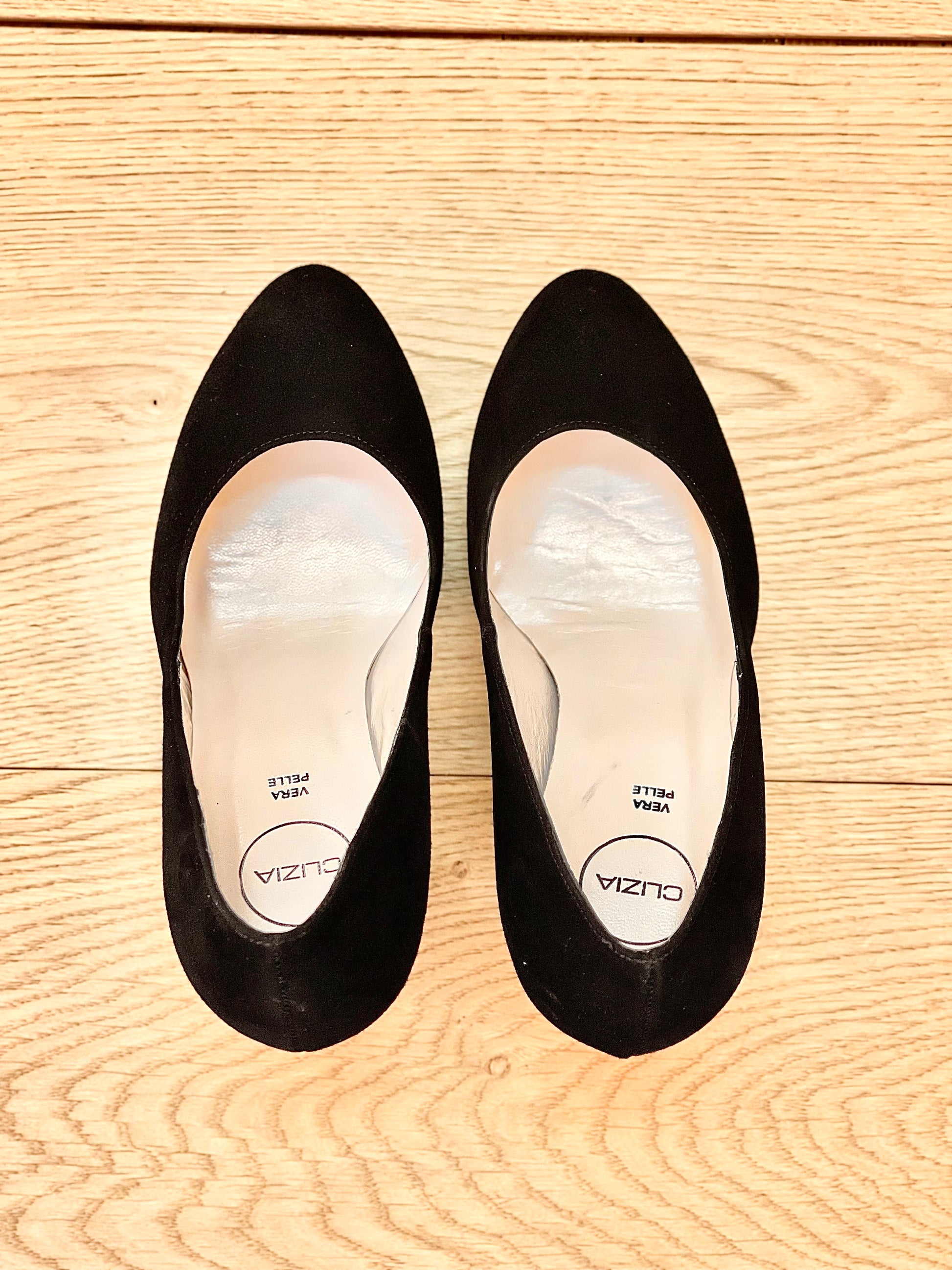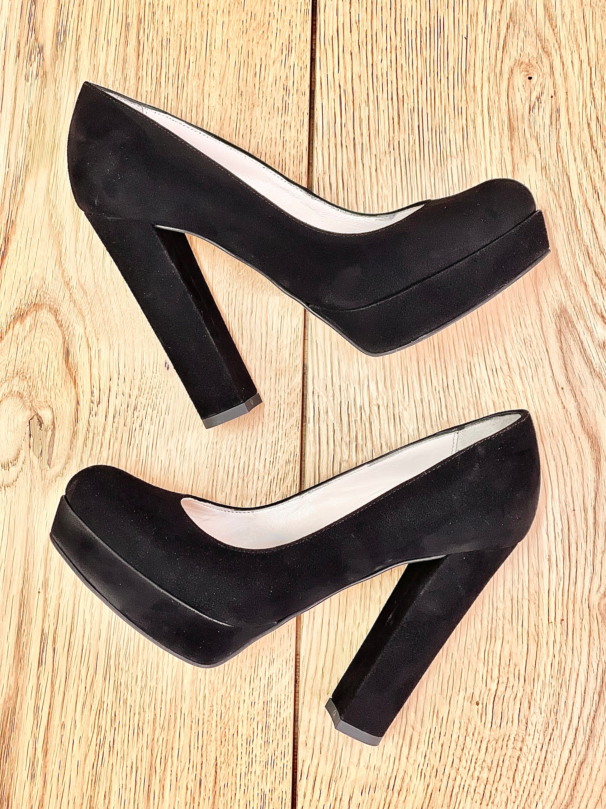 Γόβες με στρογγυλεμένη μύτη από καμηλό, φαρδύ τακούνι ύψους 12 cm και πλατφόρμα 3 cm.