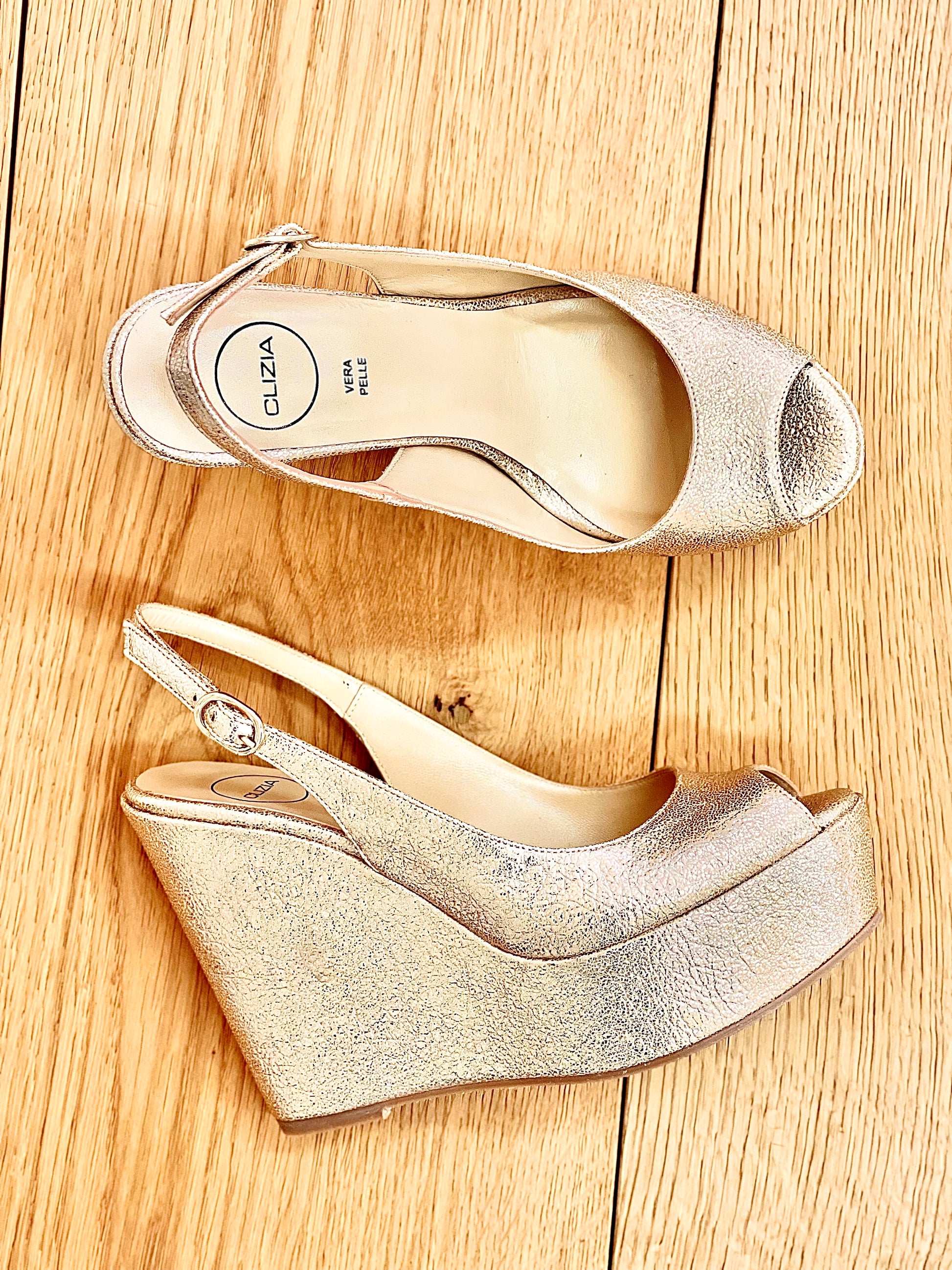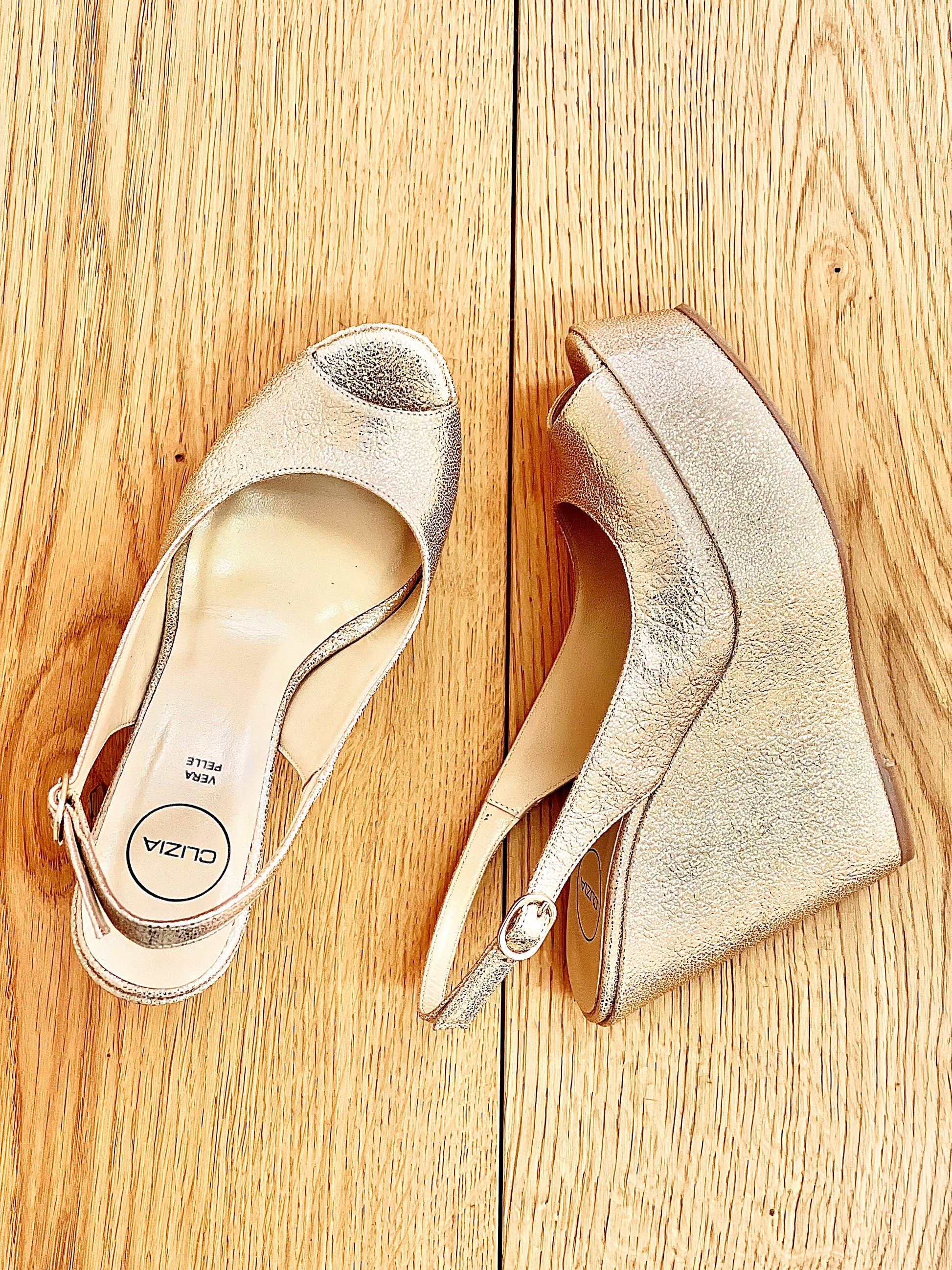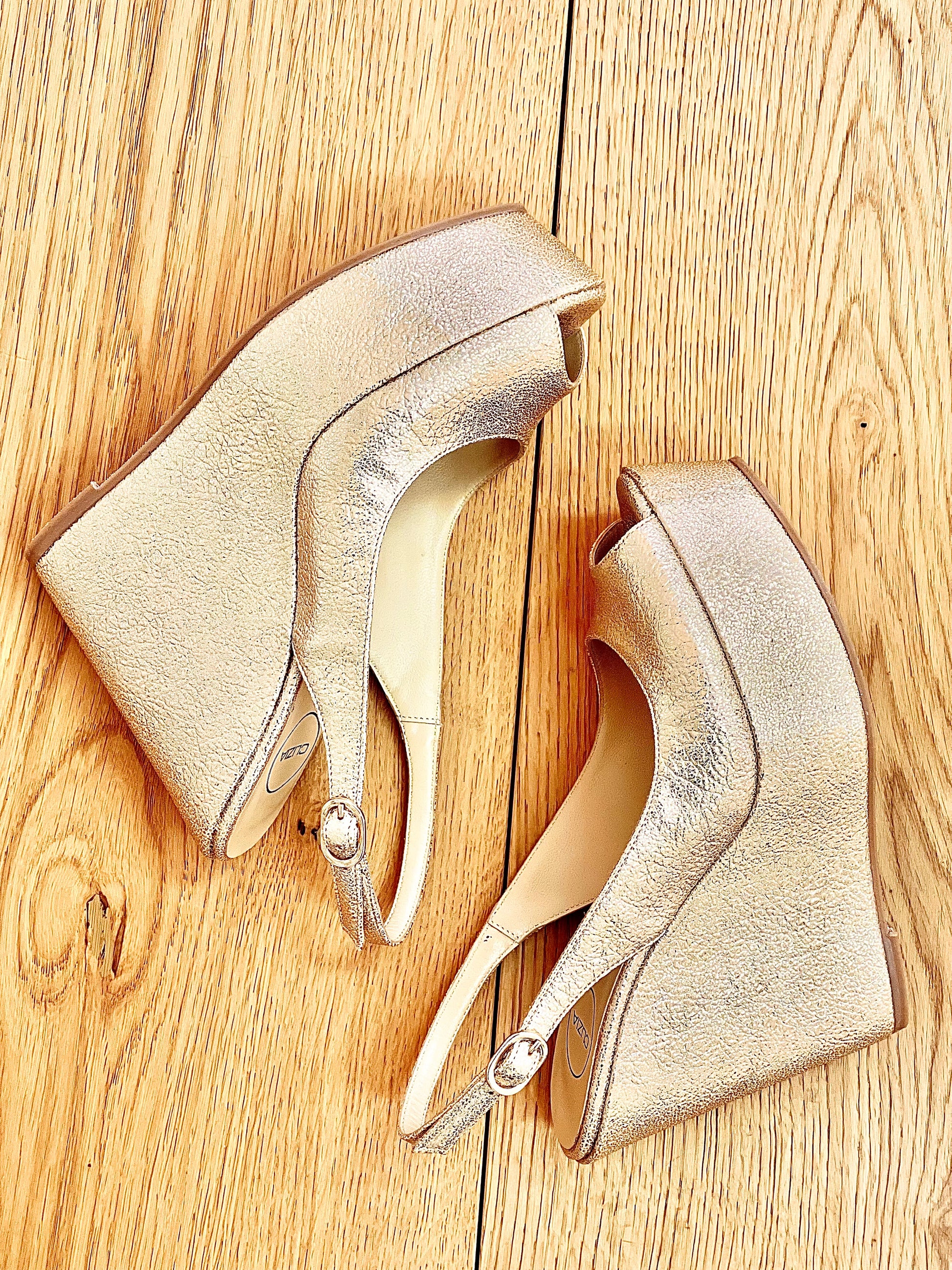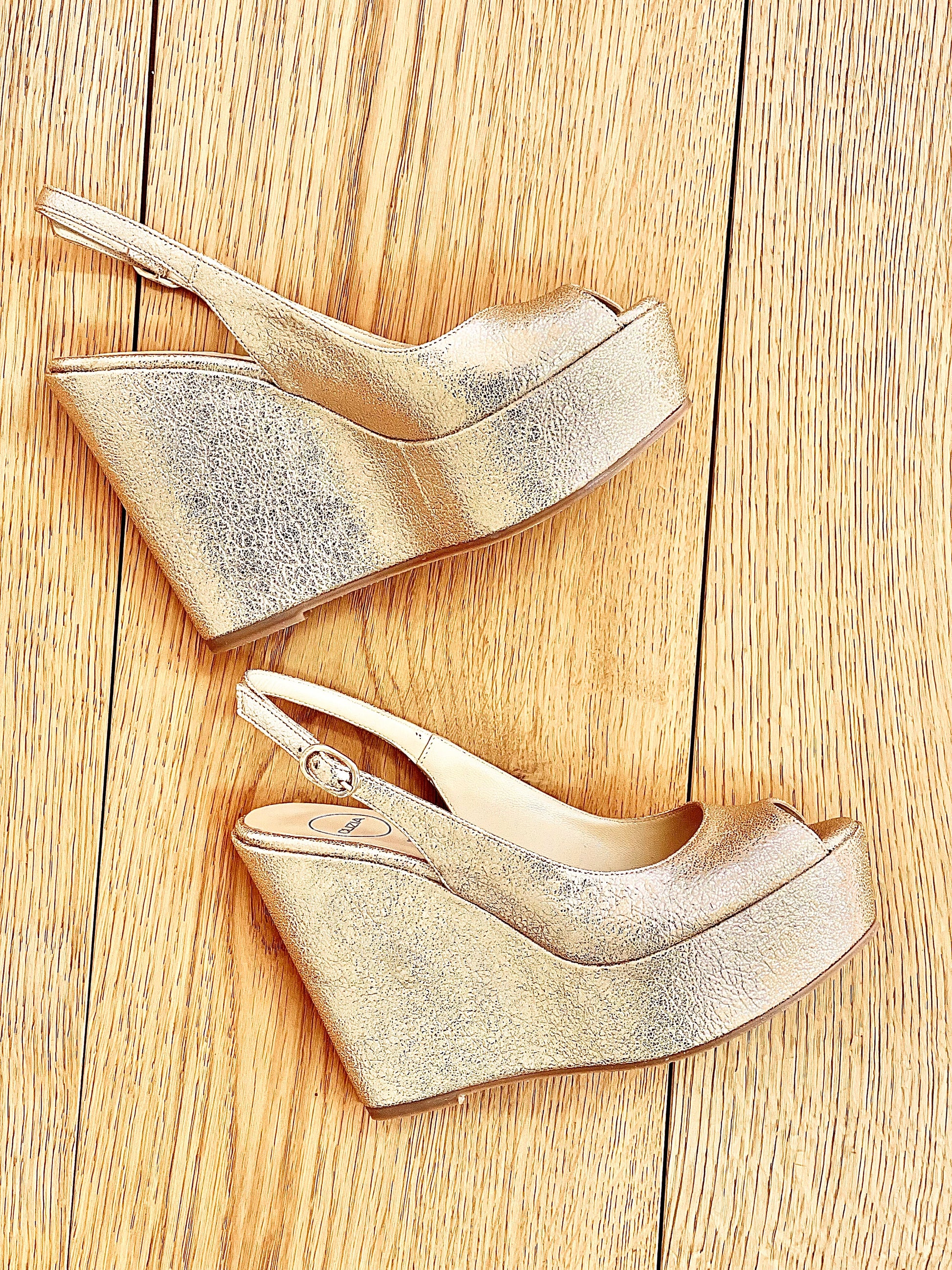 Ανοιχτά γόβα slingback από λαμινέ με ψηλό τακούνι.