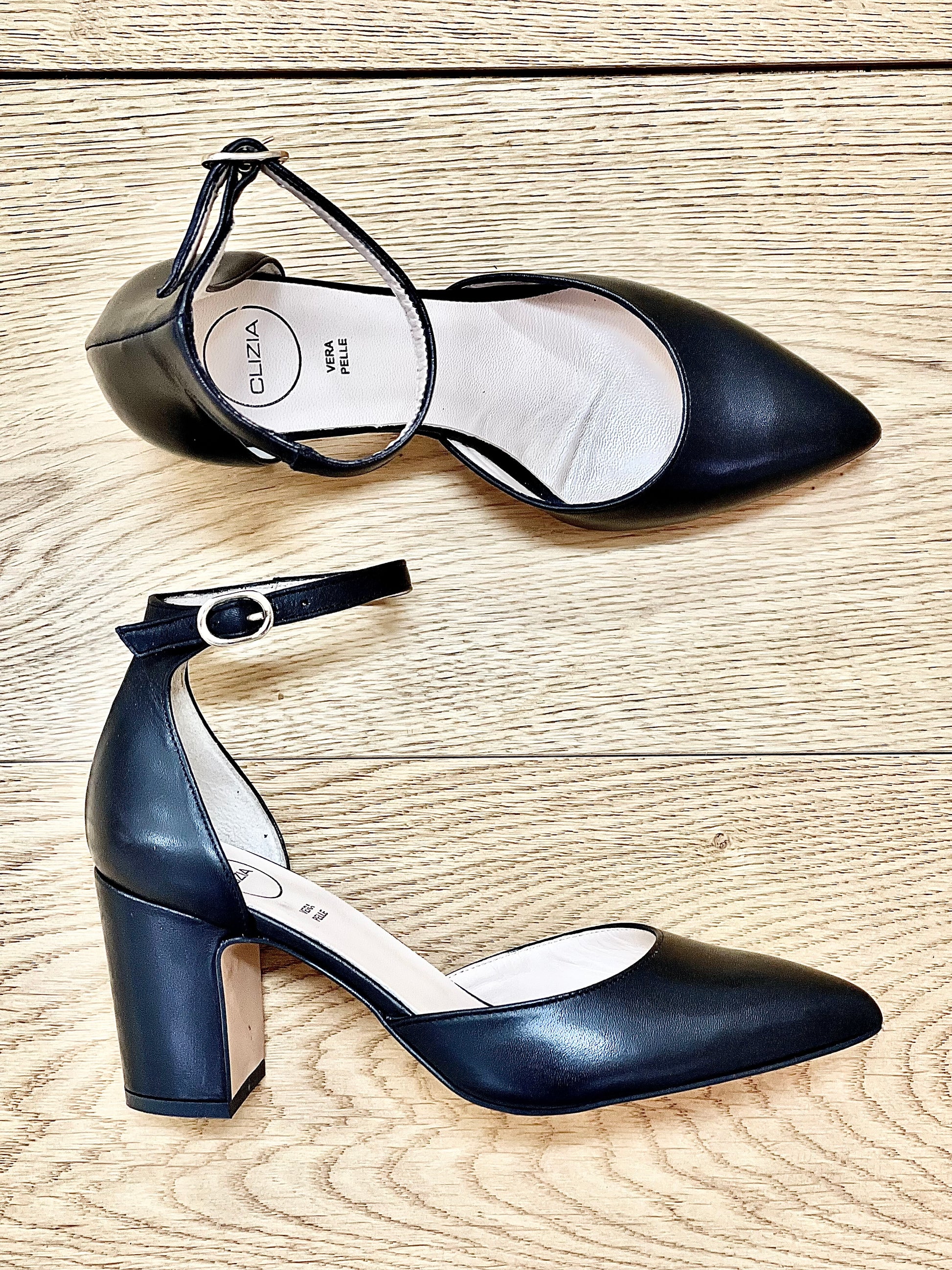 Γόβες με μυτερή μύτη και τακούνι από δέρμα, με φαρδύ τακούνι 75 mm.