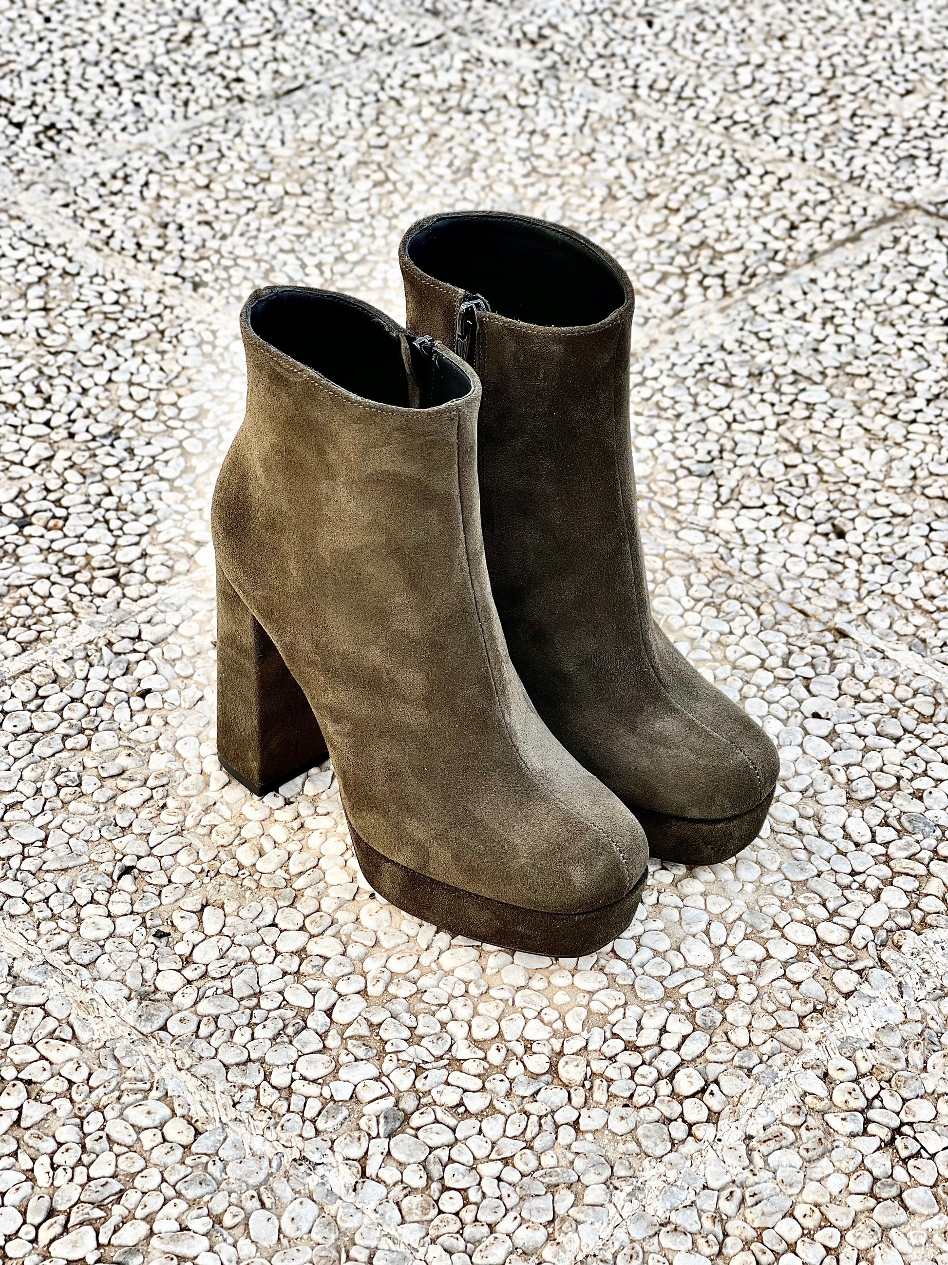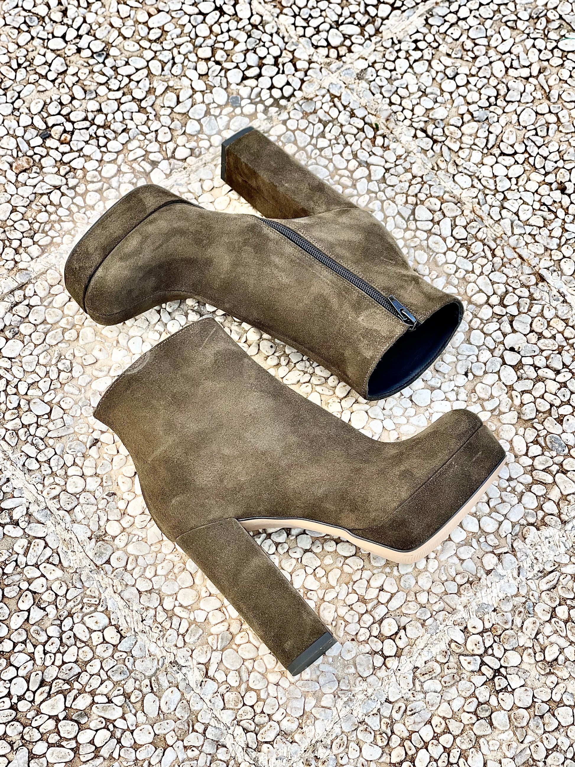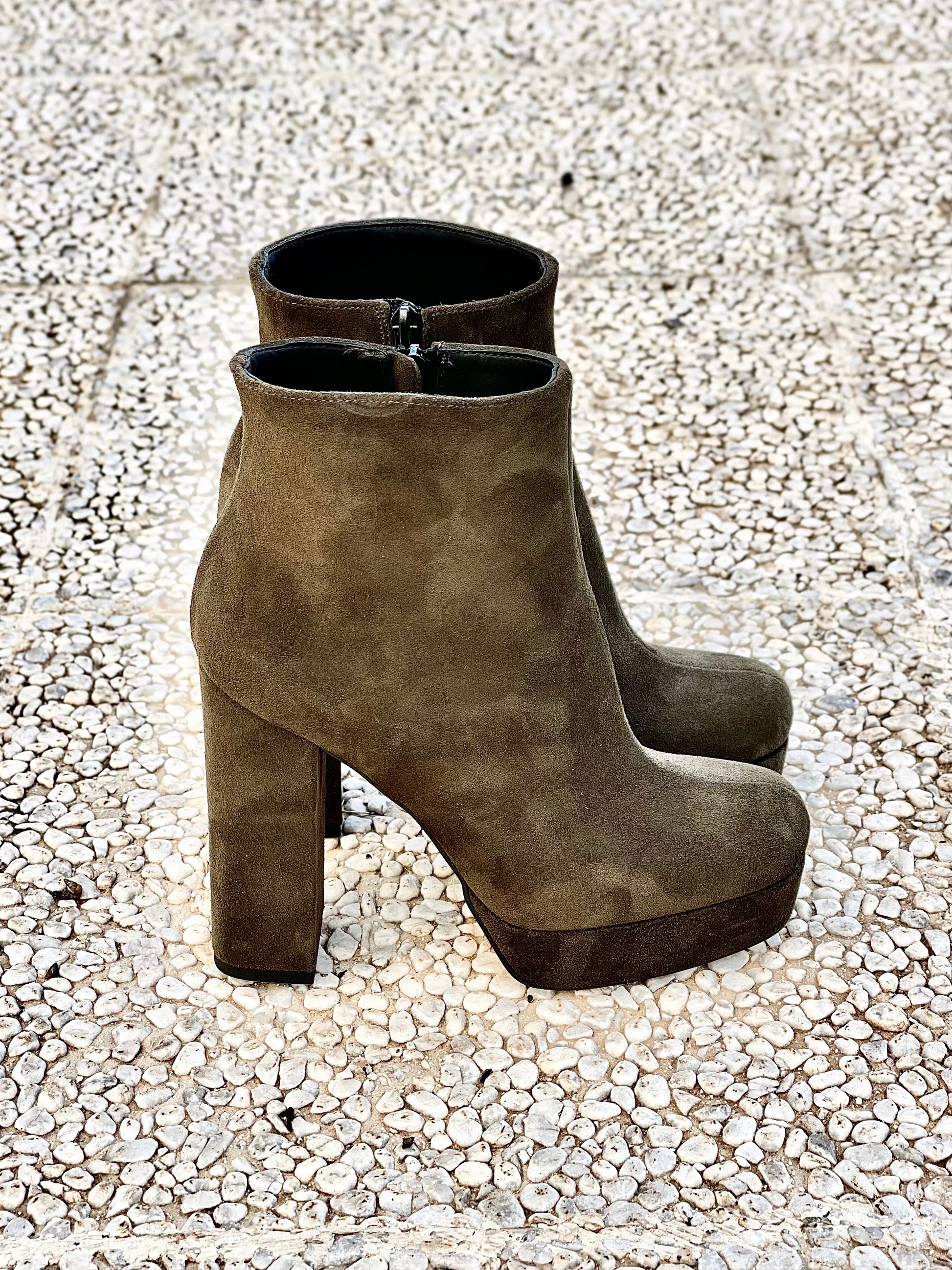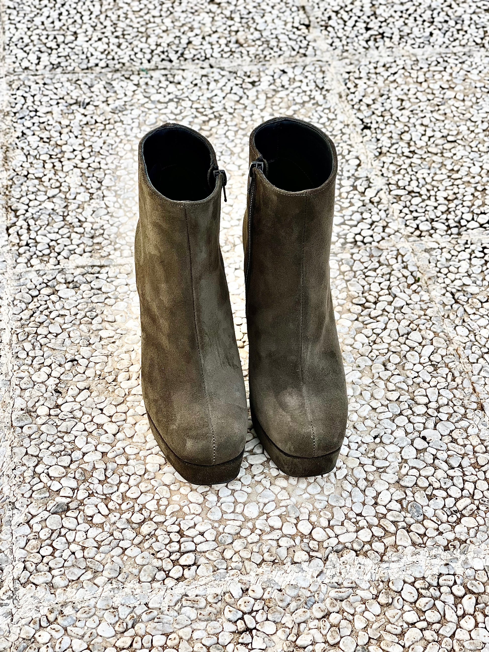 Μποτάκια με ημικυκλική μύτη από σουέτ, τακούνι 12 cm και πλατφόρμα 3 cm.