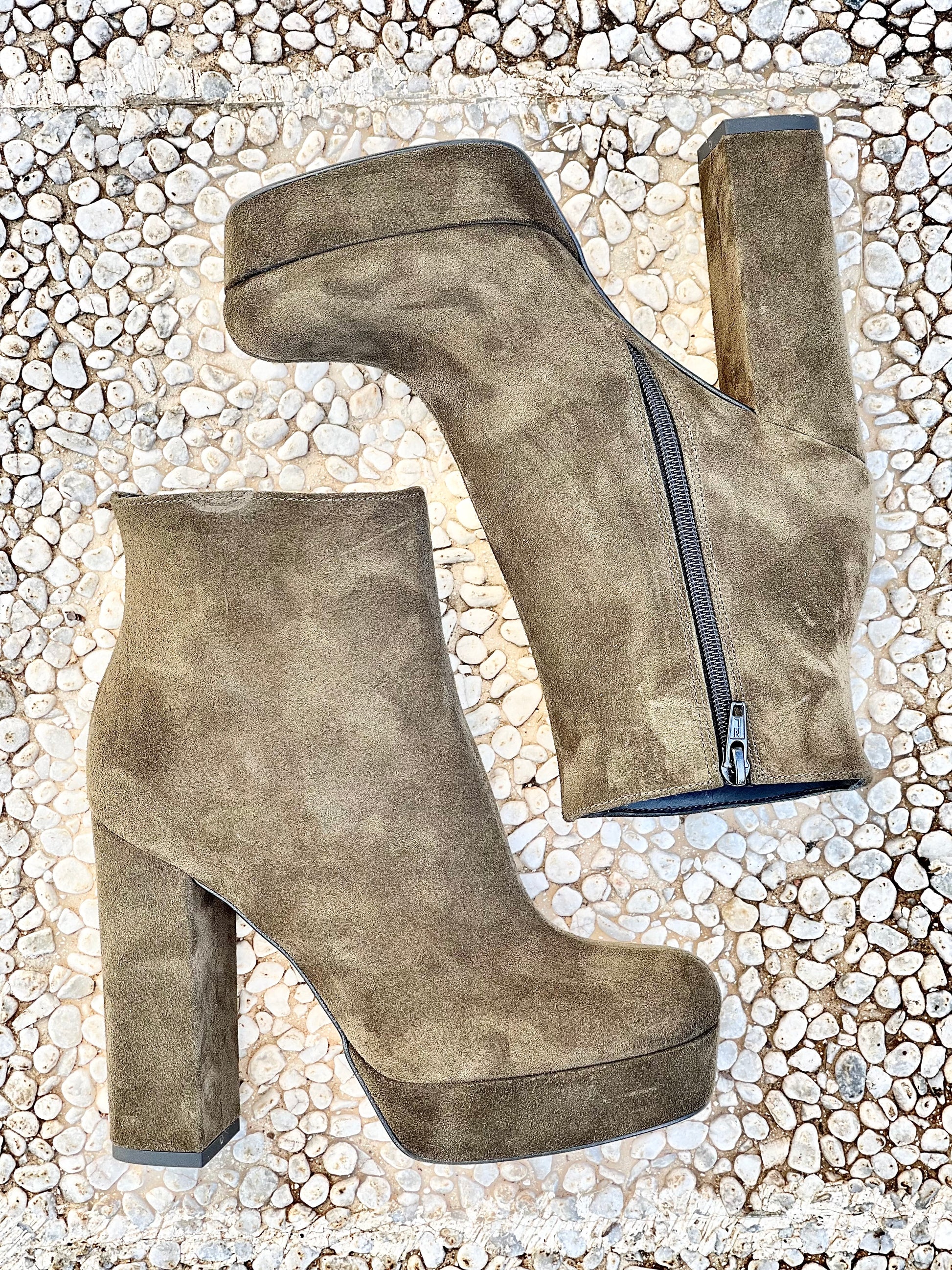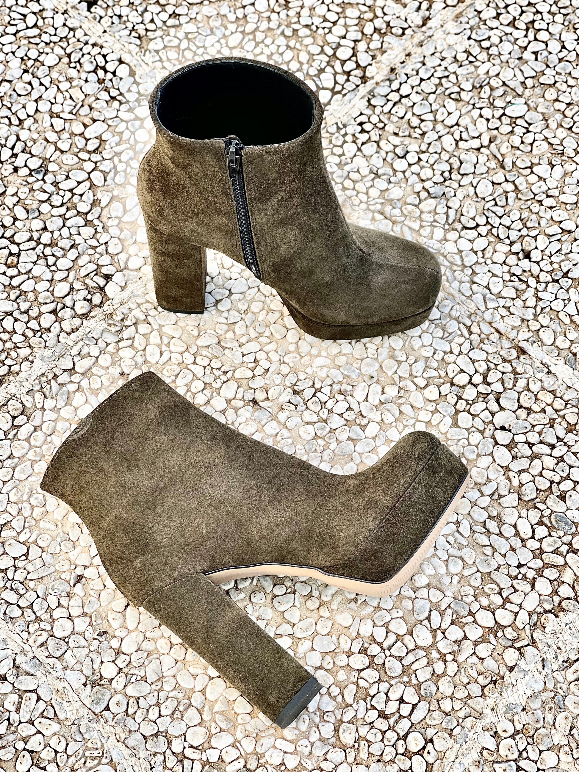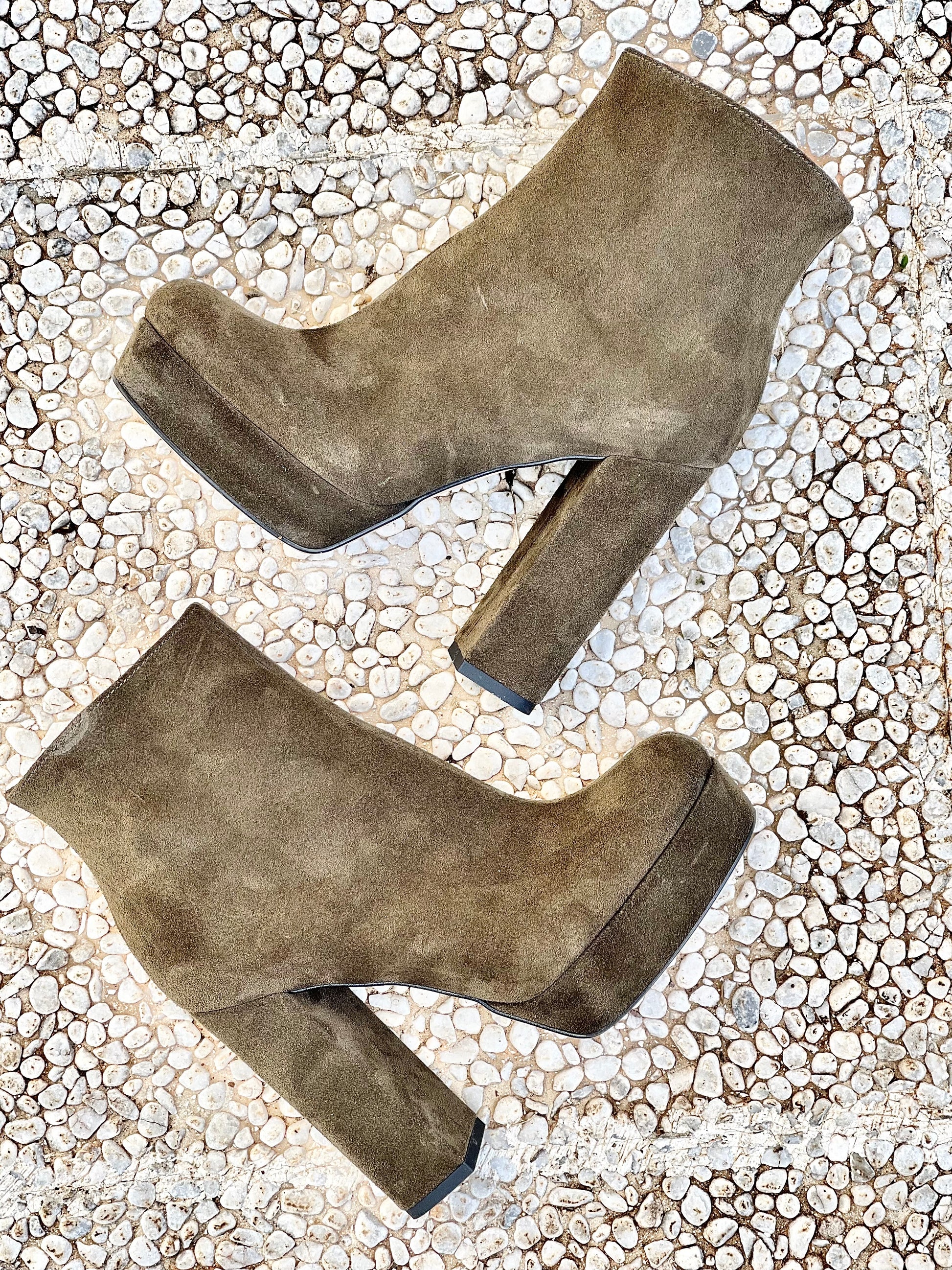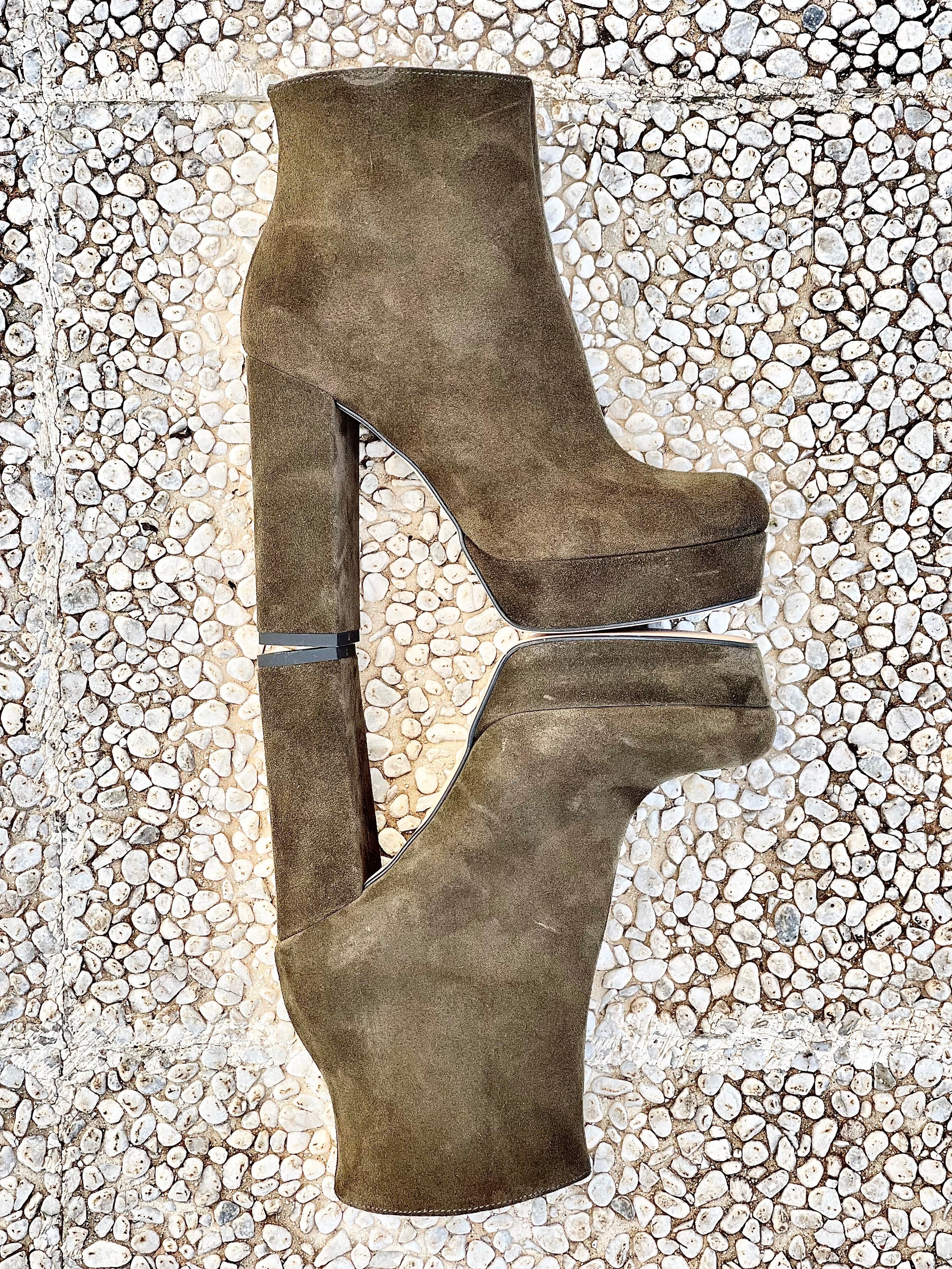 Μποτάκια με ημικυκλική μύτη από σουέτ, τακούνι 12 cm και πλατφόρμα 3 cm.