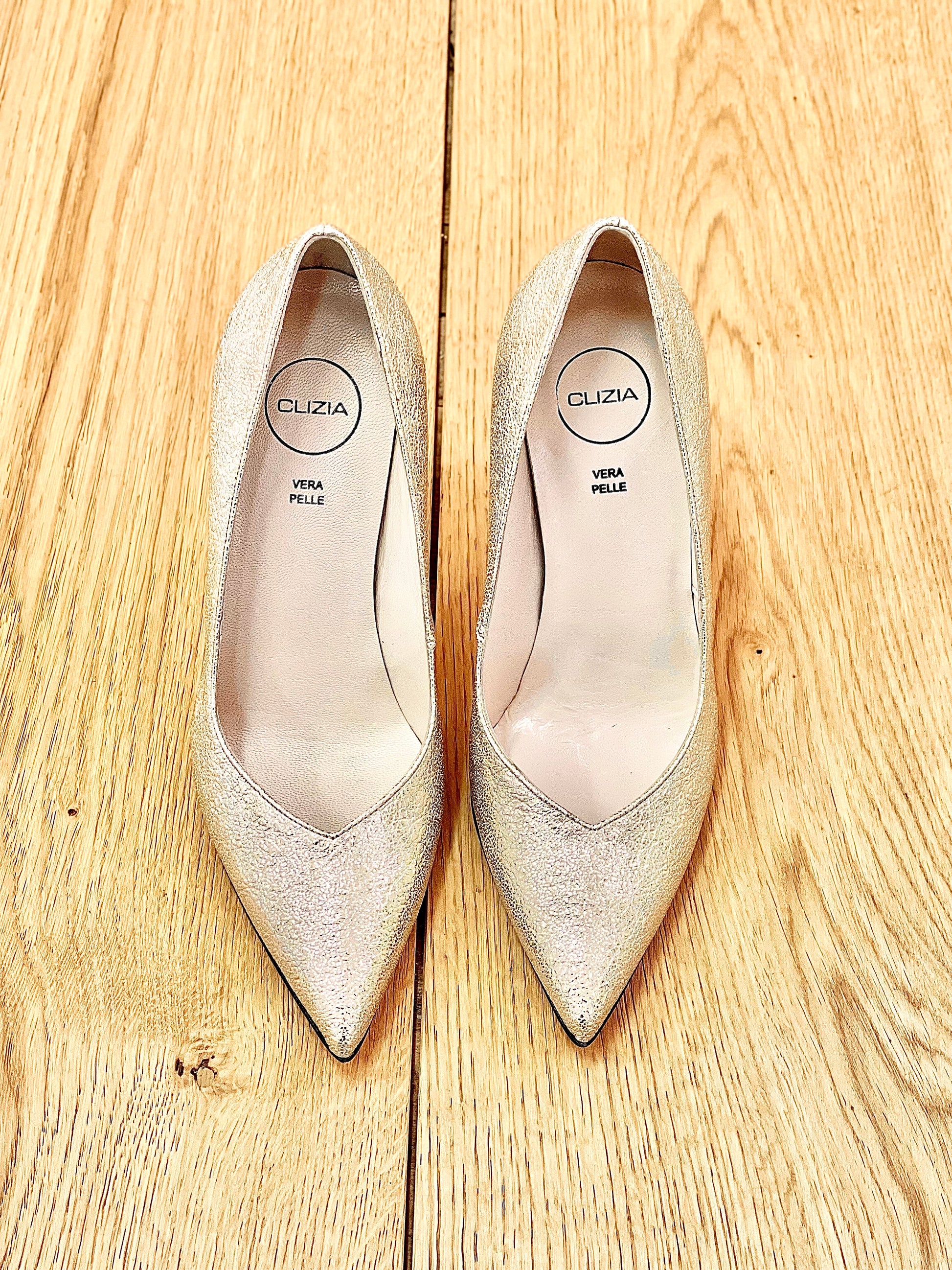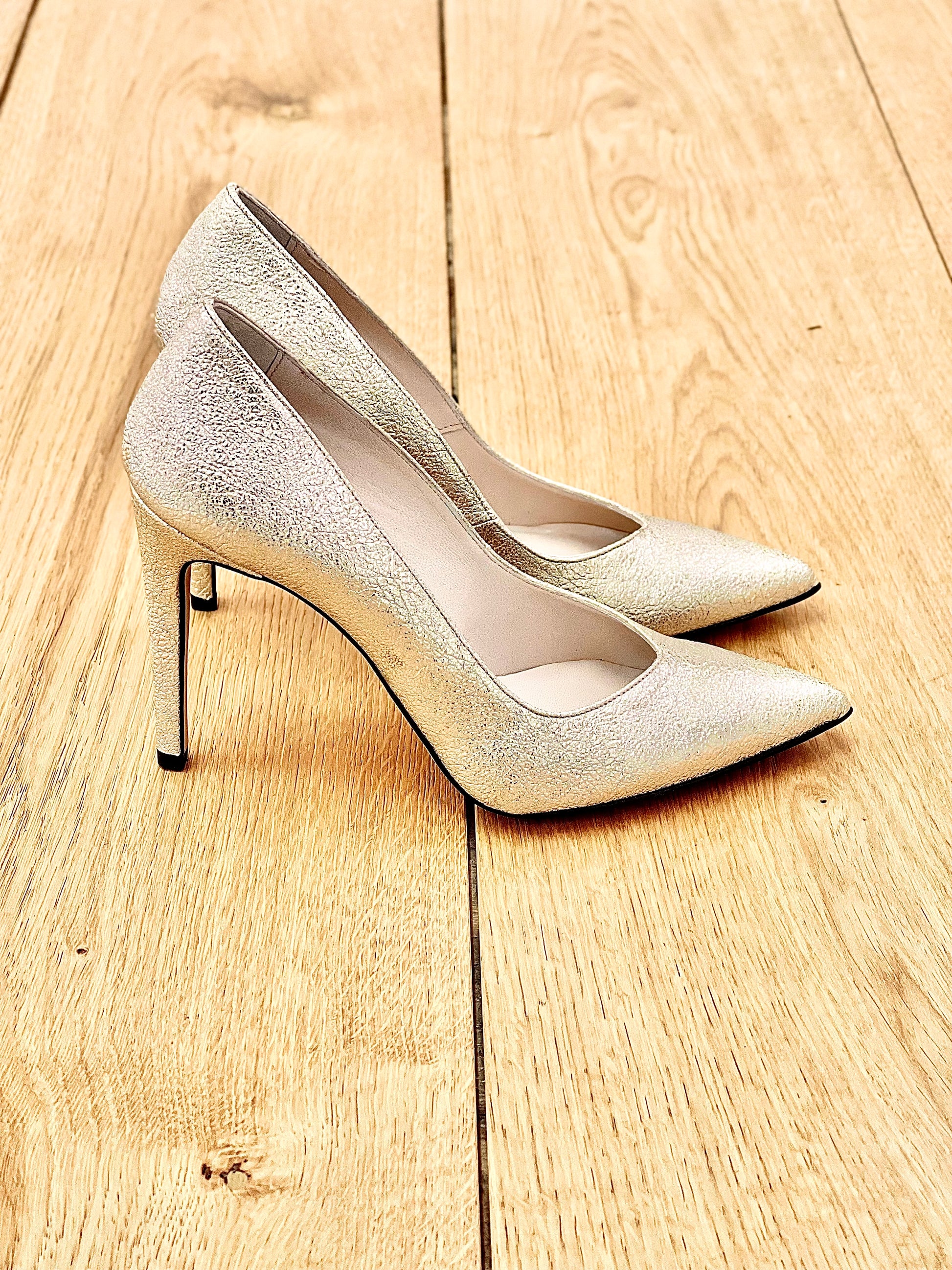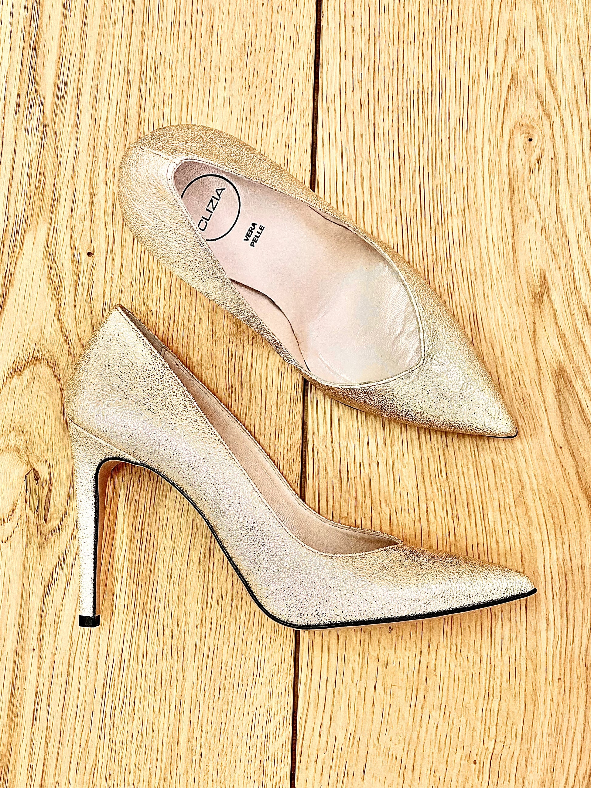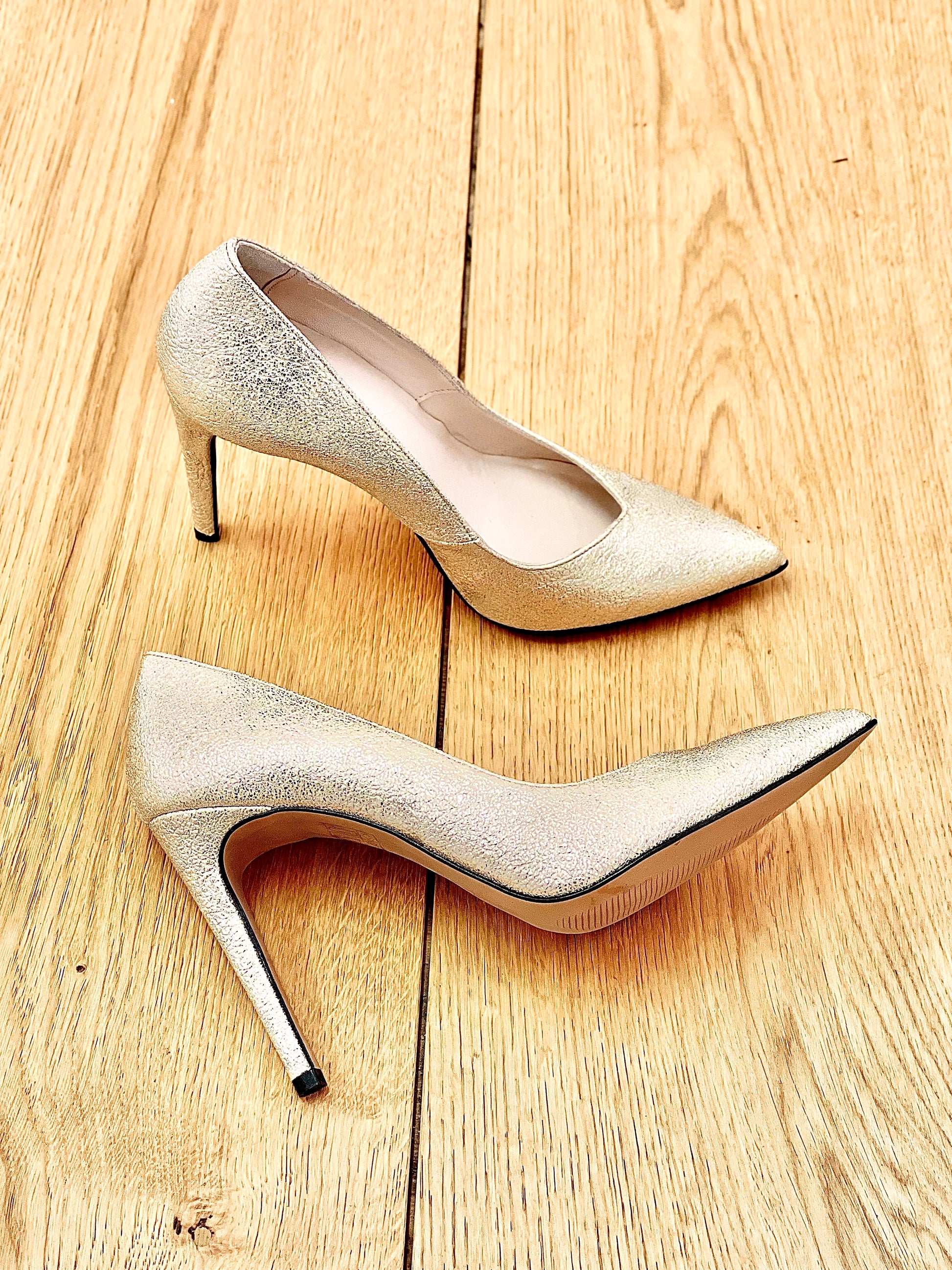 Γόβες με μυτερή μύτη, V λαιμόκοψη, από λαμινέ και τακούνι στιλέτο.