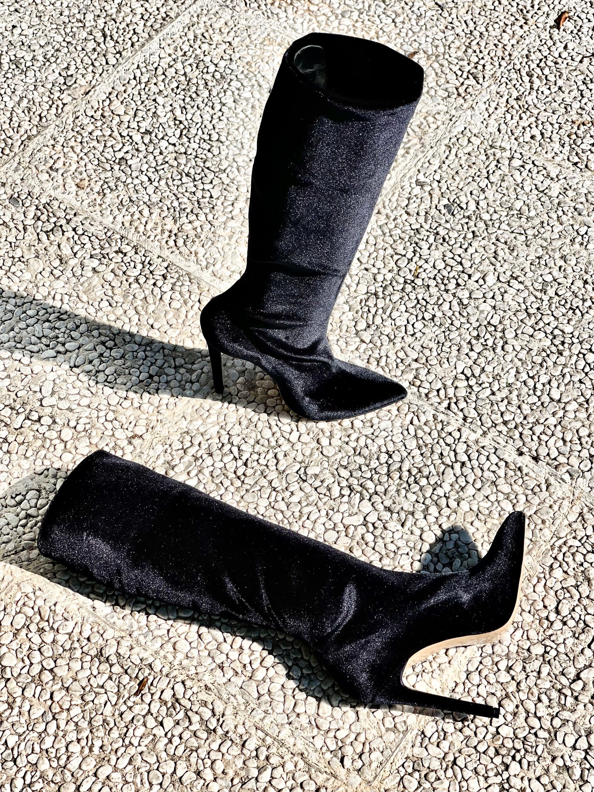 Ελαστική μπότα με στρογγυλή μύτη από βελούδο και ψηλό τακούνι.