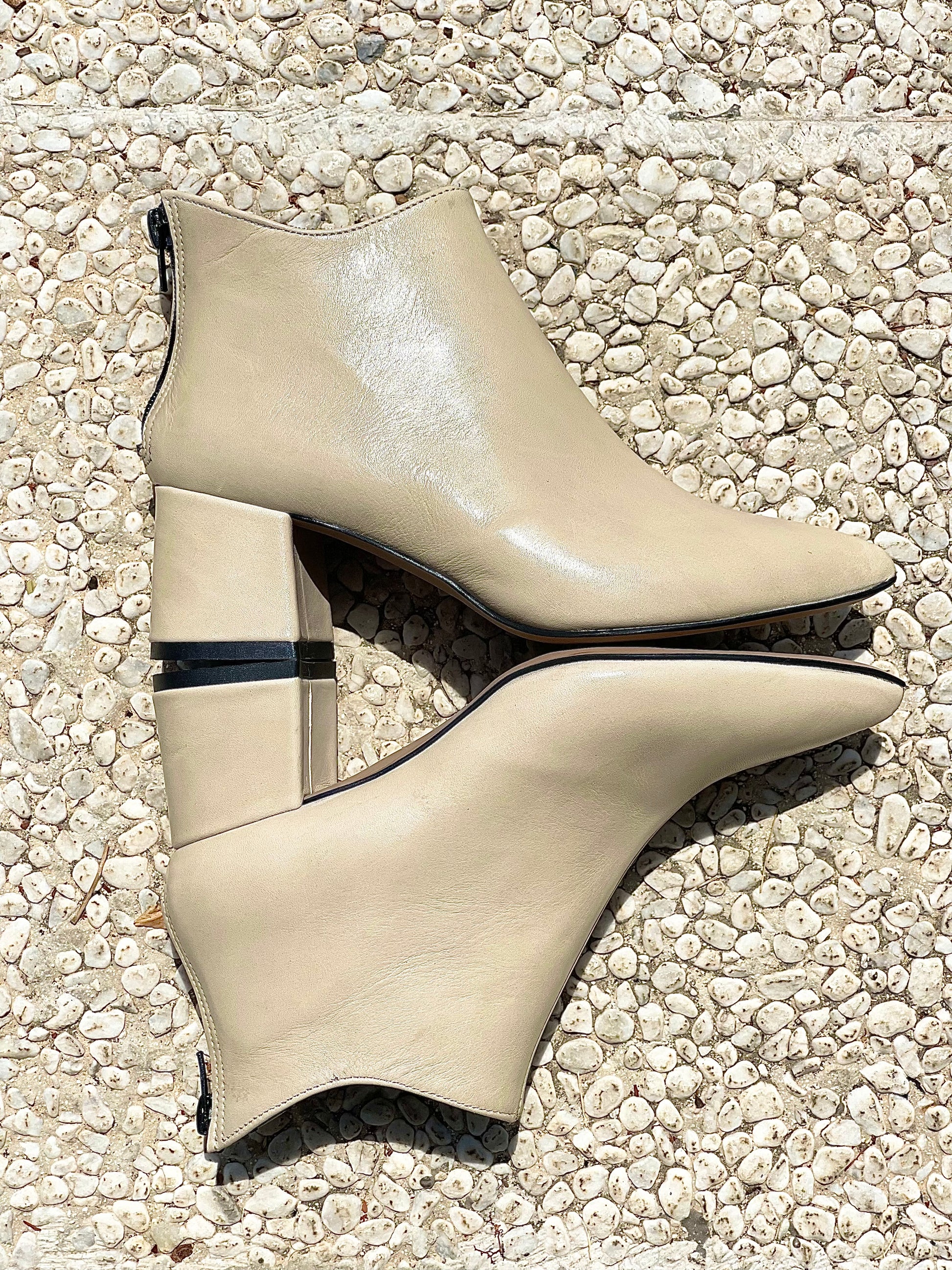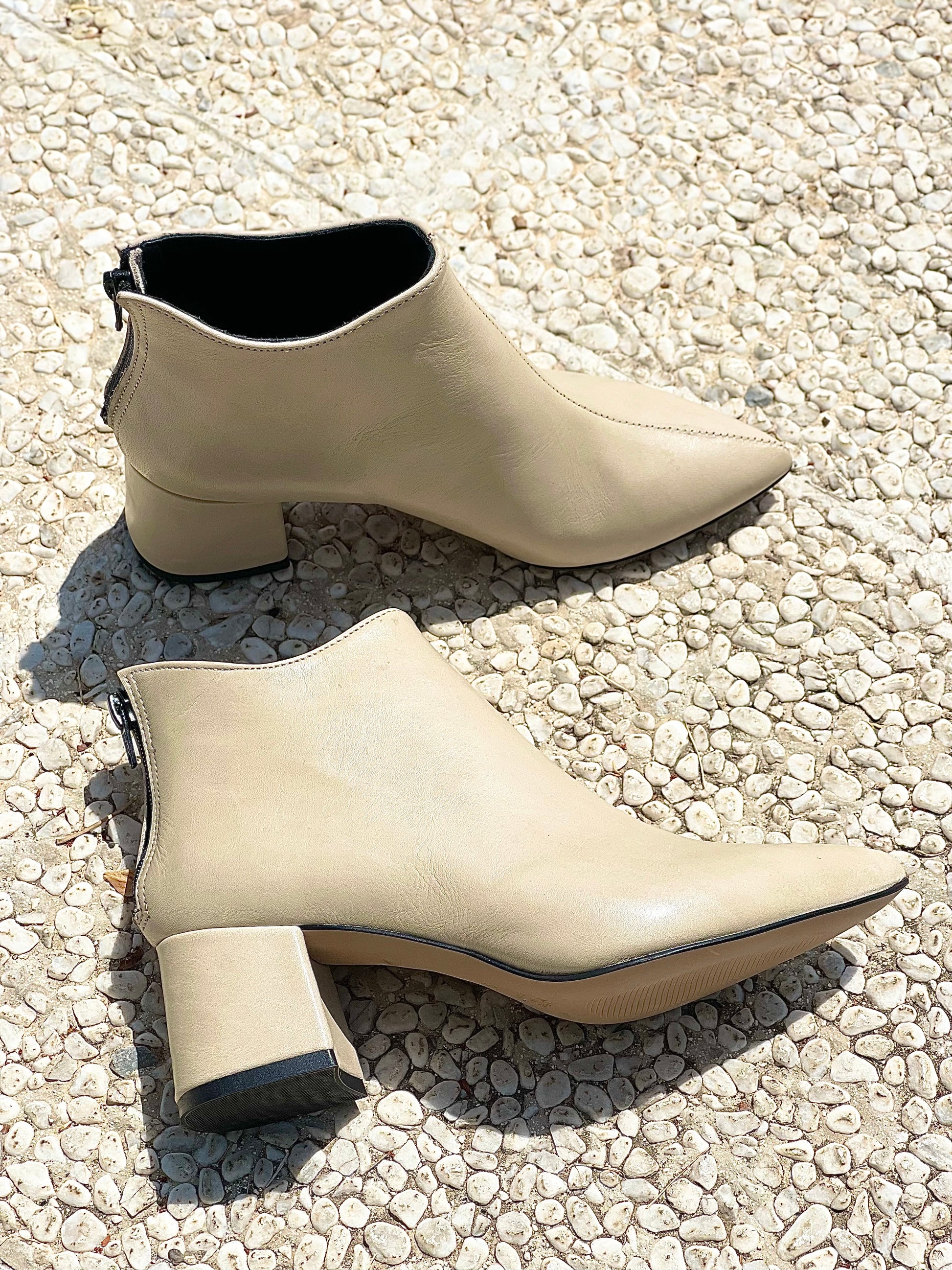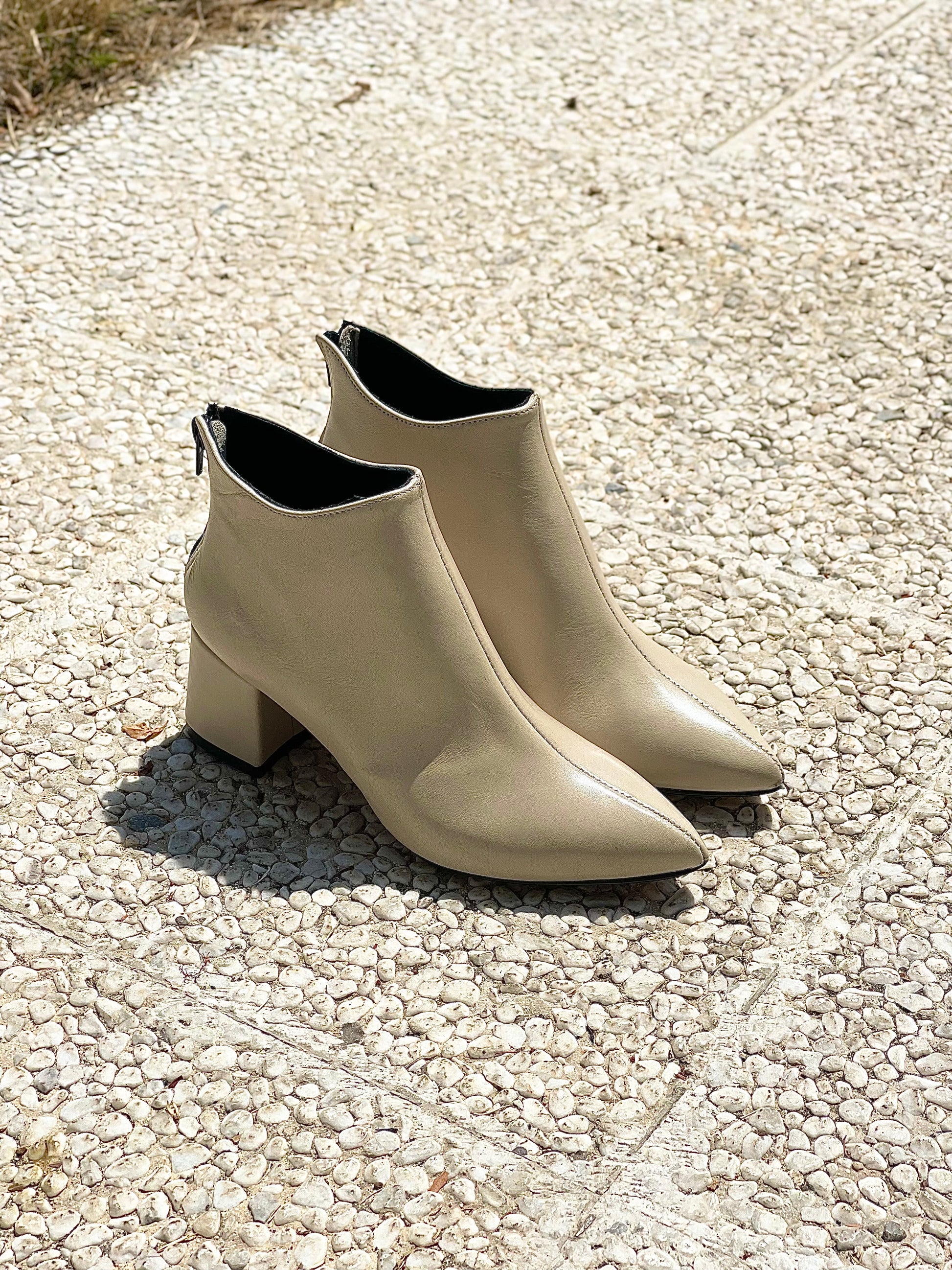 Μποτάκι με στρογγυλή μύτη από δέρμα με φερμουάρ στο πίσω μέρος και φαρδύ τακούνι.