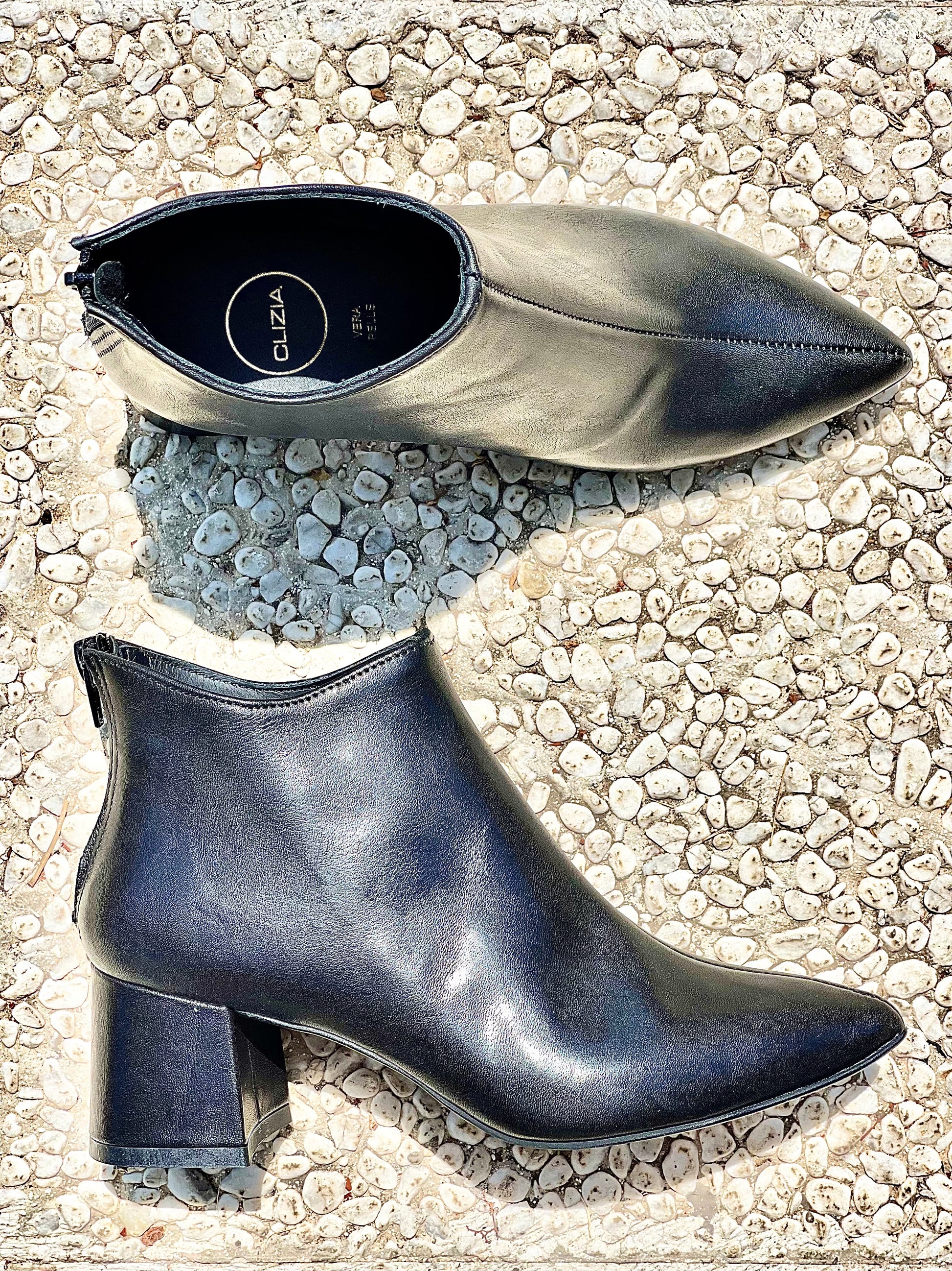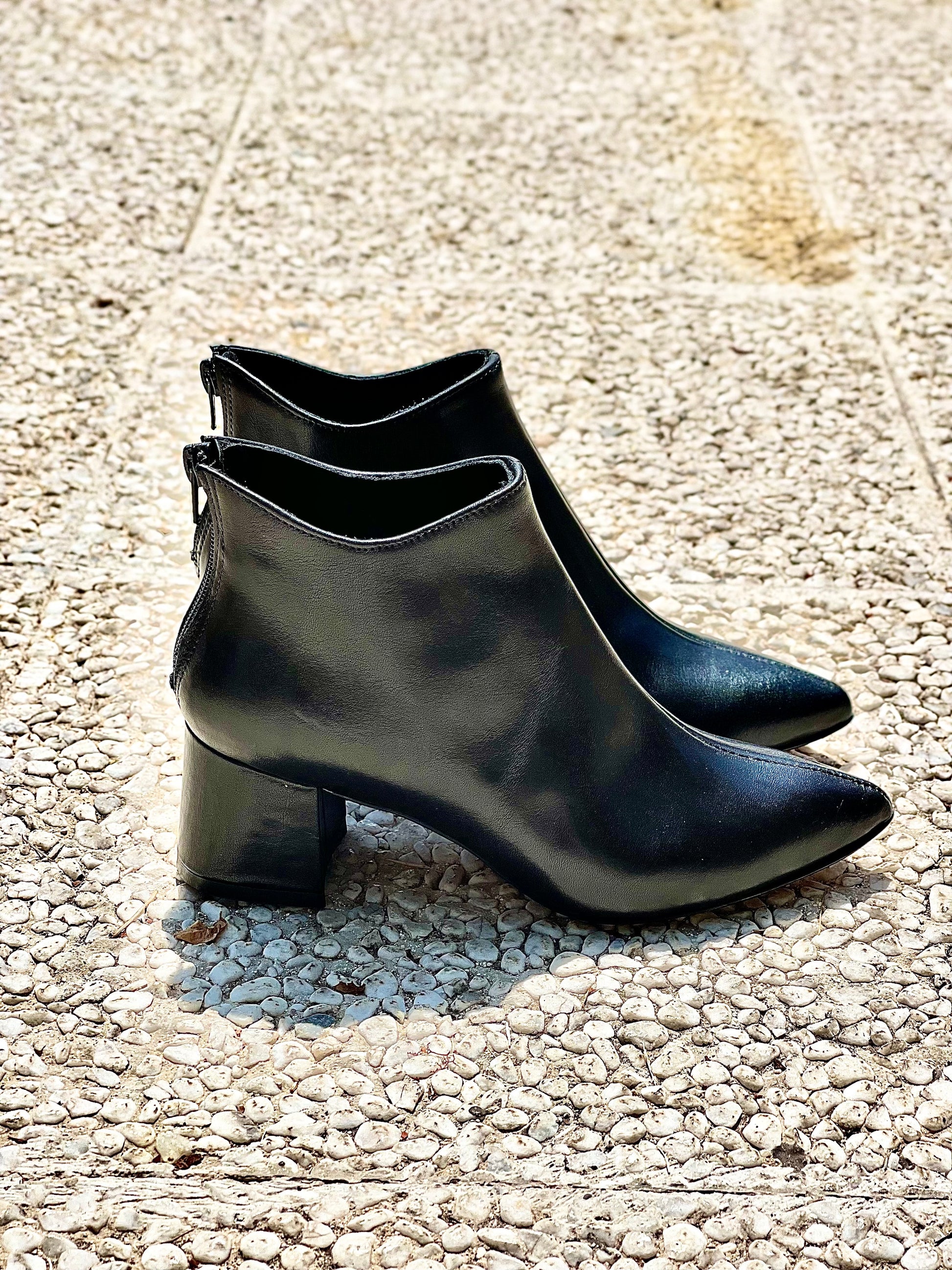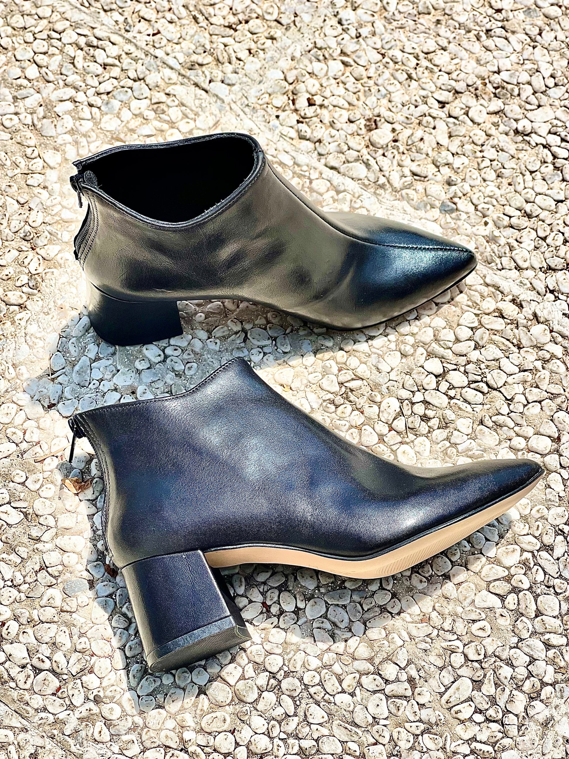 Μποτάκι με στρογγυλή μύτη από δέρμα με φερμουάρ στο πίσω μέρος και φαρδύ τακούνι.