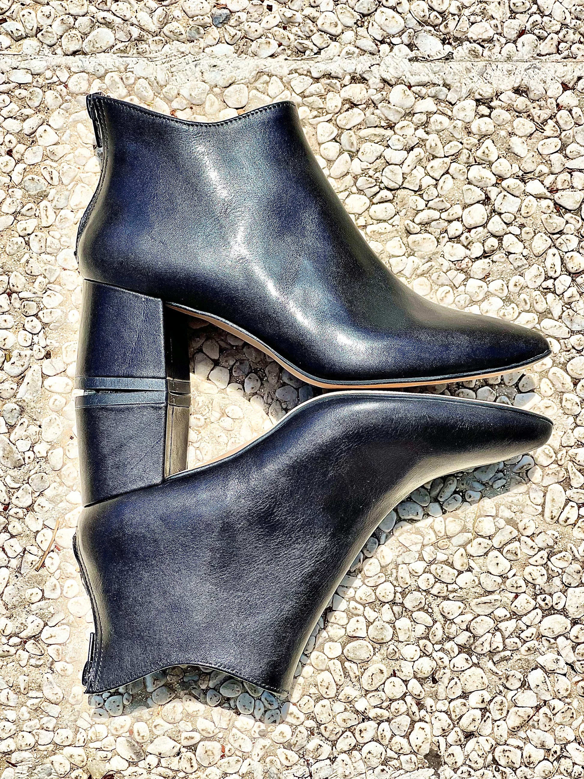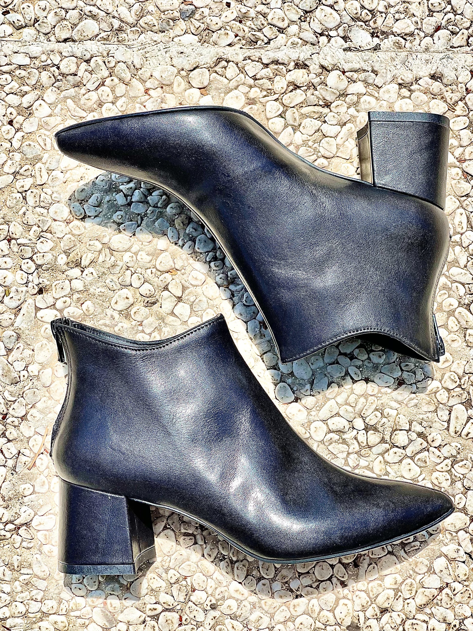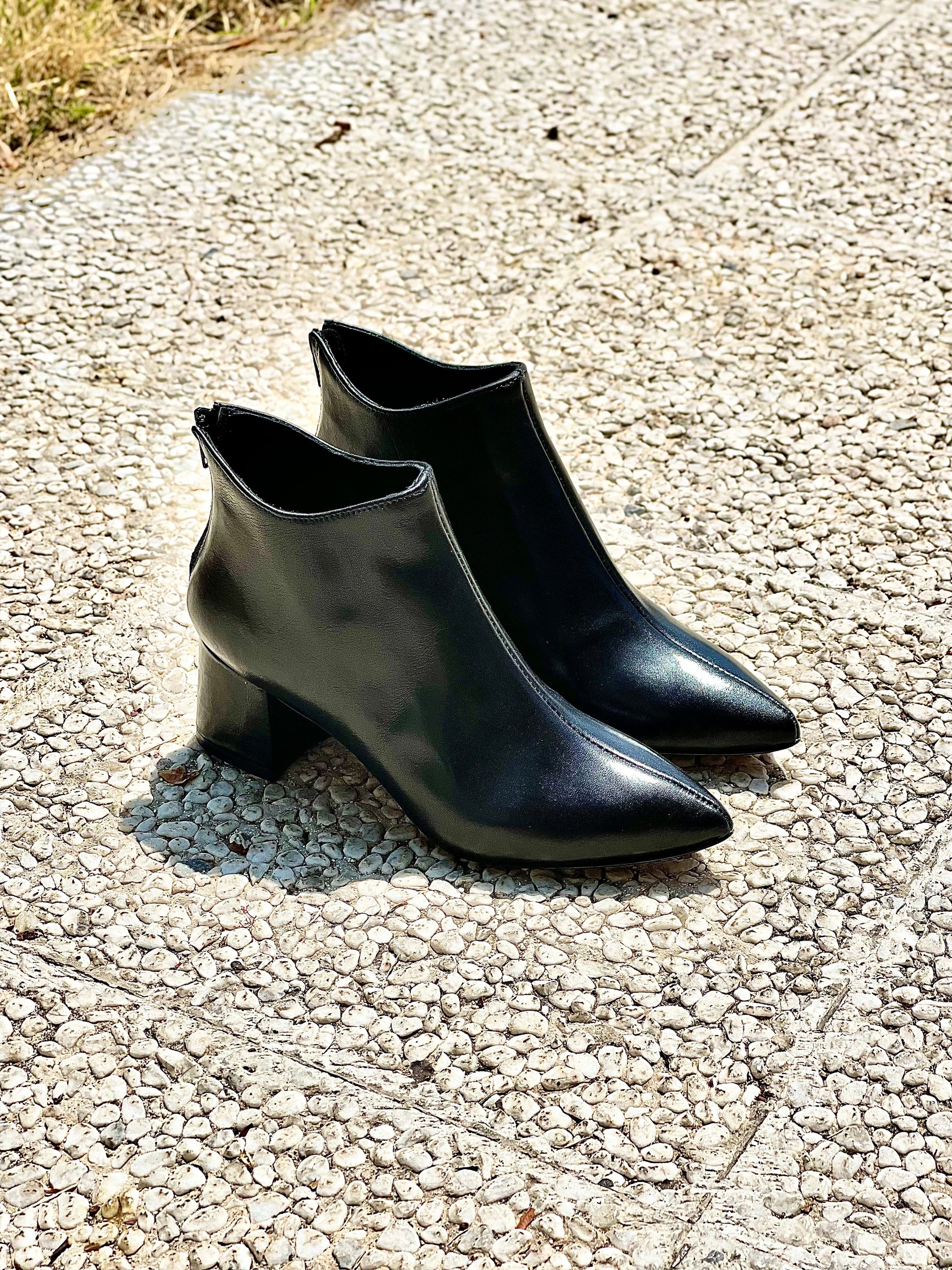 Μποτάκι με στρογγυλή μύτη από δέρμα με φερμουάρ στο πίσω μέρος και φαρδύ τακούνι.