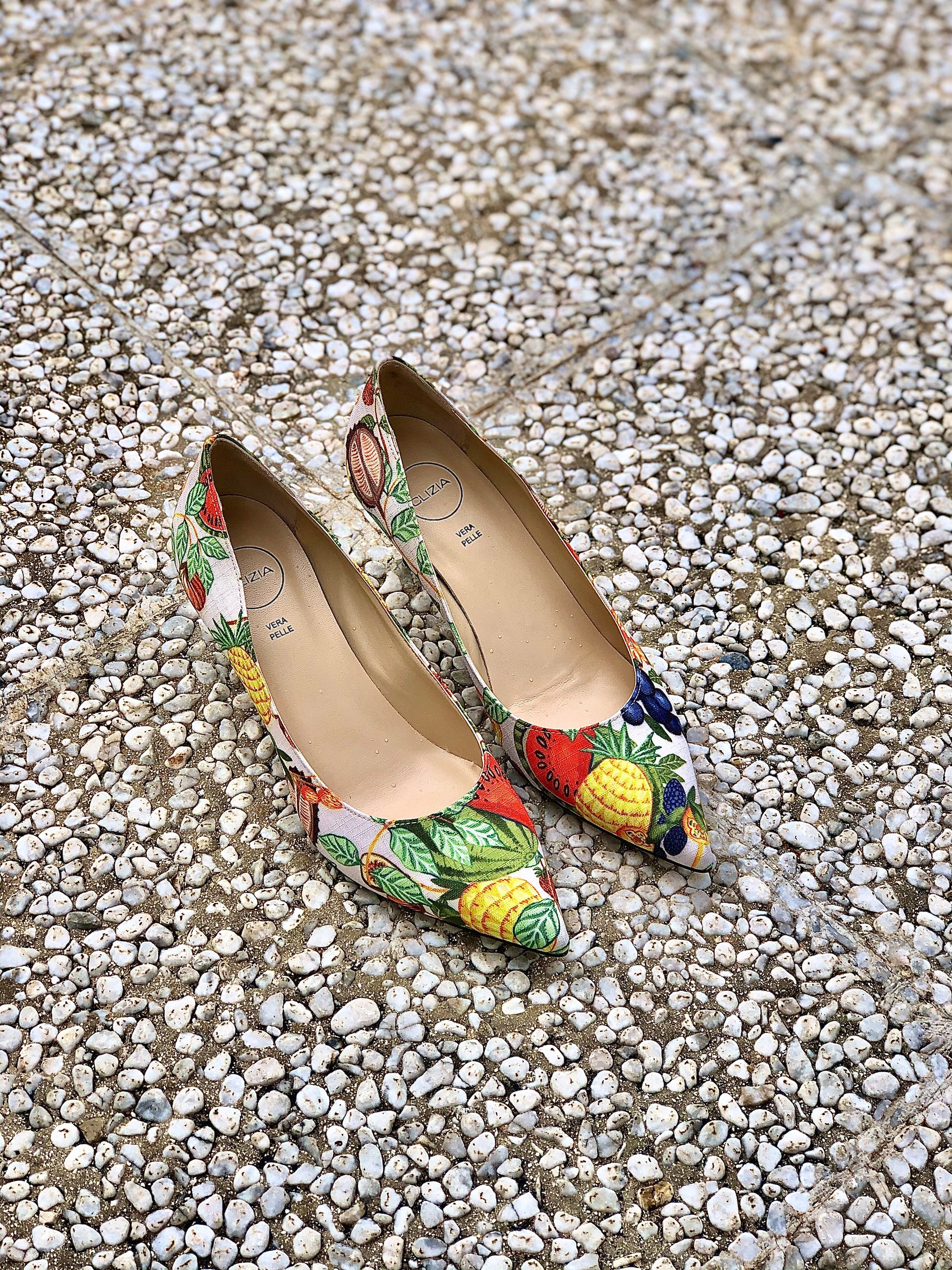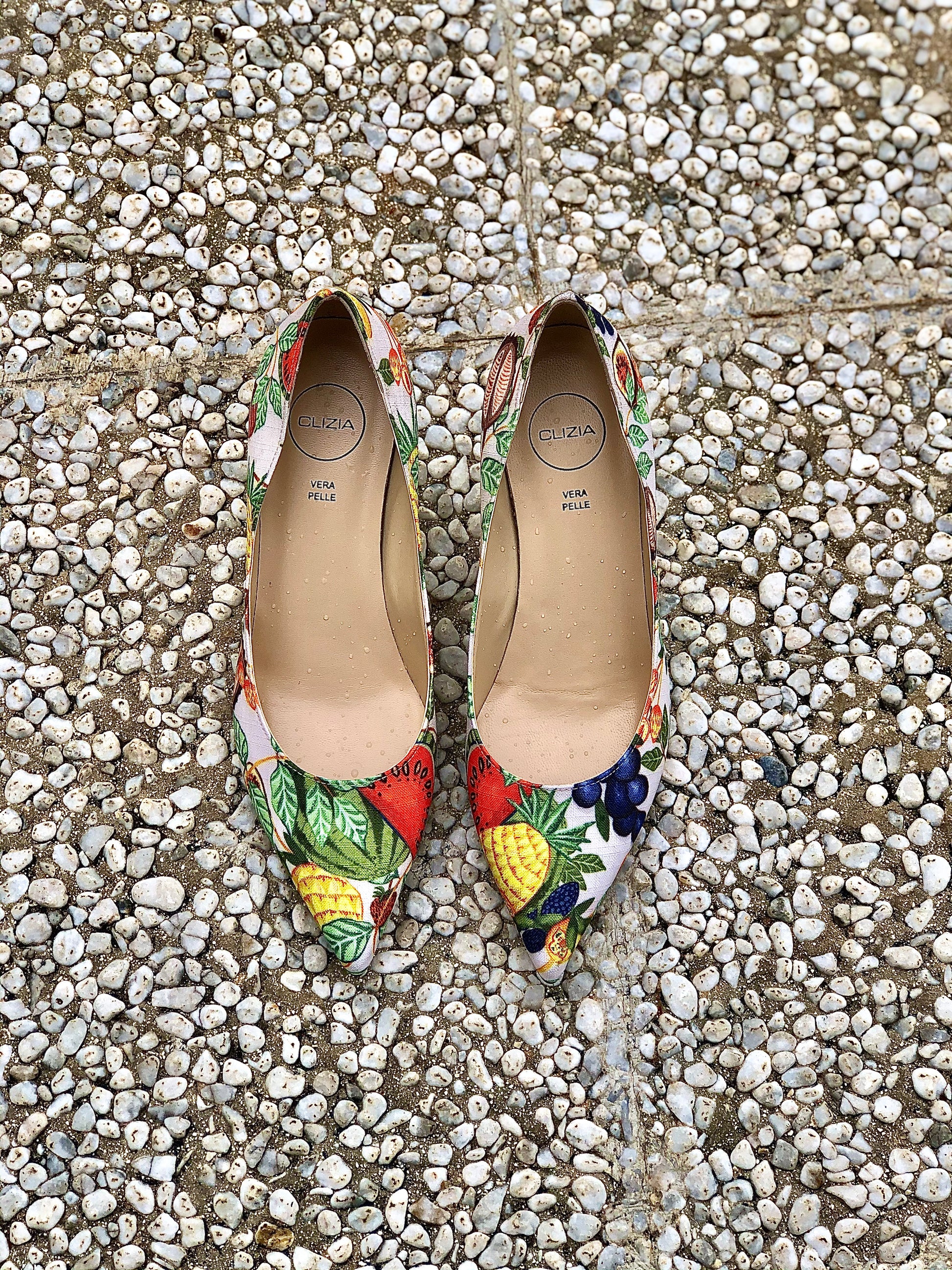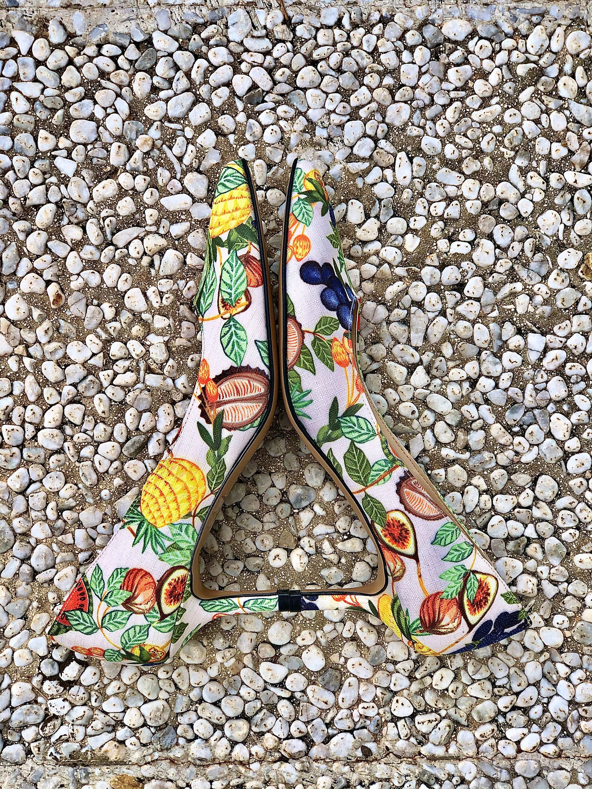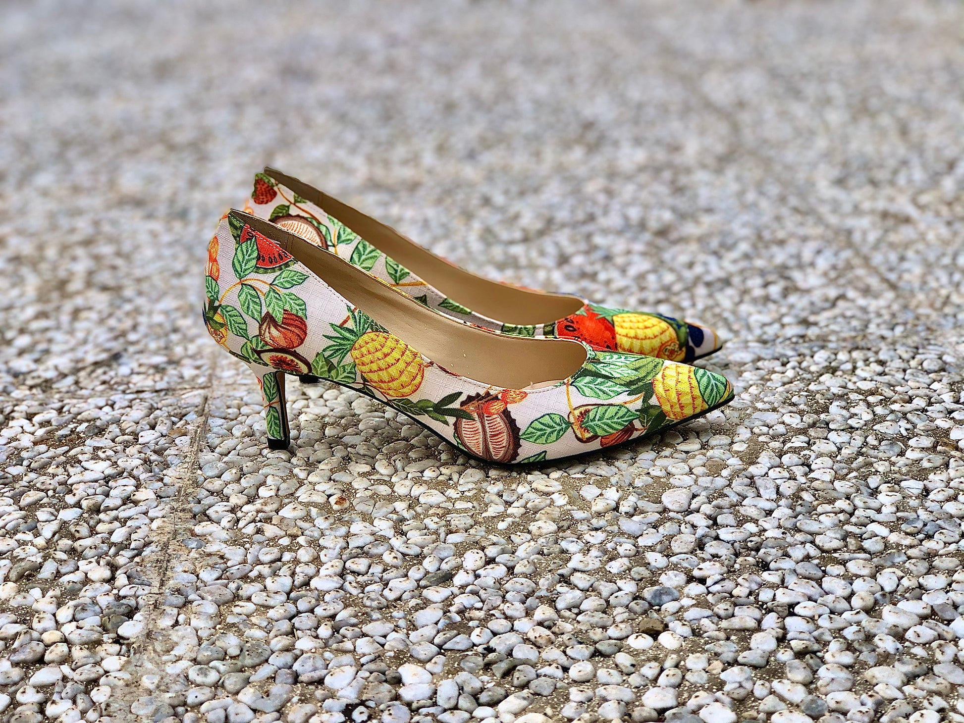 Ανοιχτά γόβα με στρογγυλή μύτη από ύφασμα fruit και τακούνι 6 εκ.