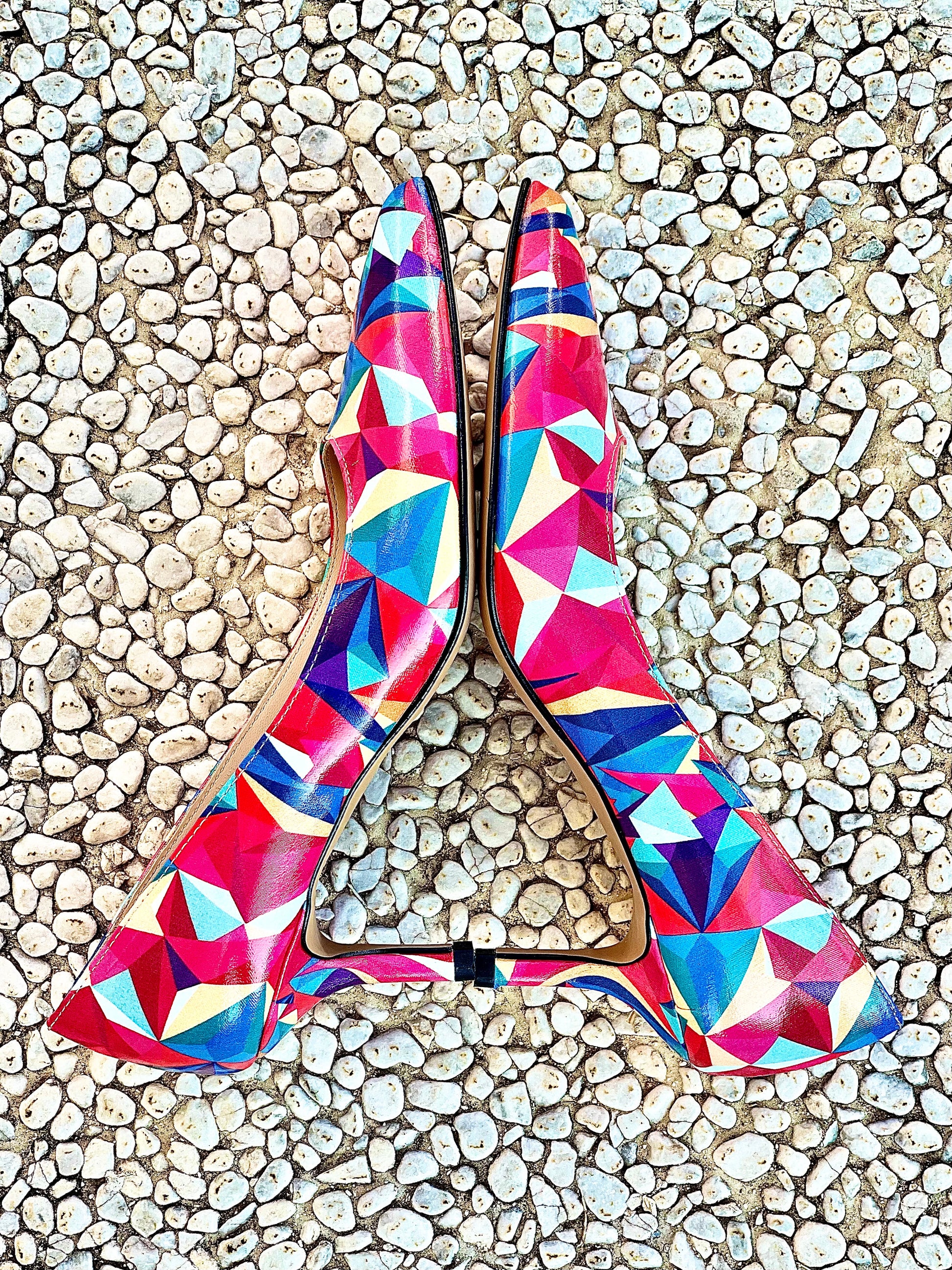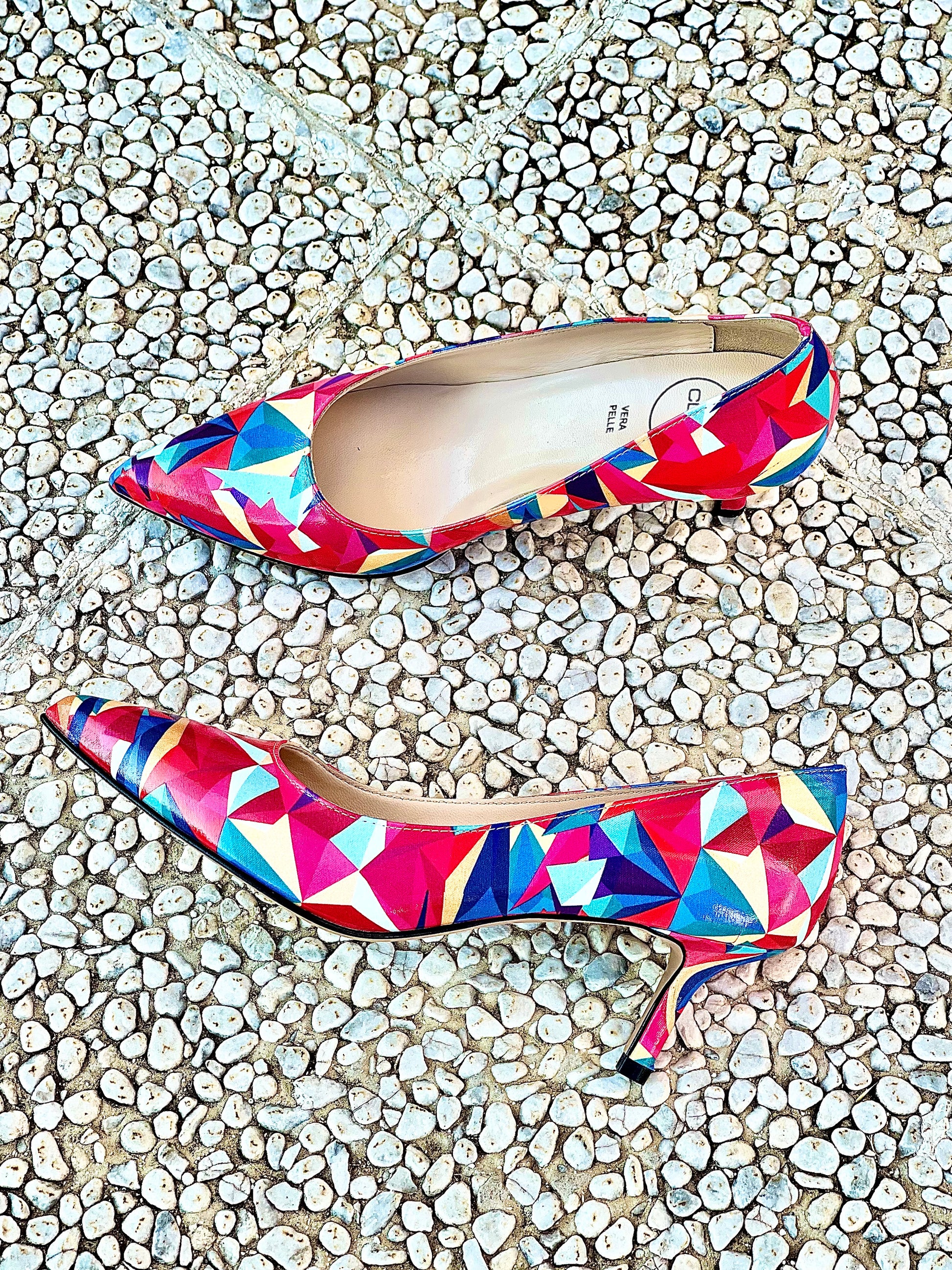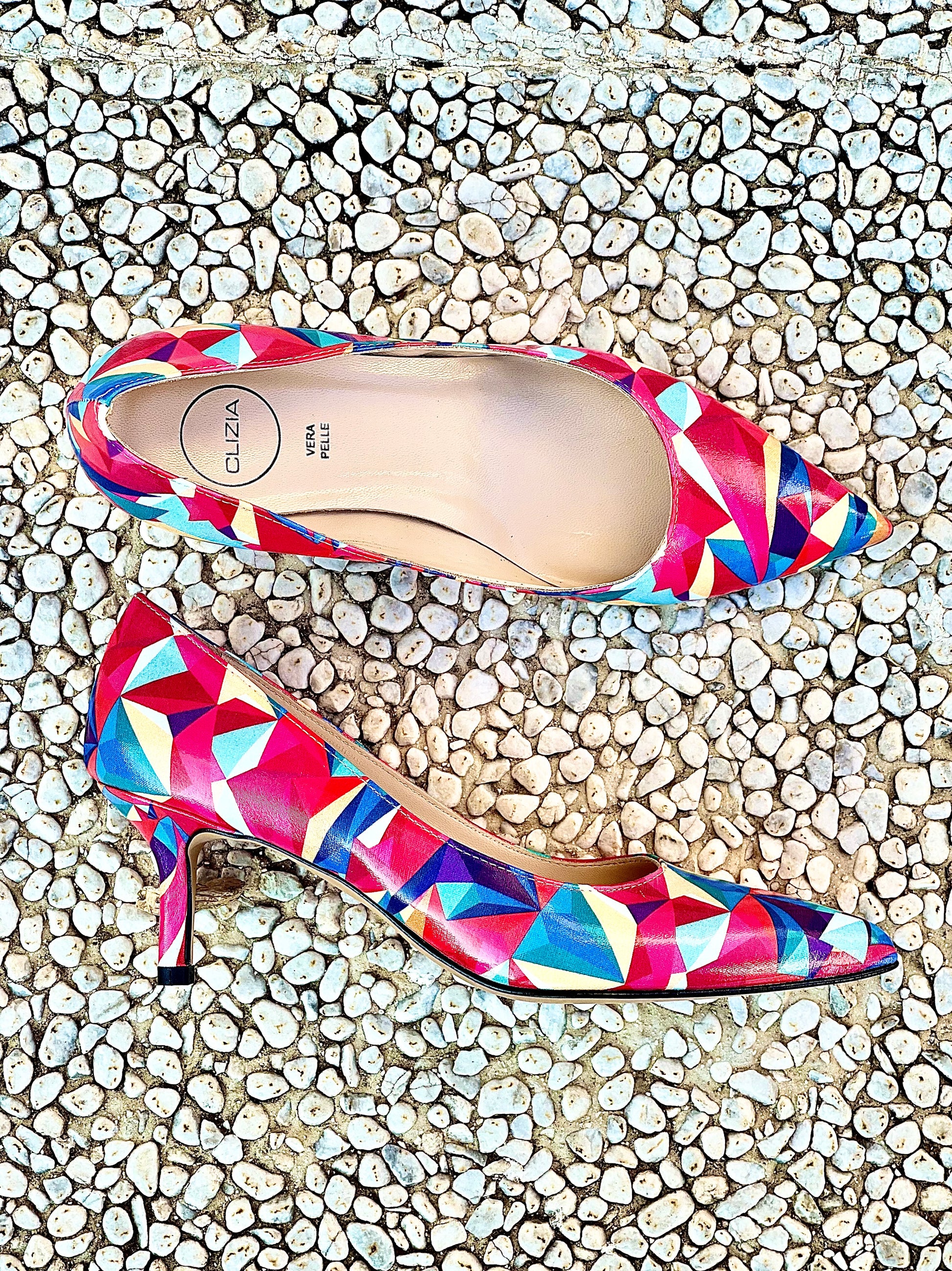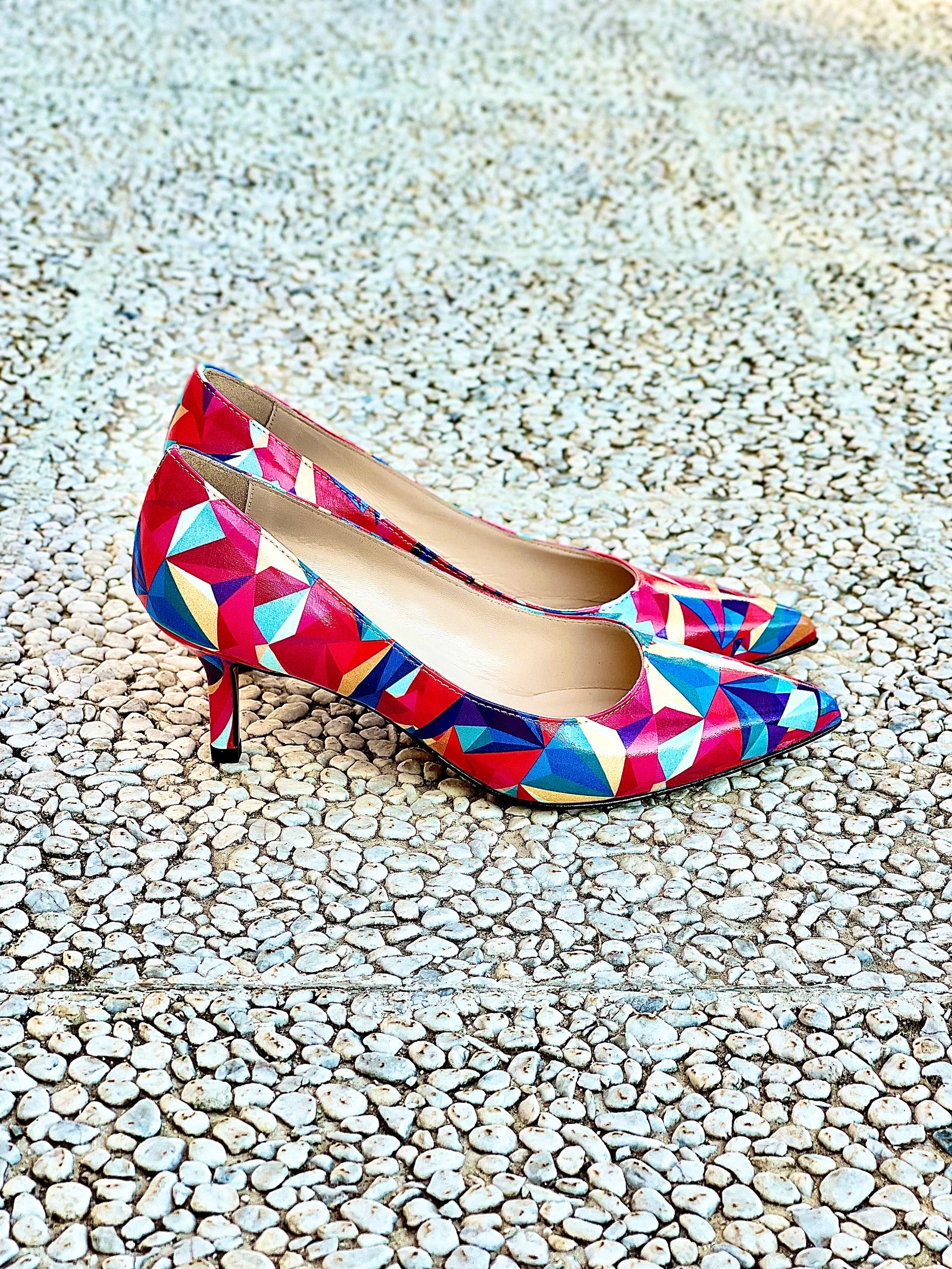 Γόβες με μυτερή μύτη από γεωμετρικό ύφασμα, τακούνι 6 εκ.