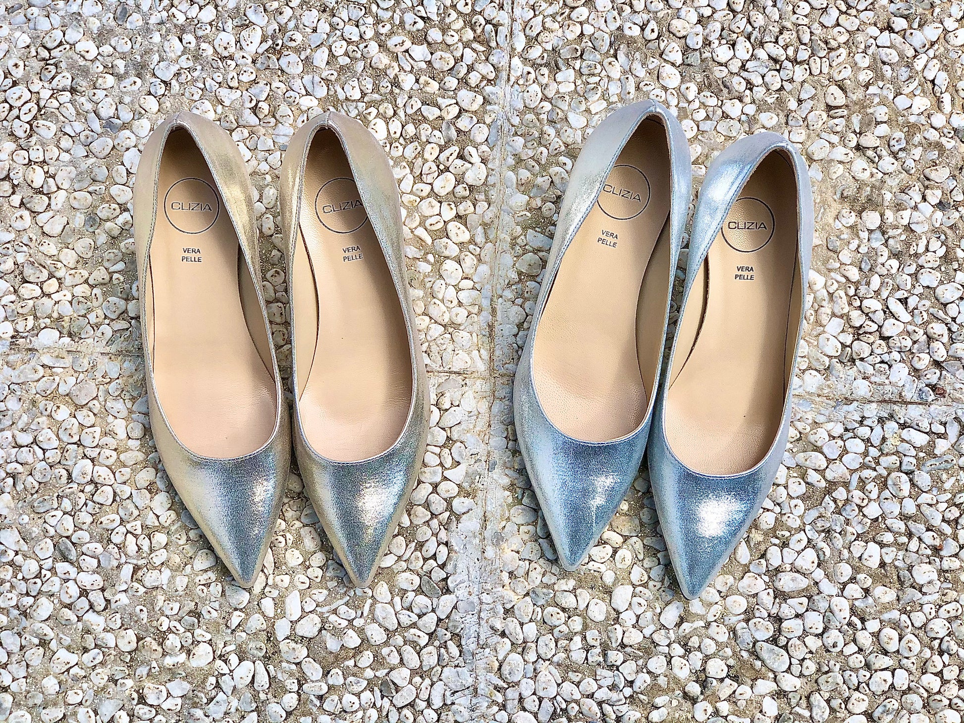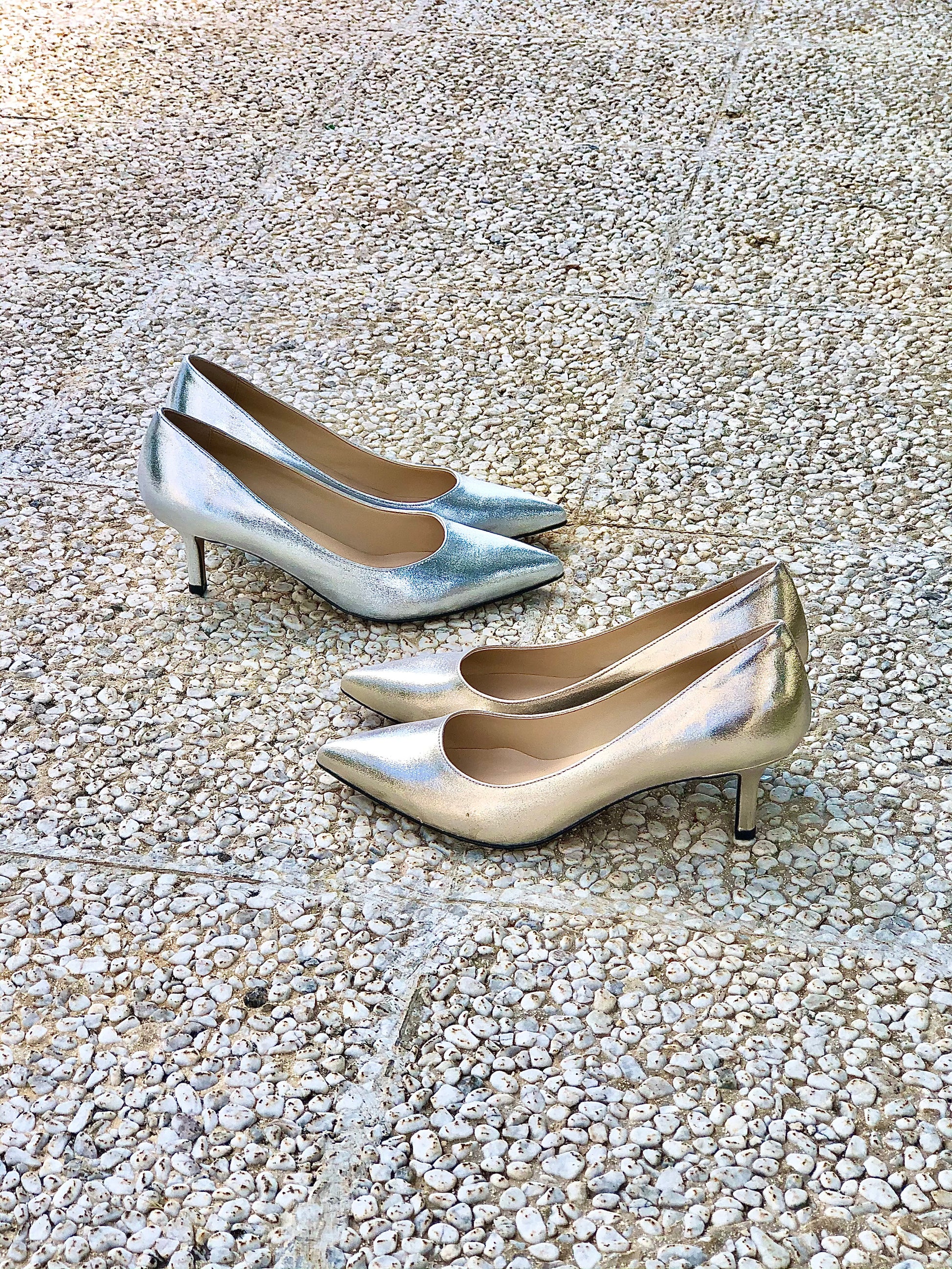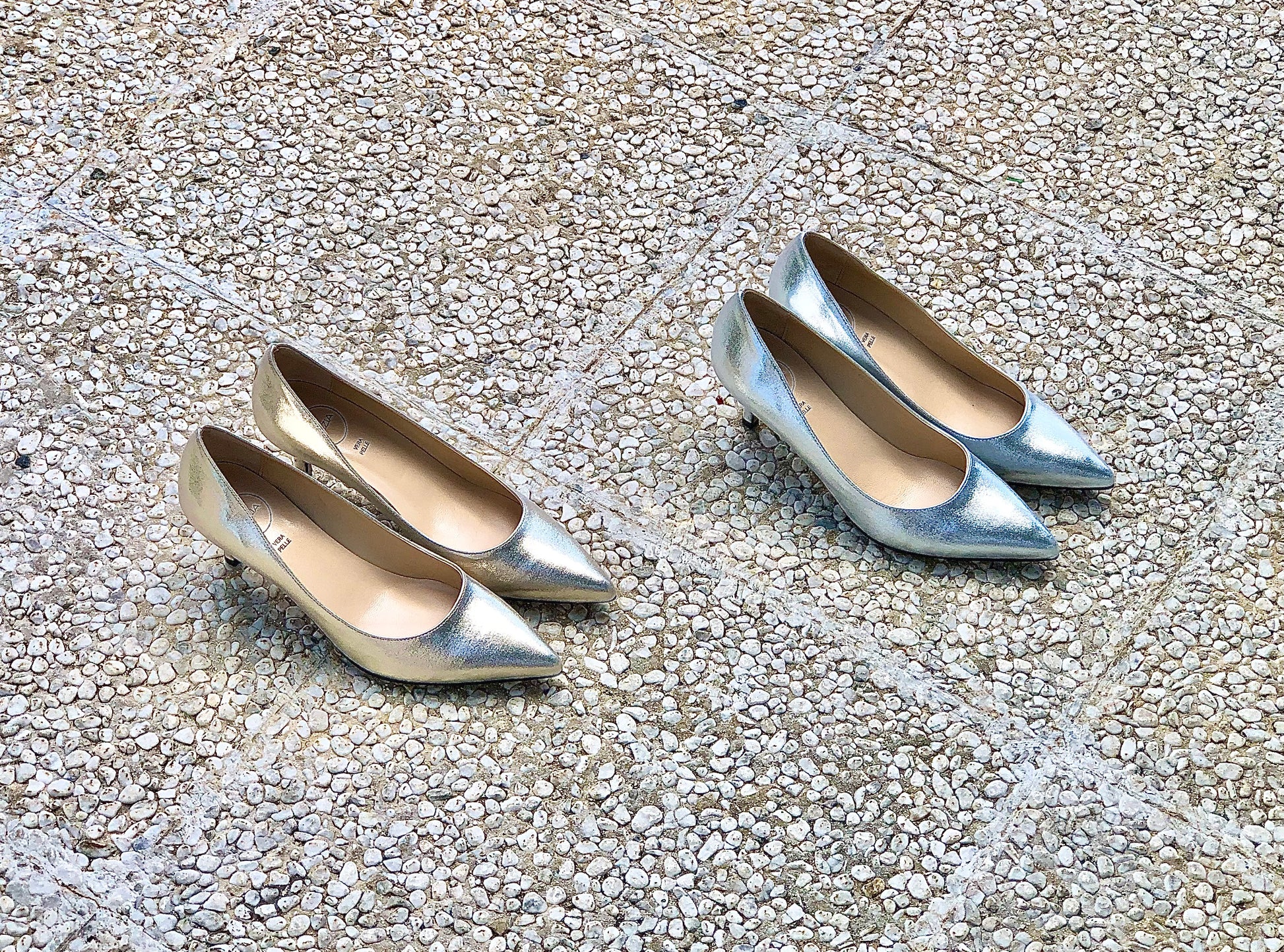 Ανοιχτά γόβα με λεπτή μύτη από πλαστικοποιημένο υλικό και τακούνι 6 εκ.