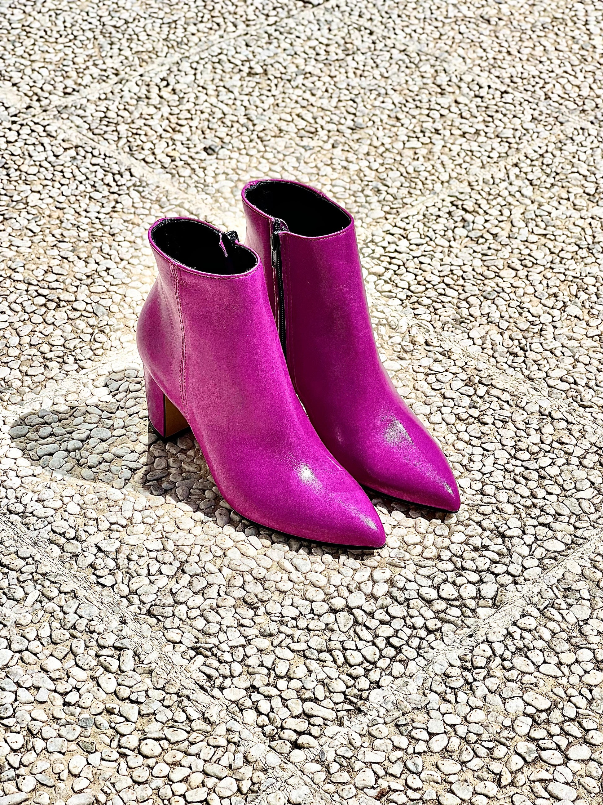 Μποτάκι με μυτερή μύτη από δέρμα και φαρδύ τακούνι 75 mm.